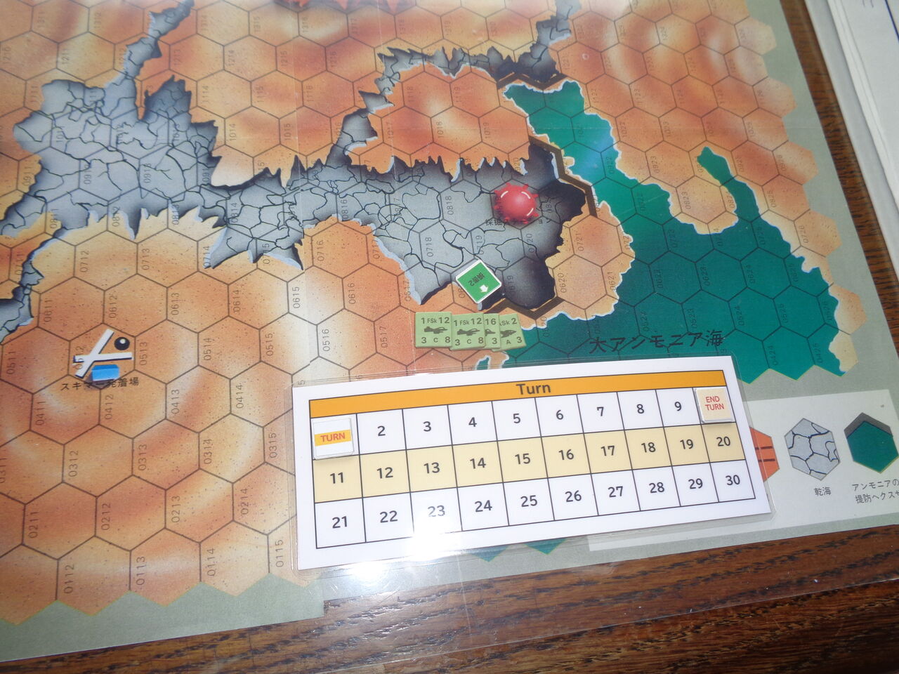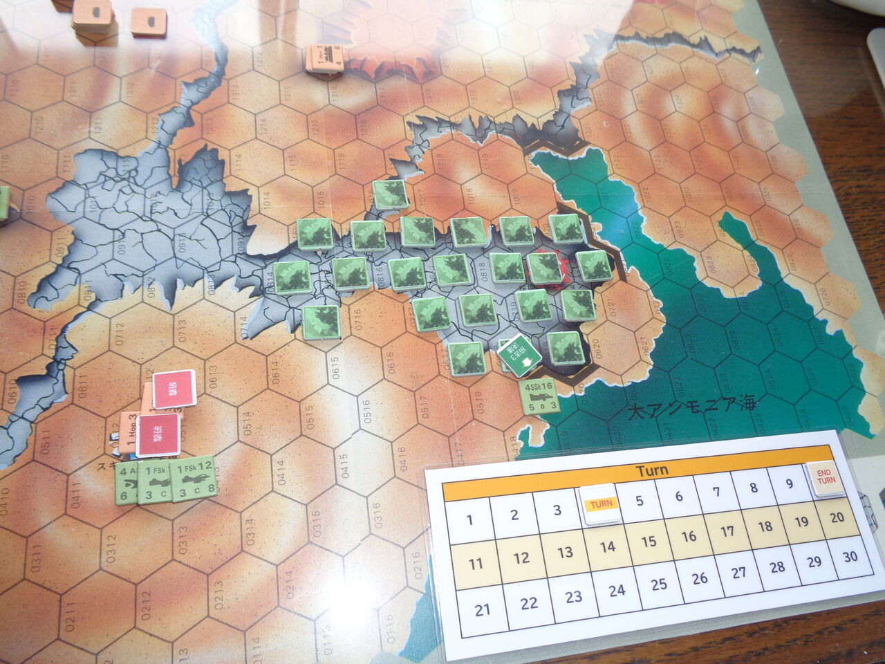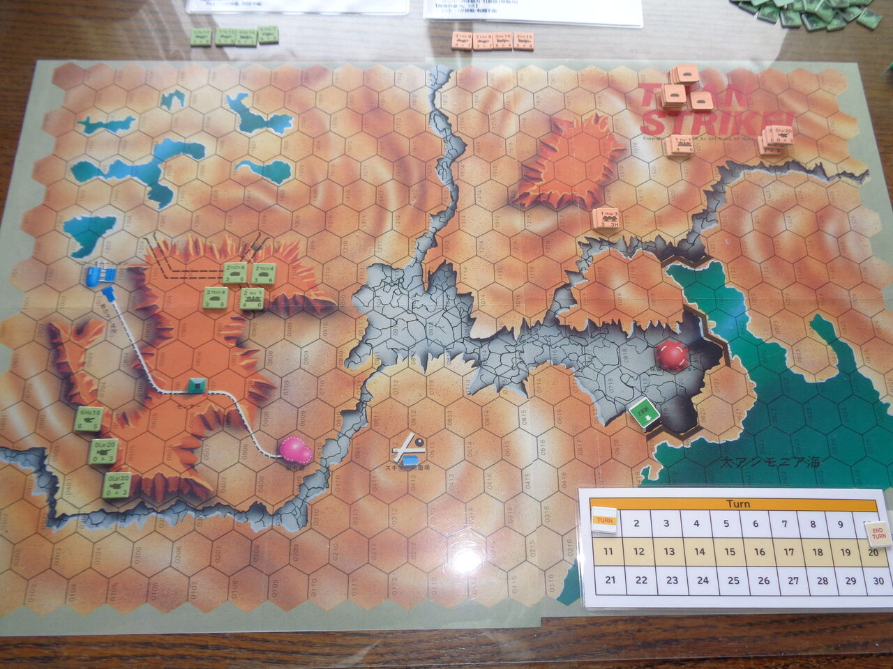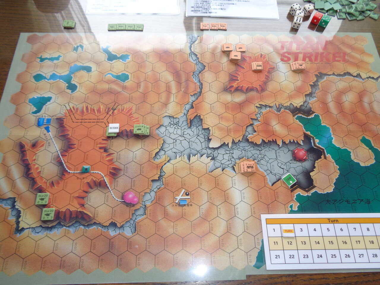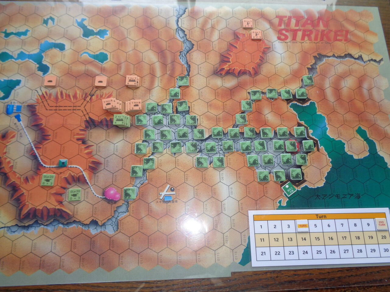 第4ターン、完全に制空権を握ったHEAのスキマー隊は、メタンの大気を切り裂いて死の舞を踊ります。先のターンに、スキマー発着場を占領した敵のホッパーに対し、猛烈な爆撃を敢行し、これを全滅させます。さらに、1機が崩壊寸前だった大アンモニア海の堤防を攻撃し、これを決壊させます。緑色の奔流が乾海に流れ込み、EECの得点源だった採掘ステーションを呑み込みます。