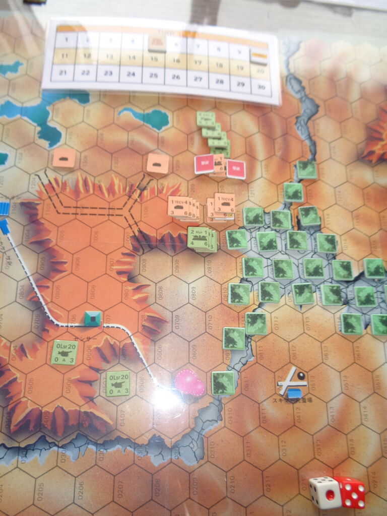 第5ターン、最も高い近接能力を持つホバー自走砲が、HEAのスキマーの集中攻撃により壊滅。さらに、TECVも台地上からの射撃により、1ユニットが撃破されます。EEC側は残りの車輌を突進させ、接近戦に持ち込みますが、お互いにdrが振るわず、膠着に。