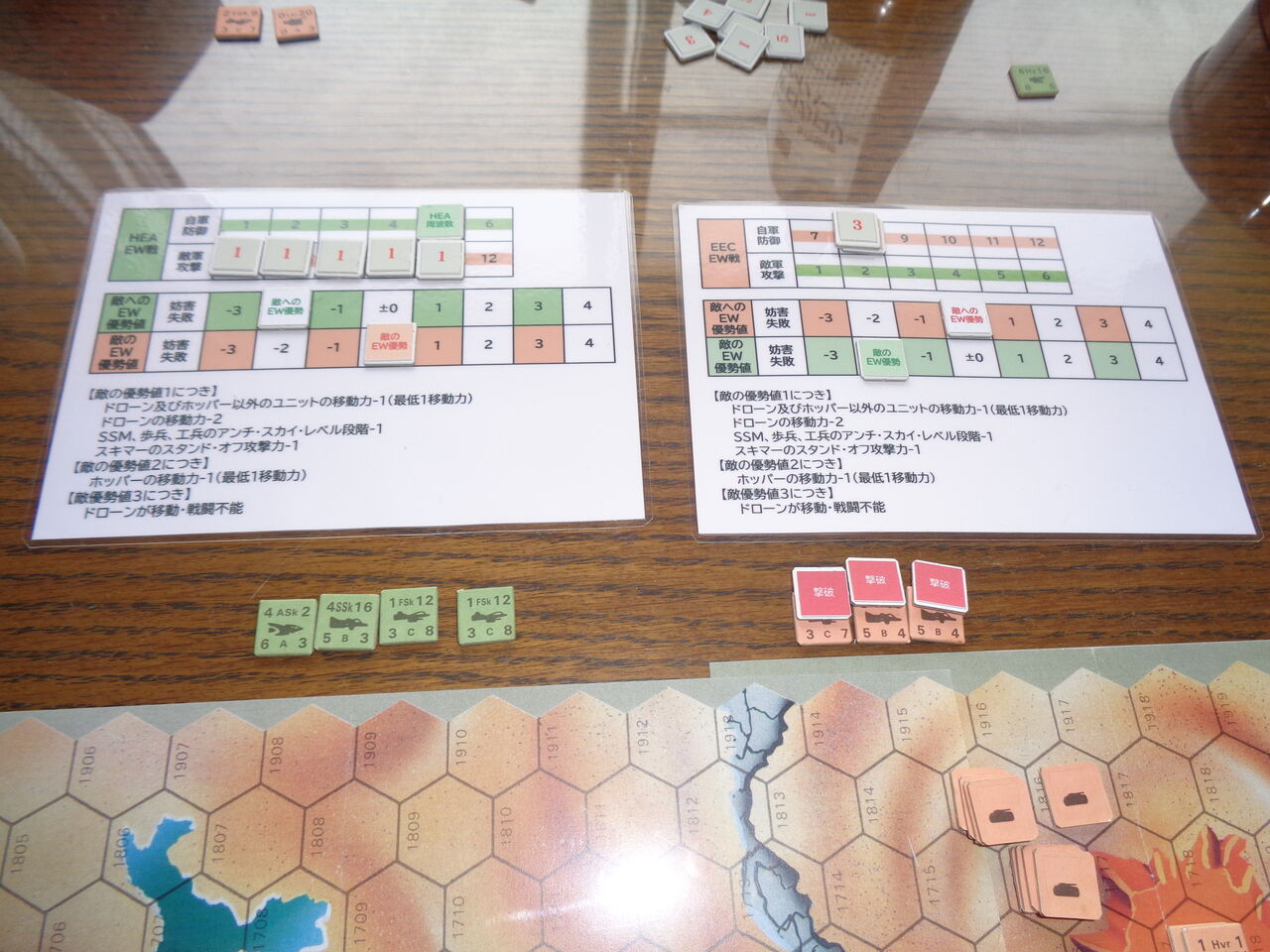 第1ターン、HEAは敵の足を止めるべく、全EW5ポイントを攻撃に使いますが、敵の周波数の特定ができず、効果はなし。一方のEECはEW3ポイントを防御に回し、かつ、スキマーは対空レーザー砲が登場するまで投入を控えます。