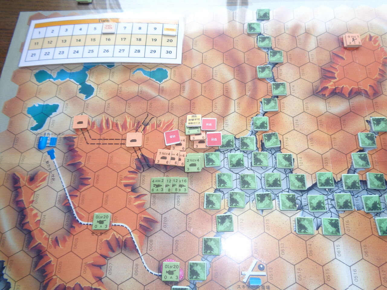移動フェイズでは、EECのホッパーがスキマー発着場付近にジャンプし、敵を牽制します。主力のTECV/ドローン部隊は全力で大地を駆け抜けます。ホバー自走砲は、後々の突入(ケーブルの切断)のために、地形効果の高い台地(メサ)に。一方のHEAは長距離射撃を生かせる台地の北東端にTECVを配置し。機動予備のホバー自走砲は、空爆を受けない洞窟内に待避させます。