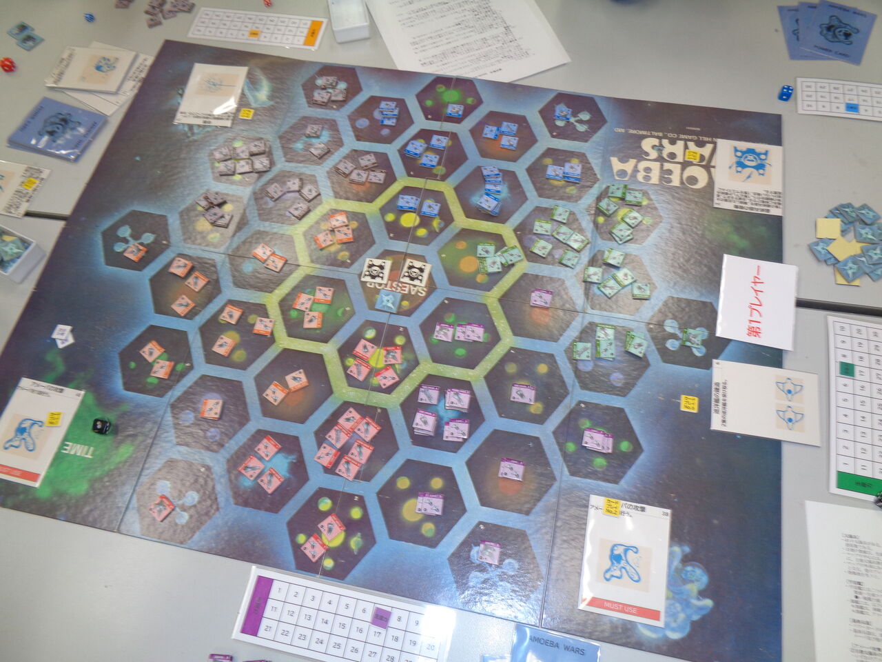 なお、帰宅後、ルールを確認したら、「アメーバの増殖」でミスがありました。増殖の星系が決まると、周囲6へクスが全て無条件攻撃を受けていました。が、実際はdrして、惑星数以下の各星系が攻撃を受けることになっていました。次回があれば、修整します。