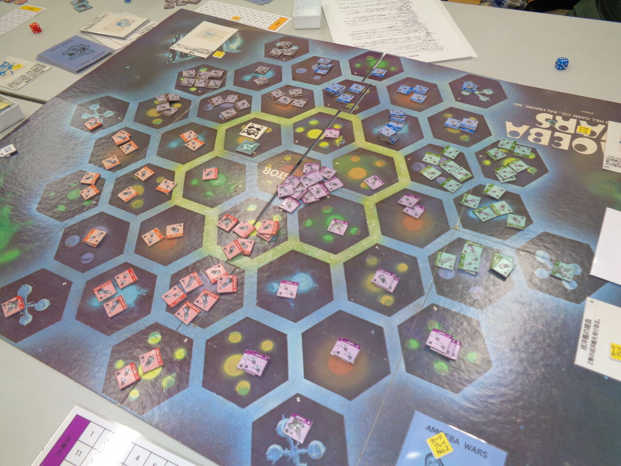 午後になって、Tommyさんとエンジョウさんが到着したので、6人で「アメーバ・ウォー」(AH)をプレイしました。自分がインストしましたが、多人数プレイは初めてで。実は、エンジョウさんとタナックさんが昔にやりこんでいたようで、おかげで作戦指南があって、スムーズな進行になりました。陣営は、以下の通りです。