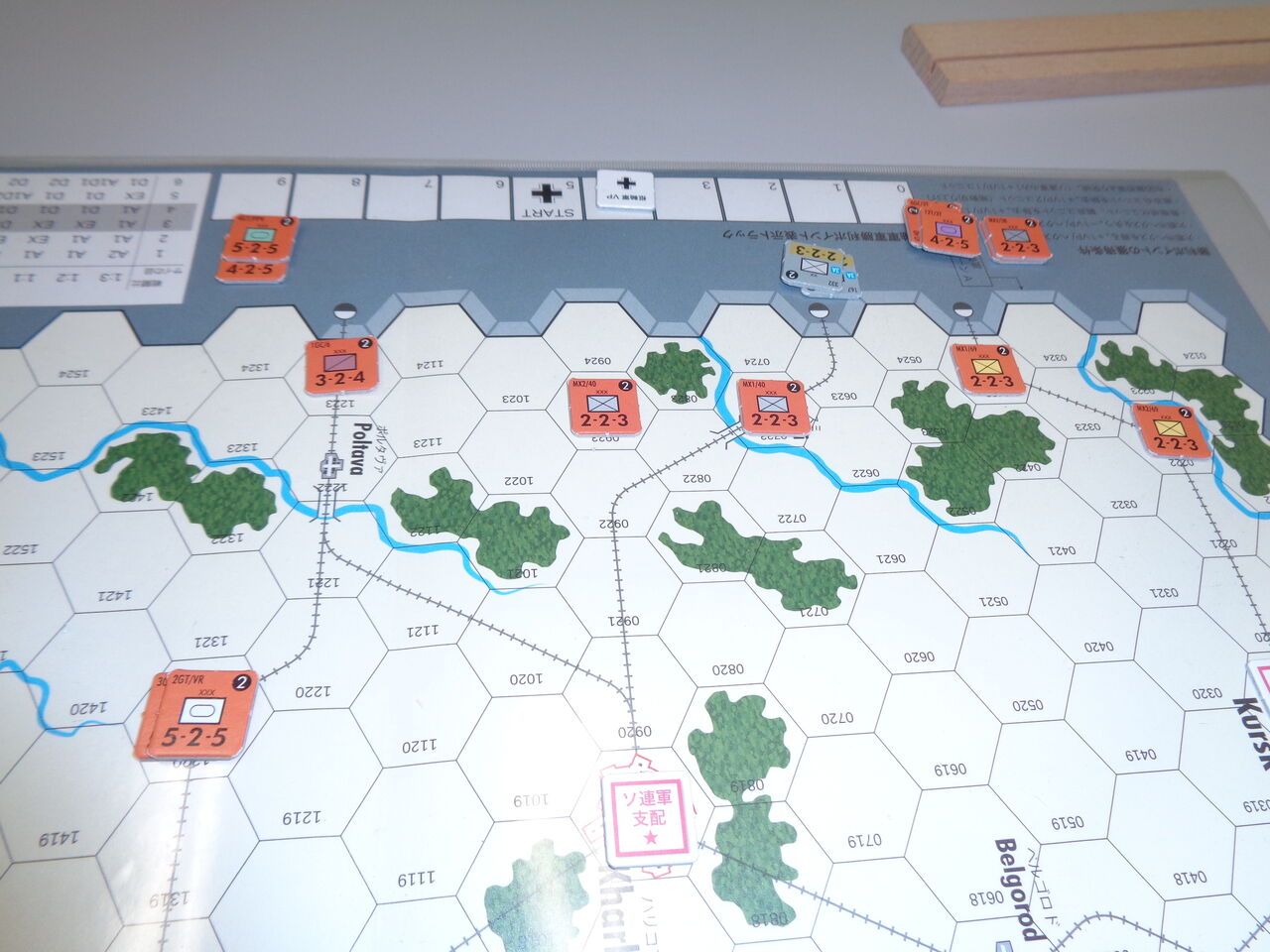 第2ターン、南端への回廊を確保し、南東からの敵増援を封じ込めると、優勢な戦力でドイツ軍の北部戦線を痛打。ドイツ軍も増援を投入して、なんとか突破を防ぎますが、足を止めて守りに入ったことが災いし、高比率攻撃-戦闘後前進による包囲-退路を断って殲滅という負の連鎖に陥り、こちらも損害がうなぎ登りに。もはや、戦略的な反攻は不可能ということで、ソ連軍の勝利となりました。