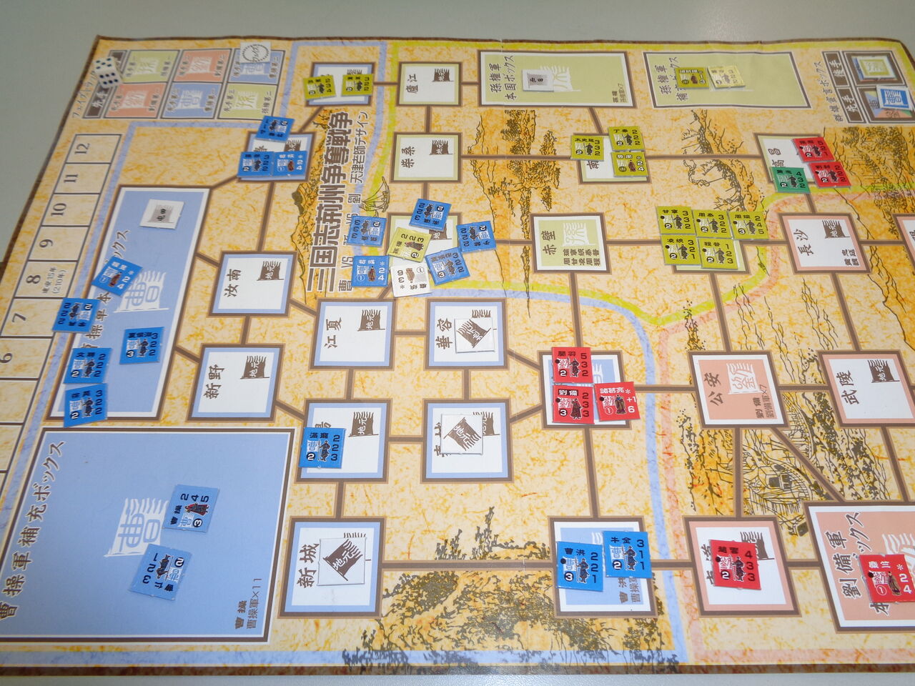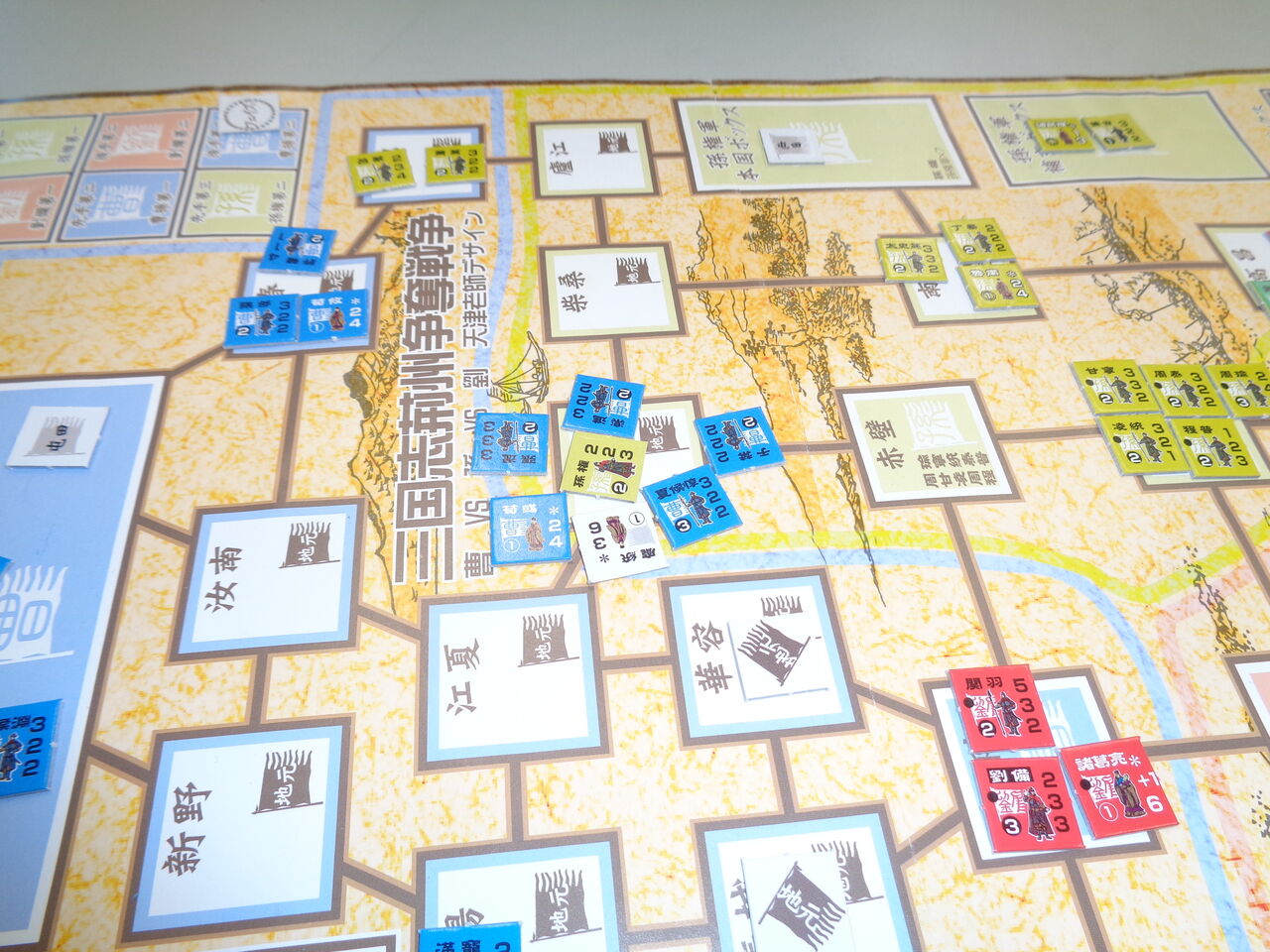 この日の緒戦は、タナックさん持ち込みの「三国志荊州争奪戦争」(GJ) です。以前、GJ誌で発表された「武田遺領争奪戦」のバリアントと言えるもので、いわゆる正体秘匿型の2人用アイテムです。プレイヤーは赤壁の戦い直後の魏・呉・蜀のいずれかを、秘密裏に受け持ちます。正体を明かすまでは、手順に沿って3陣営が動き、自分の陣営が敵に委ねられることも。陣営を宣言すれば、以後は自陣営及び中立陣営を動かせます。よって、宣言までいかにブラフをかけ、敵を誘導するかが肝になります(あるいは誤解しないか)。