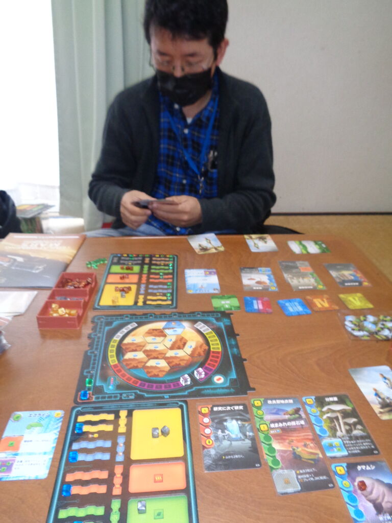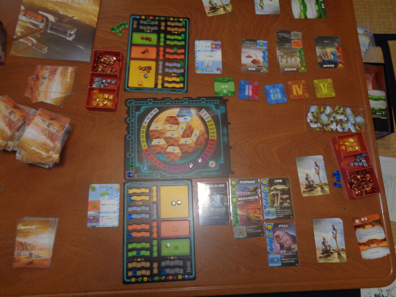 緒戦は、BIBIさん持ち込みの「テラ・フォーミング・マーズ・カードゲーム:アレス・エクスペディション」(アークライト)です。傑作SF開拓ゲームながら、そのマトリックスの多さからハードルが高かった原作を、思い切りリファインしたカードゲームです。元のエンジンはほぼそのままで、開拓範囲を9へクスに縮小し、建材やチタンをポイントマーカーに換えるなど、手頃な箱庭風に。最も変わったのが、開発・建設・実行・産出・研究の全ての行動をせず、プレイヤーの選択したいずれかのみを行うように。これにより、ゲーム時間は所見でも90分ほどに(慣れれば、60分程度に)圧縮されます。