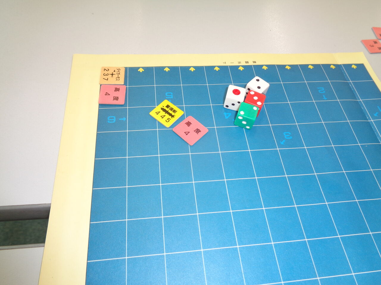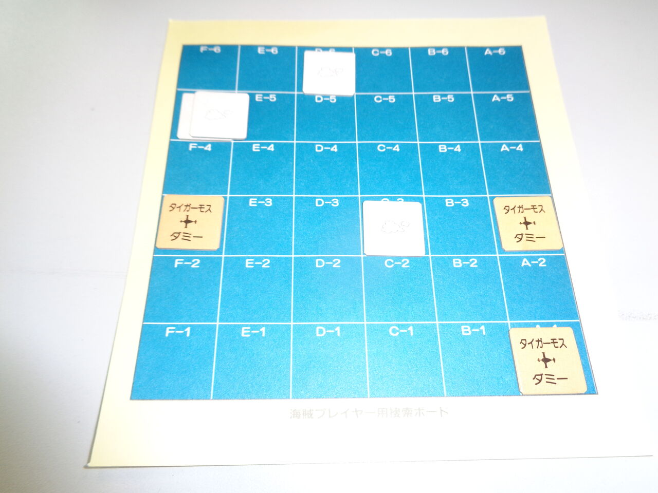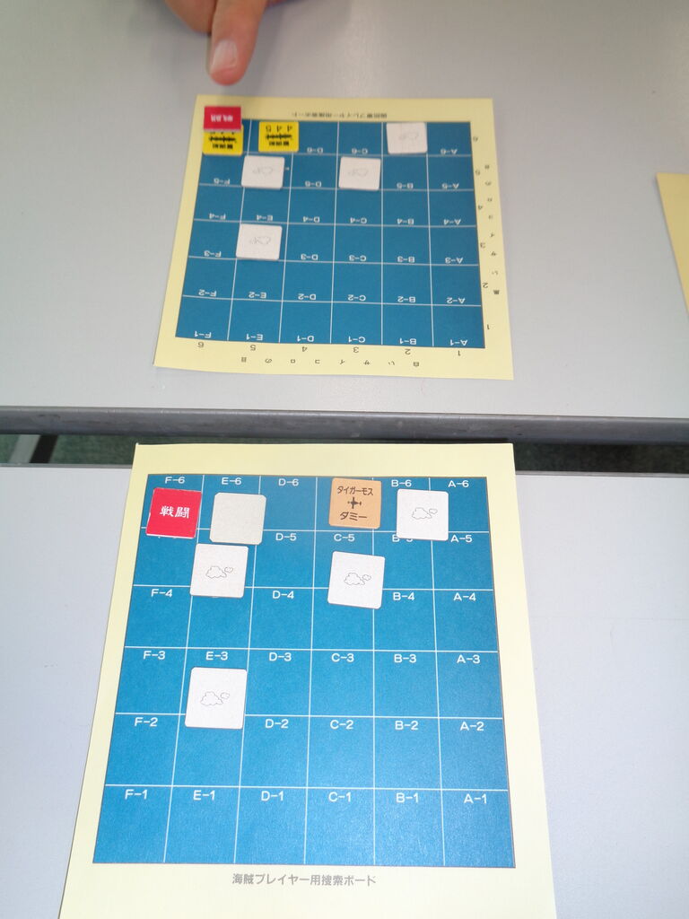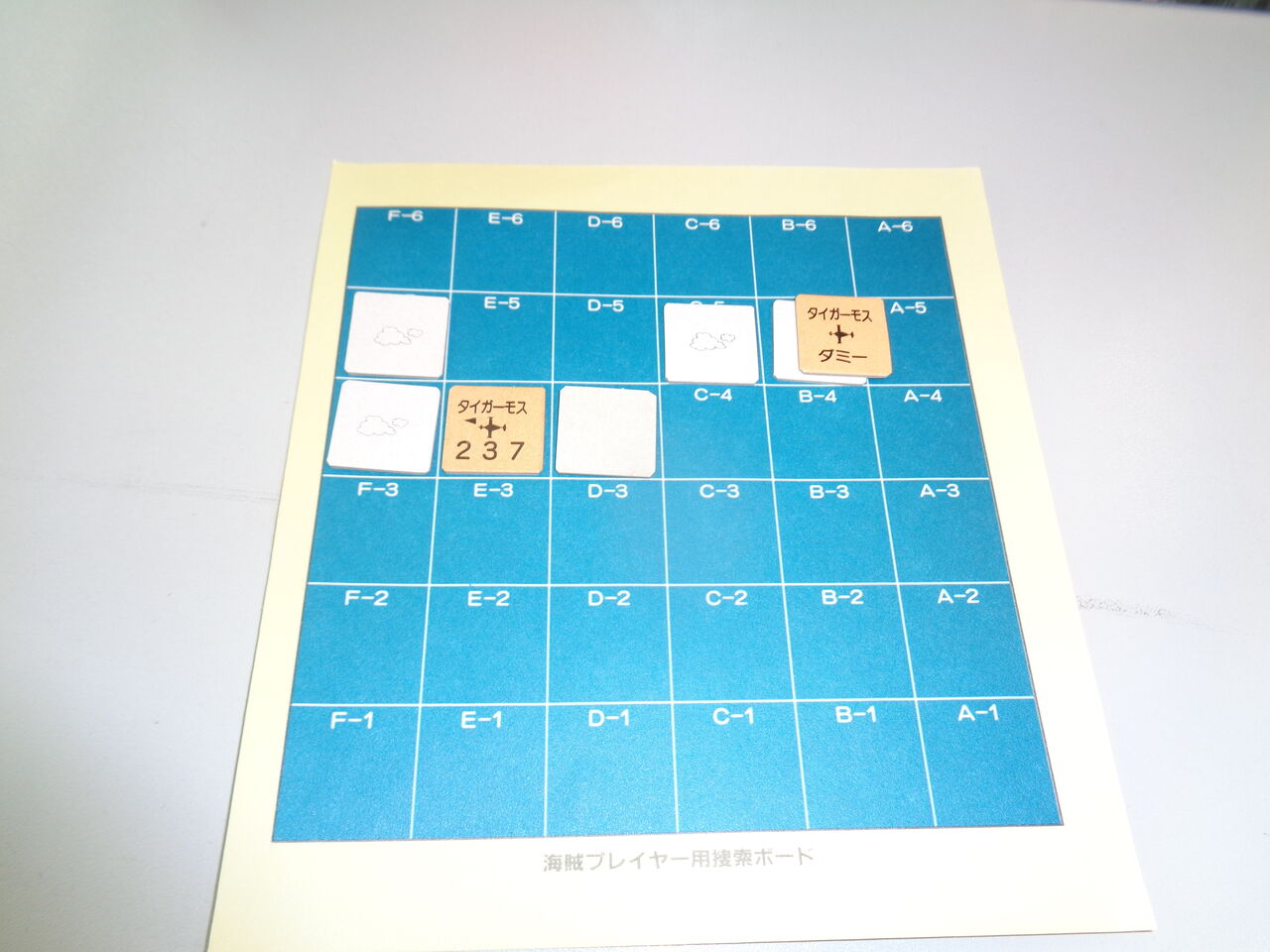 システムは、いわゆるダブルブラインドで、6×6マスの空域に展開する国防軍警備艇の隙を突き、盤外への突破を目指します。両陣営の移動後に、国防軍警備艇がコールをして周囲8マスにタイガーモス号がいれば、発見。同じマスに入れば、戦闘になります。空域には捜索を受けない雲ユニットがあり、ドーラ側にはダミー3枚もあるので、読み合いと運が物をいいます。陣営は、mitsuが海賊側を、タナックさんが国防軍を担当します。