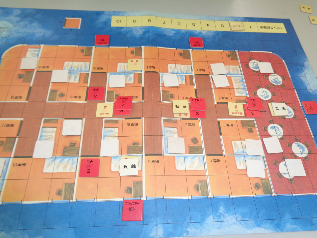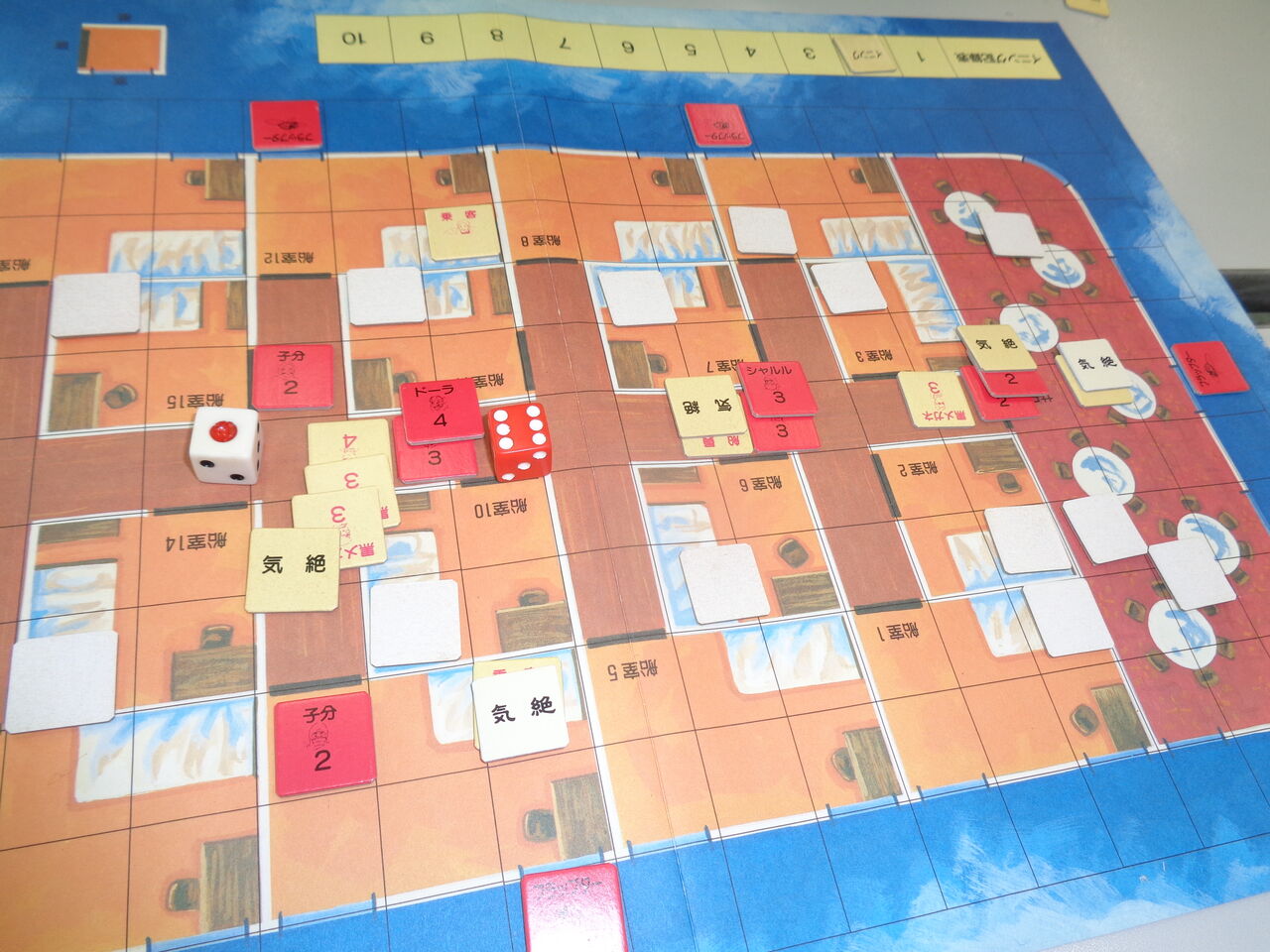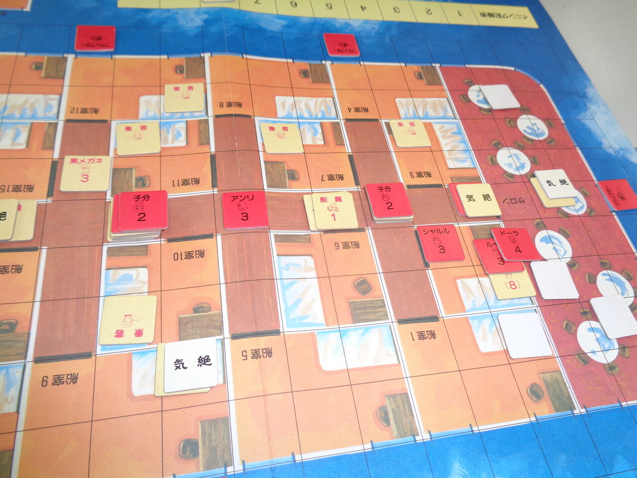 序盤に、海賊側が敵の主力を制圧(気絶)したので、楽勝かと思いきや、敵が守りを固めていた部屋はブラフ。必死に捜索するも、あと一歩(後1ターン)足らず。