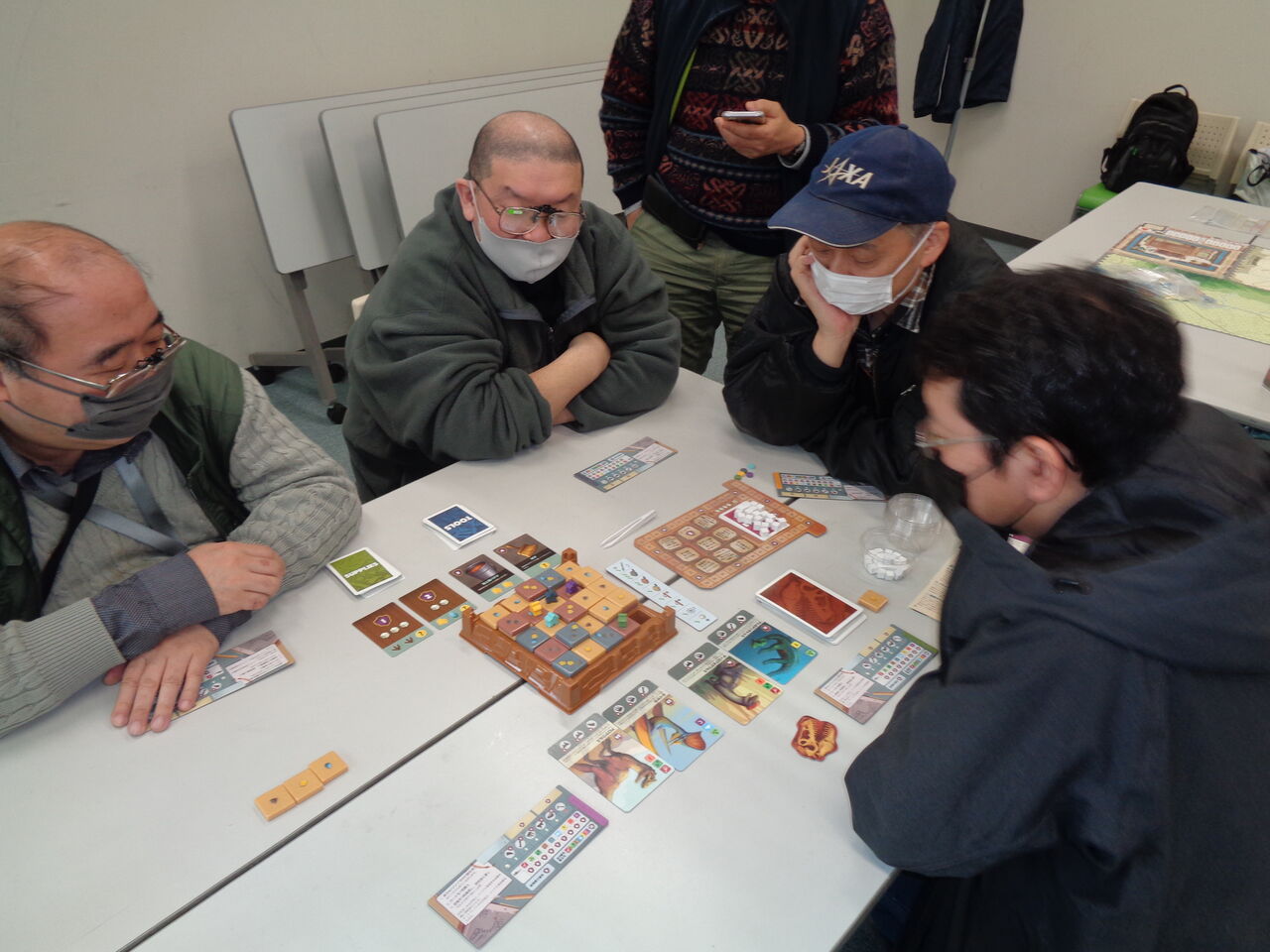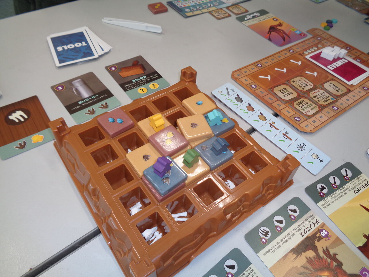 中盤になると、各プレイヤーは自分で砂地を置いて落とすプレイで、カードによる石膏獲得に。これは決して効率がよいものではなく、コンスタントに石膏2個をゲットできるTommyさんの優位は変わらず。それでも、恐竜種を多く集める作戦に出たタナックさんが一時的に完全修復数でトップに立ちます。