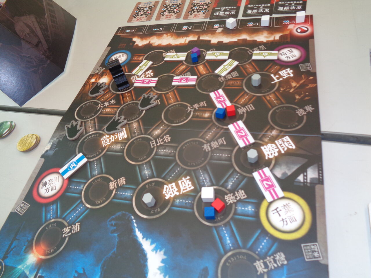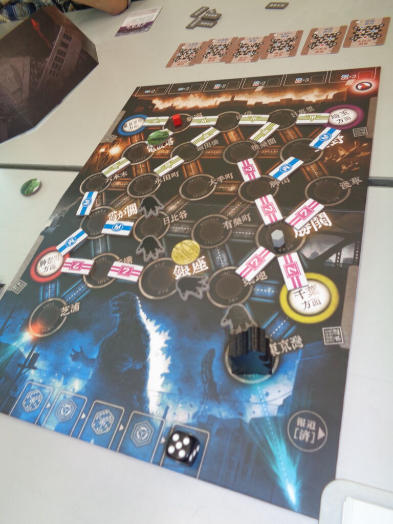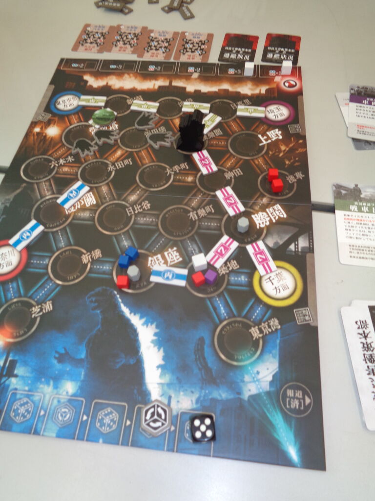 お昼過ぎに5人が集まったところで、BIBIさん持ち込みの「ゴジラ」(アークライト)をプレイしました。ゴジラ(BIBI)対人類(エンジョウ・mitsu・平・kawa)の陣営です。
