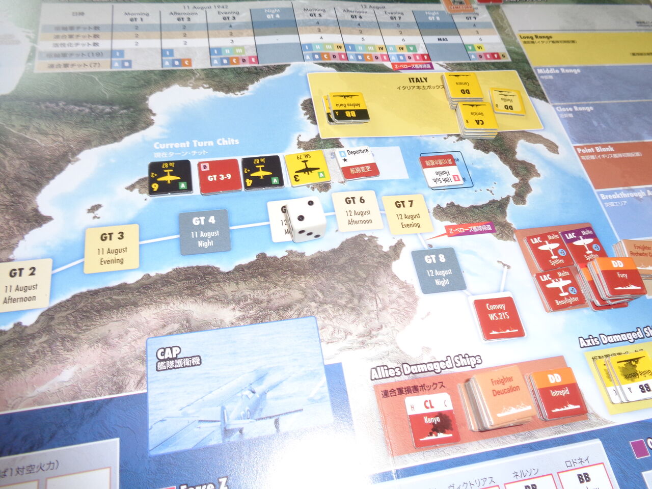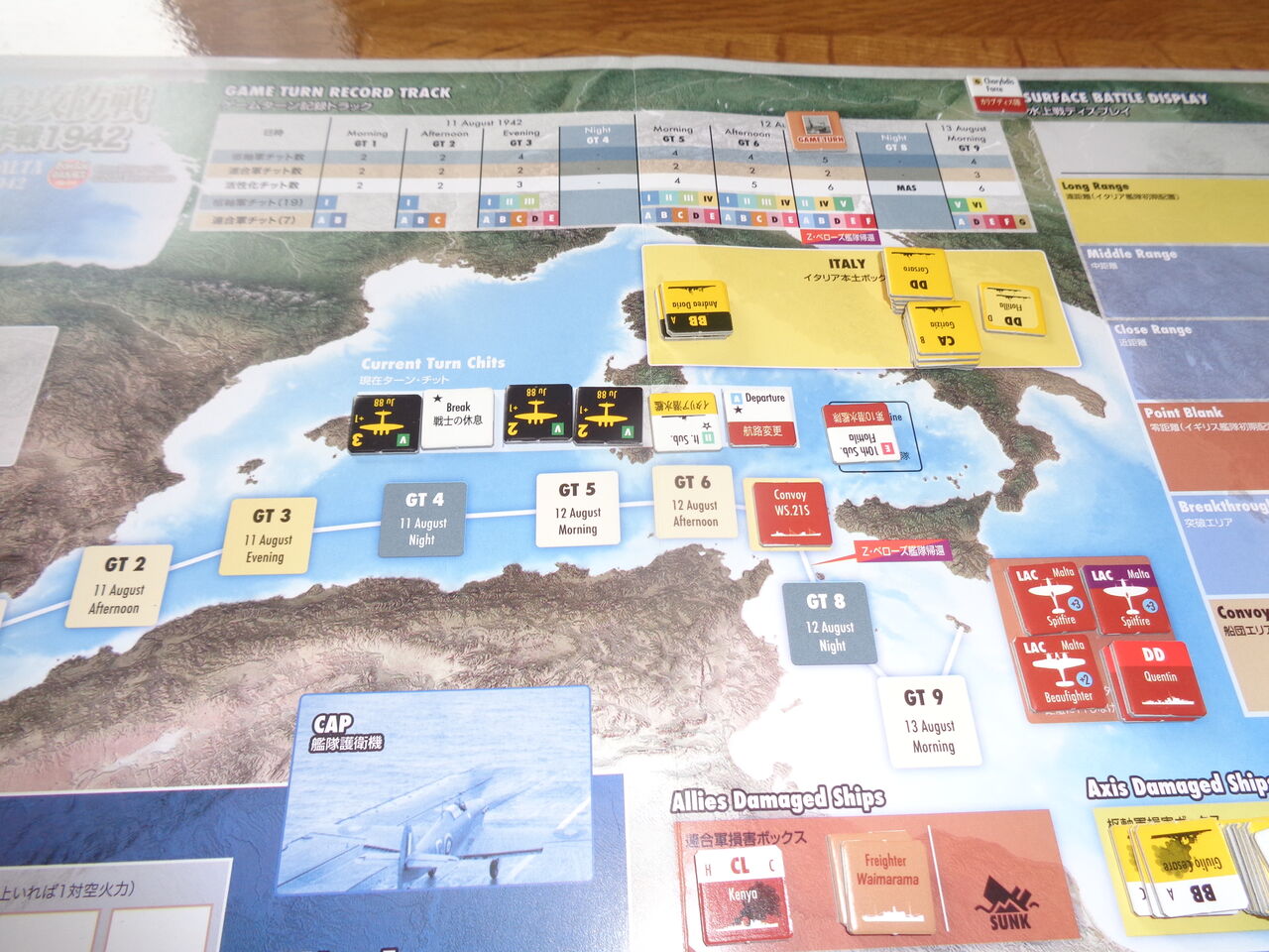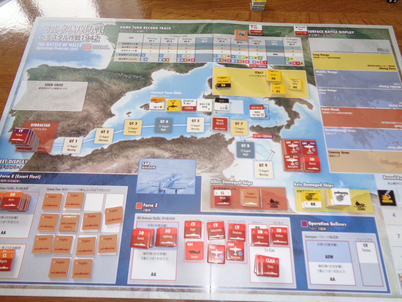 この日の緒戦は、15年の時を経て復活なった「マルタ島攻防戦:ペデスタル作戦1942」 (Bonsai Games)です。ゲームについては、こちらとか、そちらをどうぞ。陣営は、バランスは不利ですが選択肢の豊富な枢軸軍をBIBIさんが、連合軍をmitsuが担当しました。
