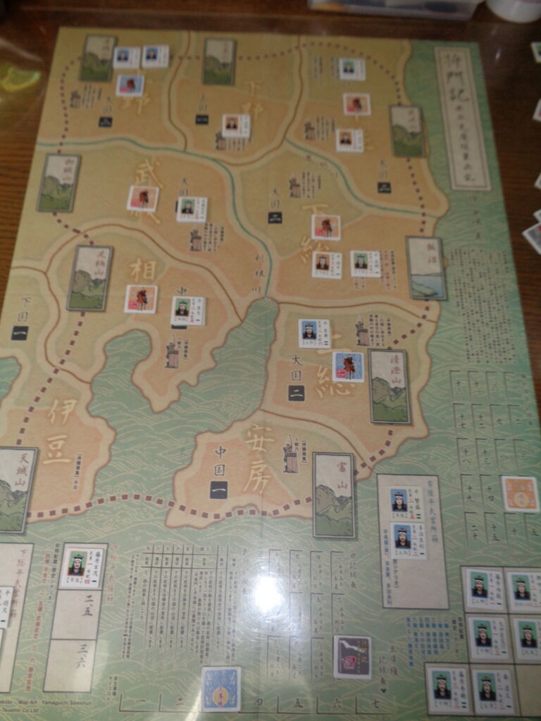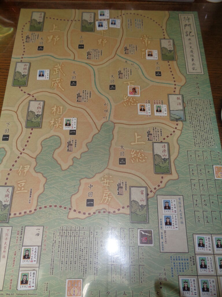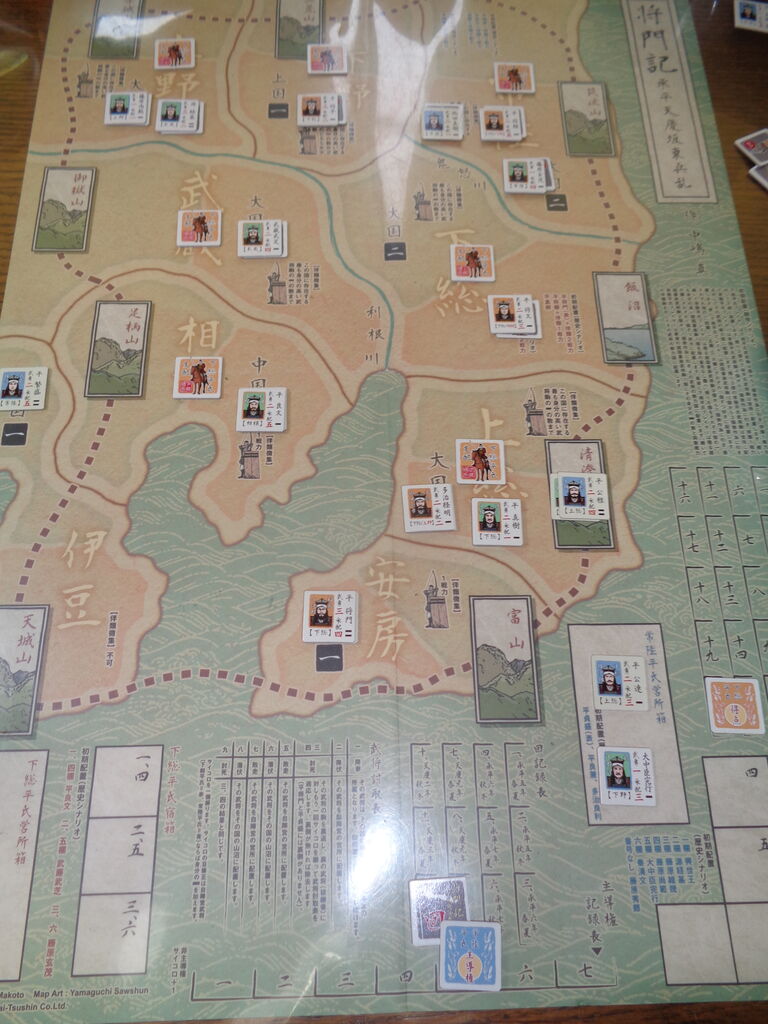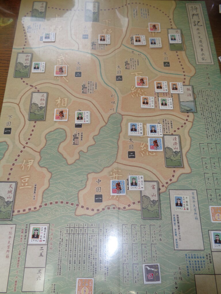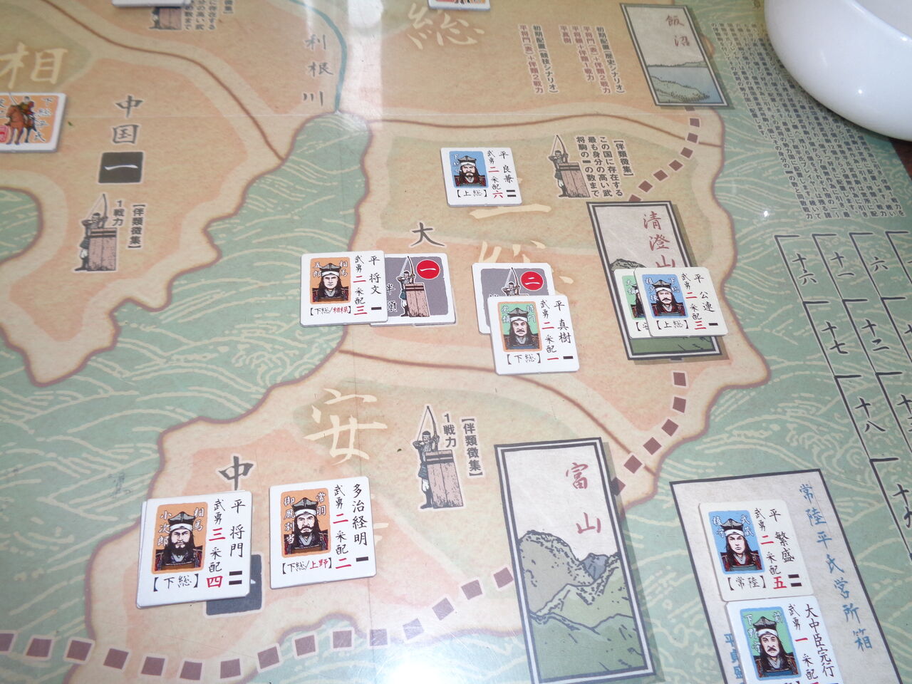 これが、実質上の決定戦でした。第9ターン以降は、ゲリラ的に出陣する常陸平氏側を、下総平氏が各個撃破し、敵の支配を一切、許さず。上野と下野も、支配下におき、ゲーム終了。下総平氏側が、20点振りきりの圧勝となりました。