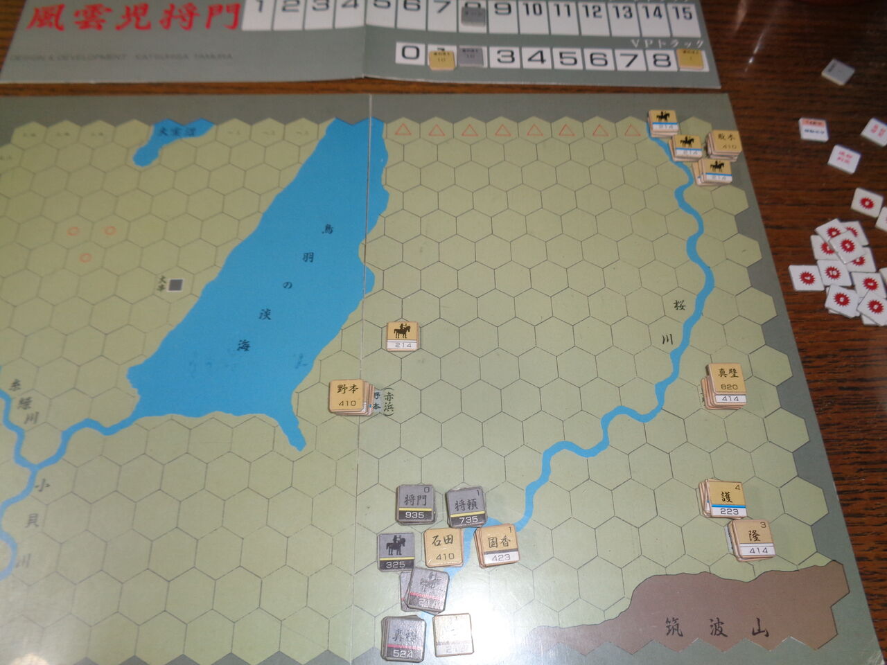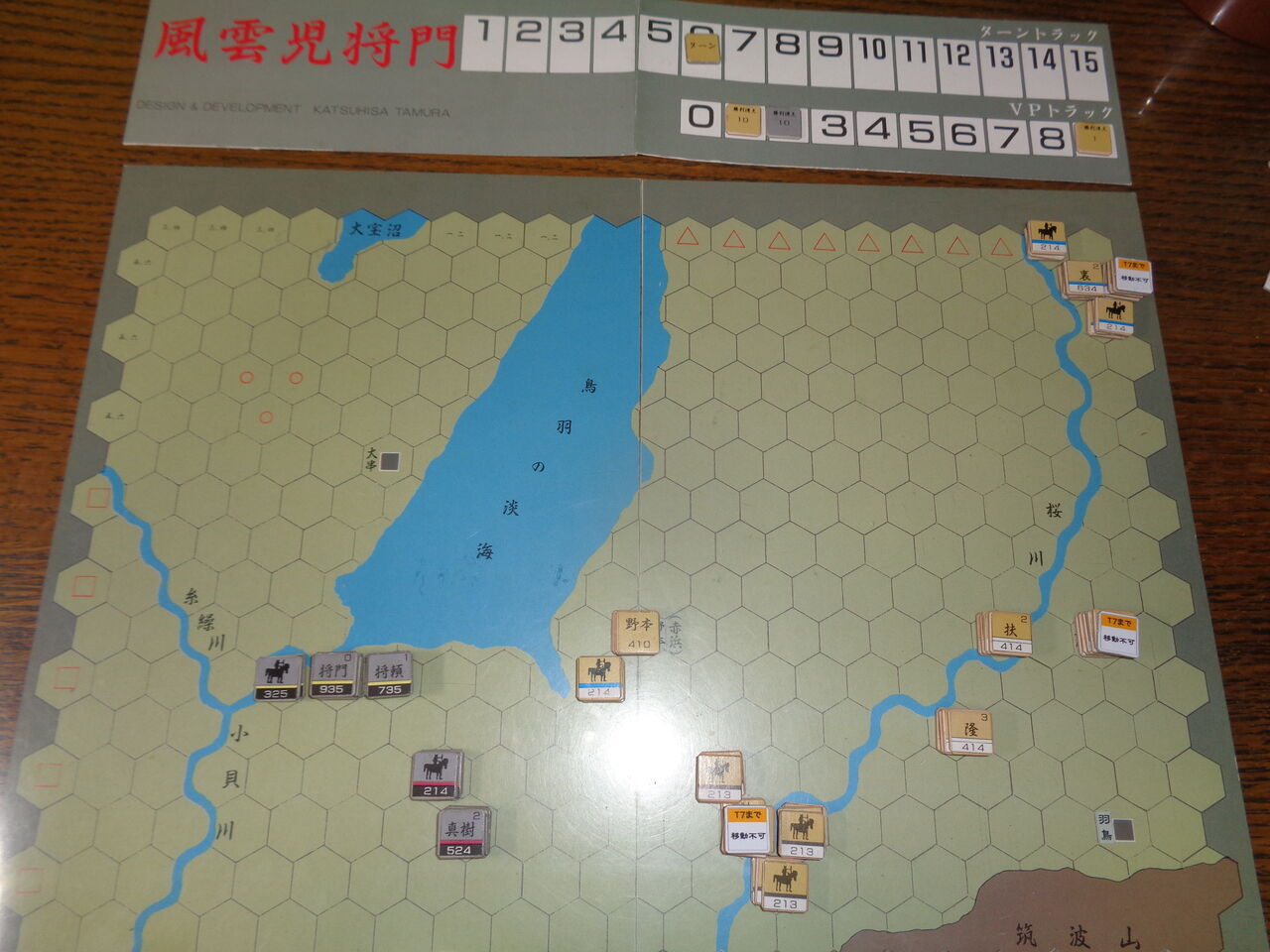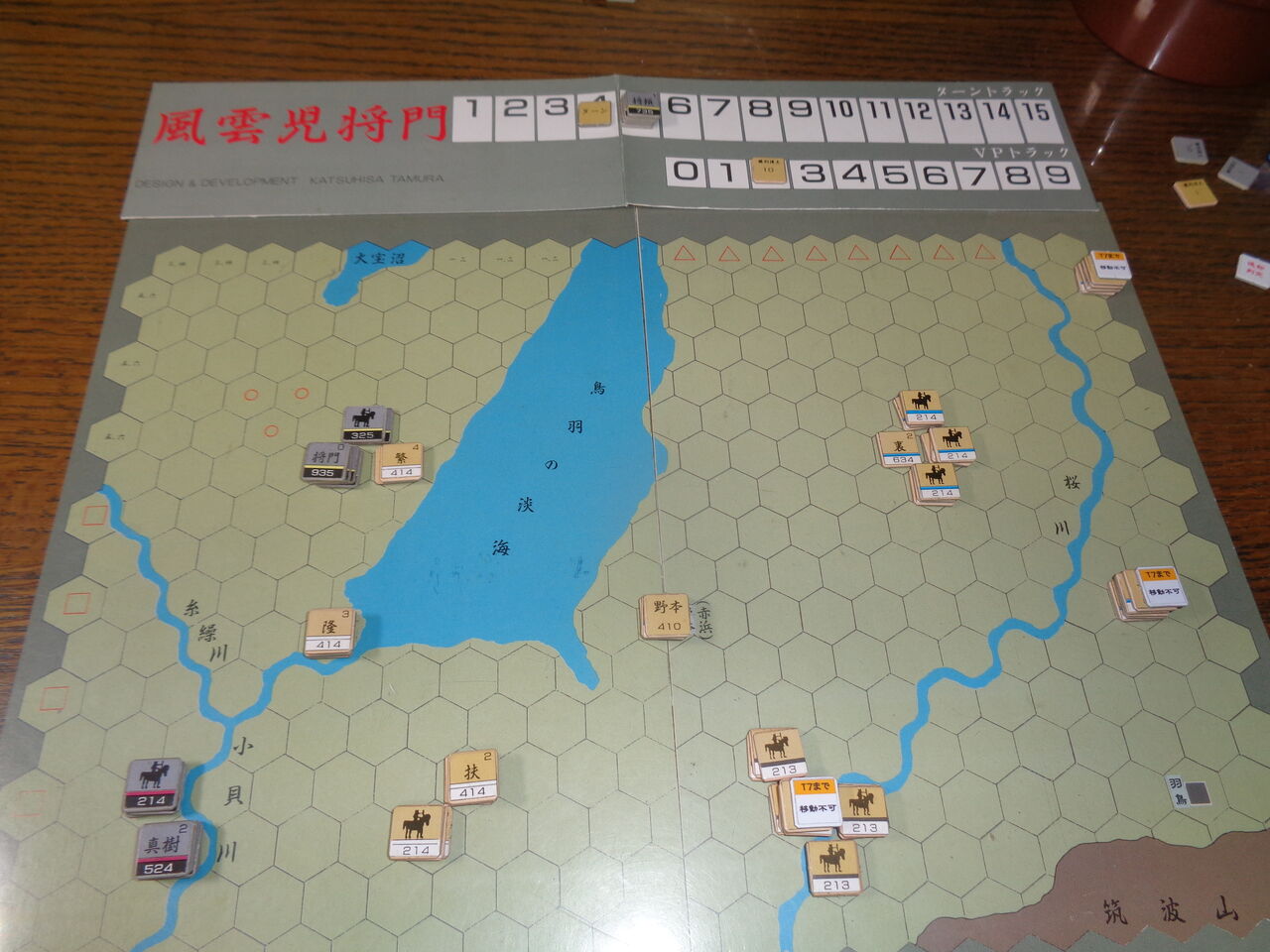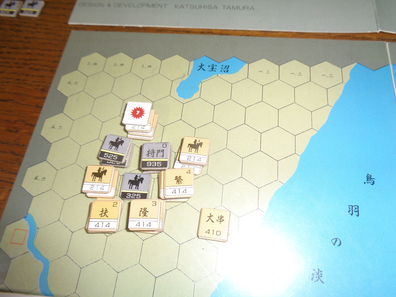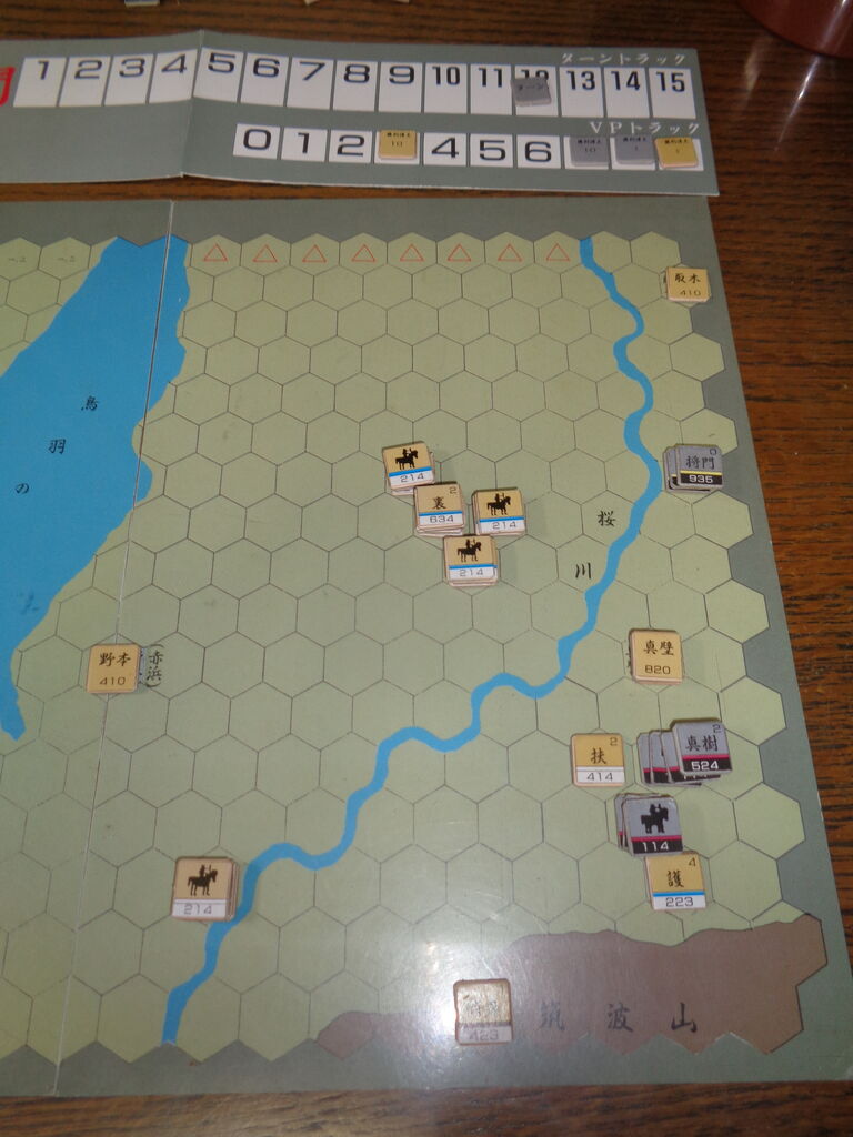 源護側としては、各個撃破を避けるため、以下のような作戦を取ることにしました。第1ターンの強制攻撃ではあえて、将門を狙わず、伴類(雑兵)を叩いて、敵打撃力の減少を狙う(将門を攻撃するとVPが入るが、これはデザイナーの罠-あるいは史実の再現ルールで、反撃で酷い目に遭います)。その後、拠点に籠もってハリネズミの陣で時間を稼ぎながら(敵に出血をさせながら)、可能な限りの兵力を山岳や羽鳥(ともに将門勢のZOCが及ばず、攻撃できない)に待避させ、機を見て機動反撃に転ずる。ゲーム終了時に生き残ったユニットが得点になるので、VP上の勝利を狙う。