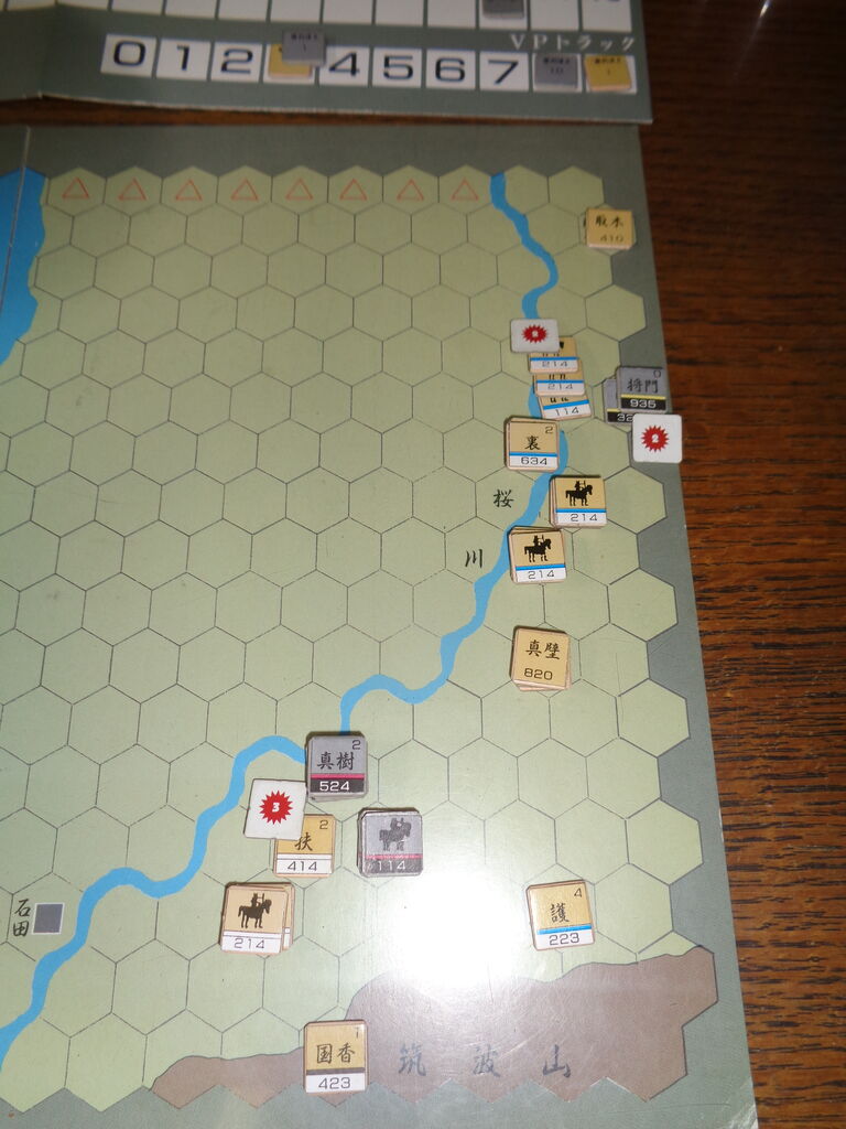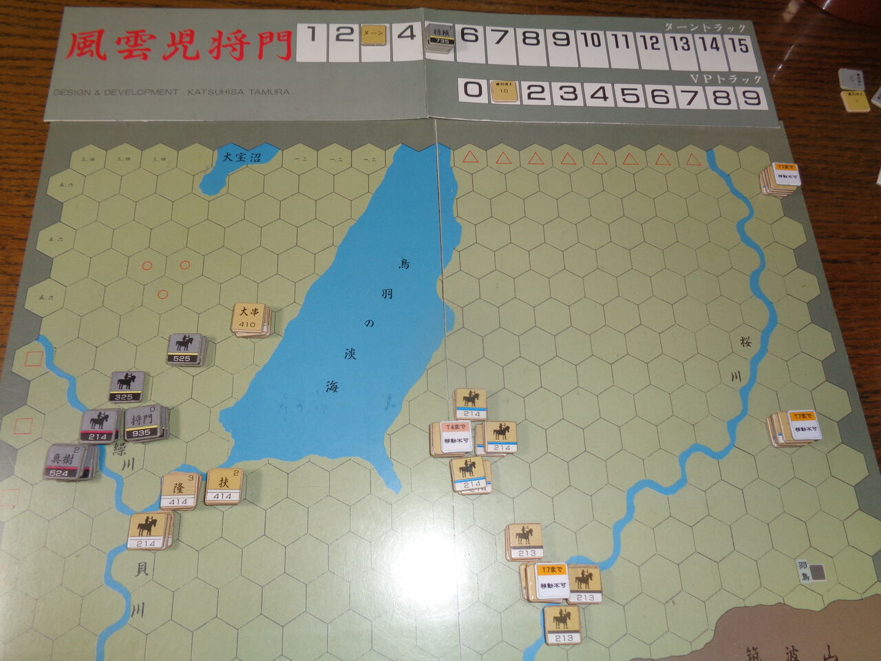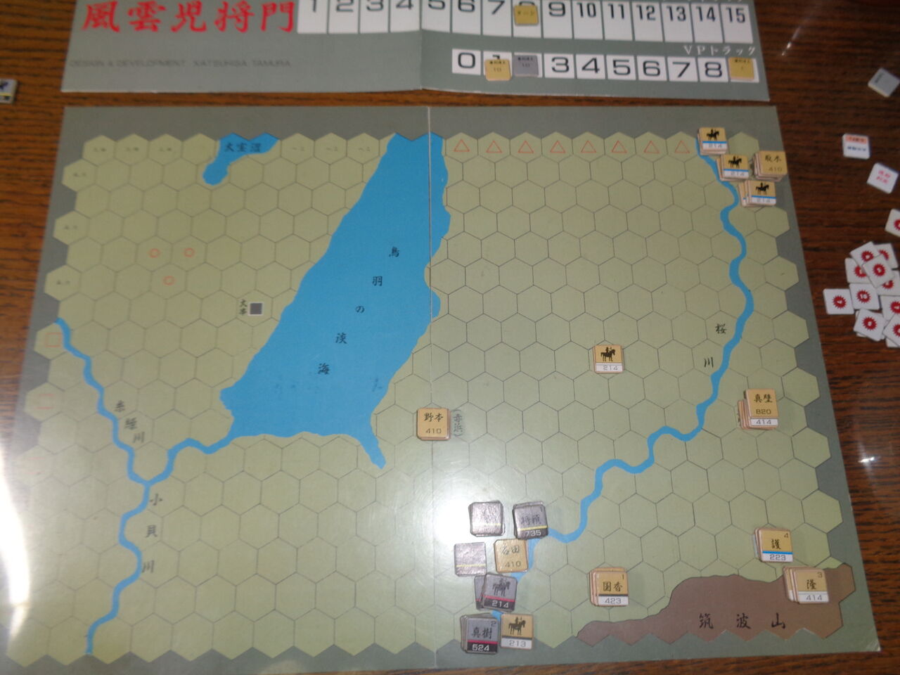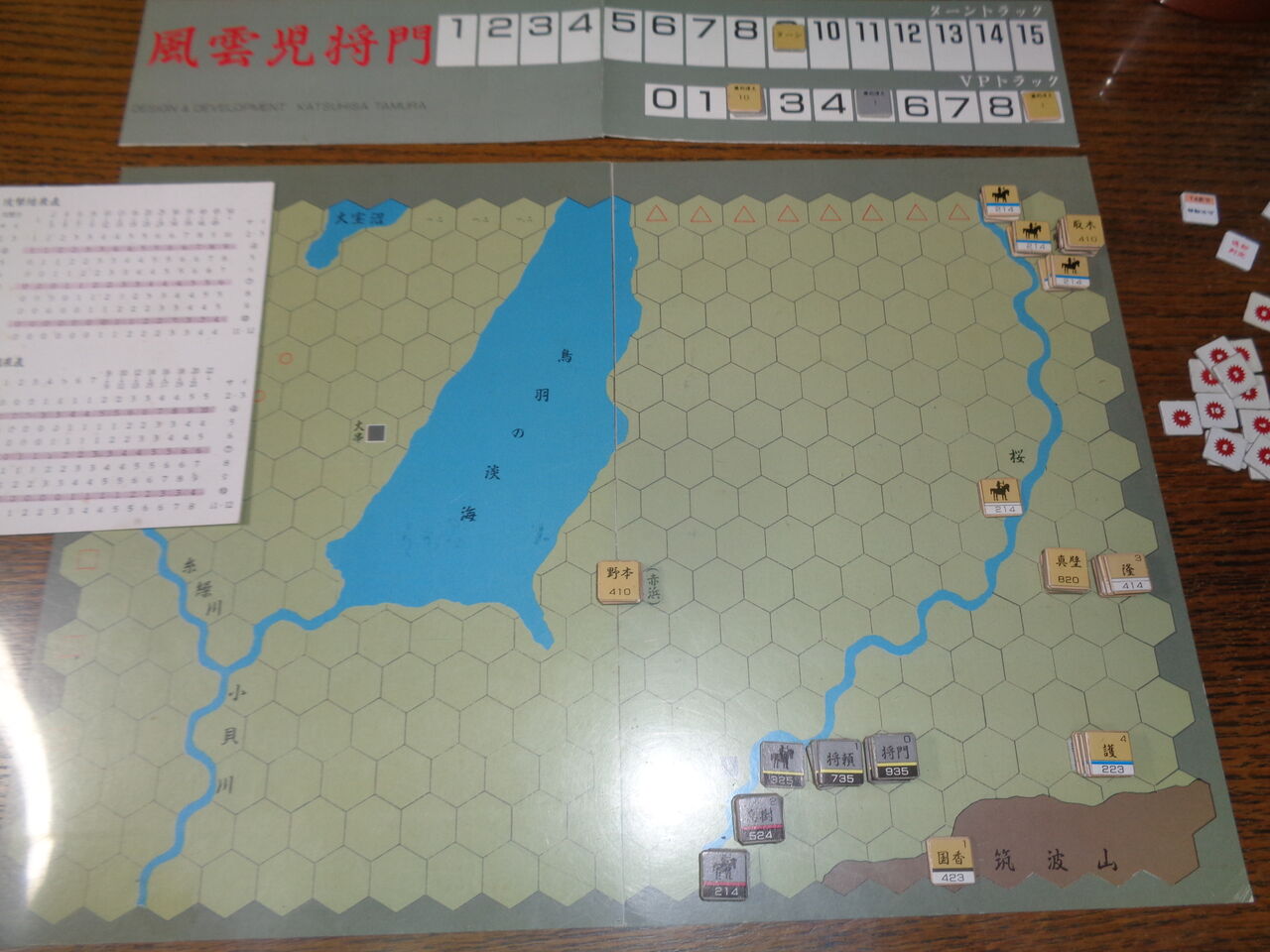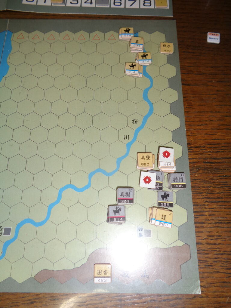 源護側としては、各個撃破を避けるため、以下のような作戦を取ることにしました。第1ターンの強制攻撃ではあえて、将門を狙わず、伴類(雑兵)を叩いて、敵打撃力の減少を狙う(将門を攻撃するとVPが入るが、これはデザイナーの罠-あるいは史実の再現ルールで、反撃で酷い目に遭います)。その後、拠点に籠もってハリネズミの陣で時間を稼ぎながら(敵に出血をさせながら)、可能な限りの兵力を山岳や羽鳥(ともに将門勢のZOCが及ばず、攻撃できない)に待避させ、機を見て機動反撃に転ずる。ゲーム終了時に生き残ったユニットが得点になるので、VP上の勝利を狙う。