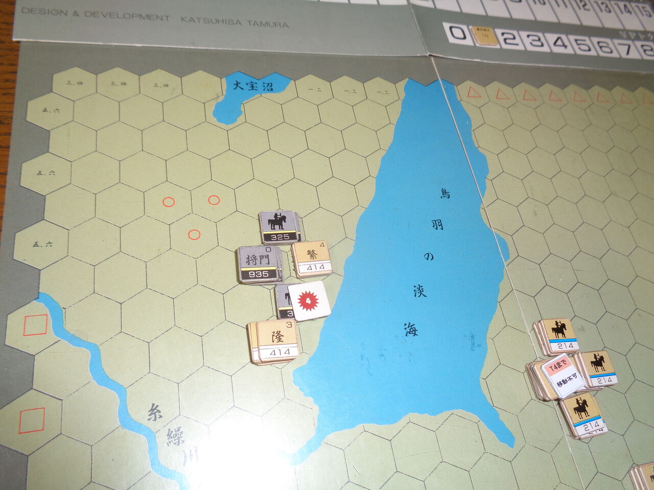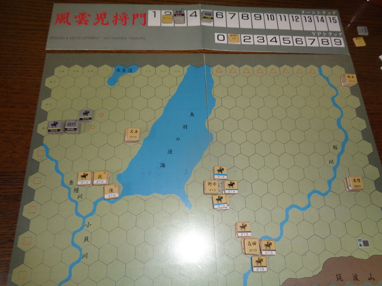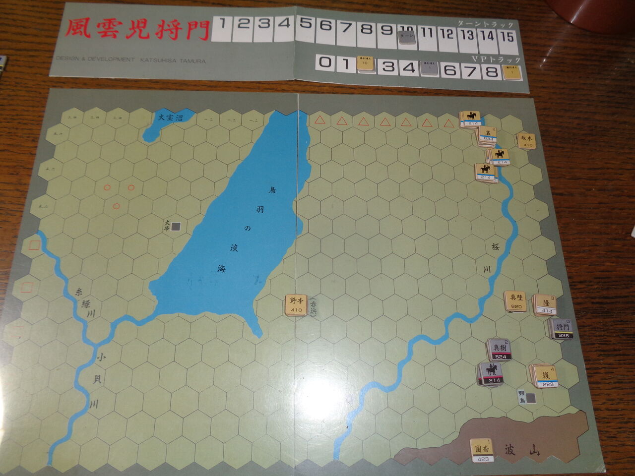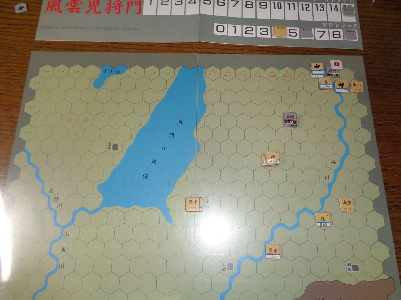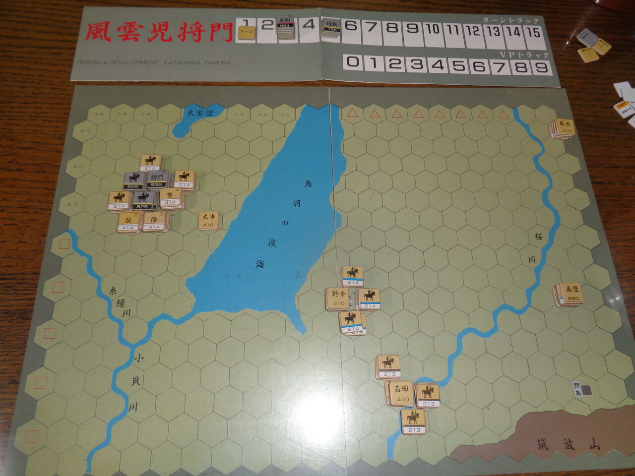 源護側としては、各個撃破を避けるため、以下のような作戦を取ることにしました。第1ターンの強制攻撃ではあえて、将門を狙わず、伴類(雑兵)を叩いて、敵打撃力の減少を狙う(将門を攻撃するとVPが入るが、これはデザイナーの罠-あるいは史実の再現ルールで、反撃で酷い目に遭います)。その後、拠点に籠もってハリネズミの陣で時間を稼ぎながら(敵に出血をさせながら)、可能な限りの兵力を山岳や羽鳥(ともに将門勢のZOCが及ばず、攻撃できない)に待避させ、機を見て機動反撃に転ずる。ゲーム終了時に生き残ったユニットが得点になるので、VP上の勝利を狙う。