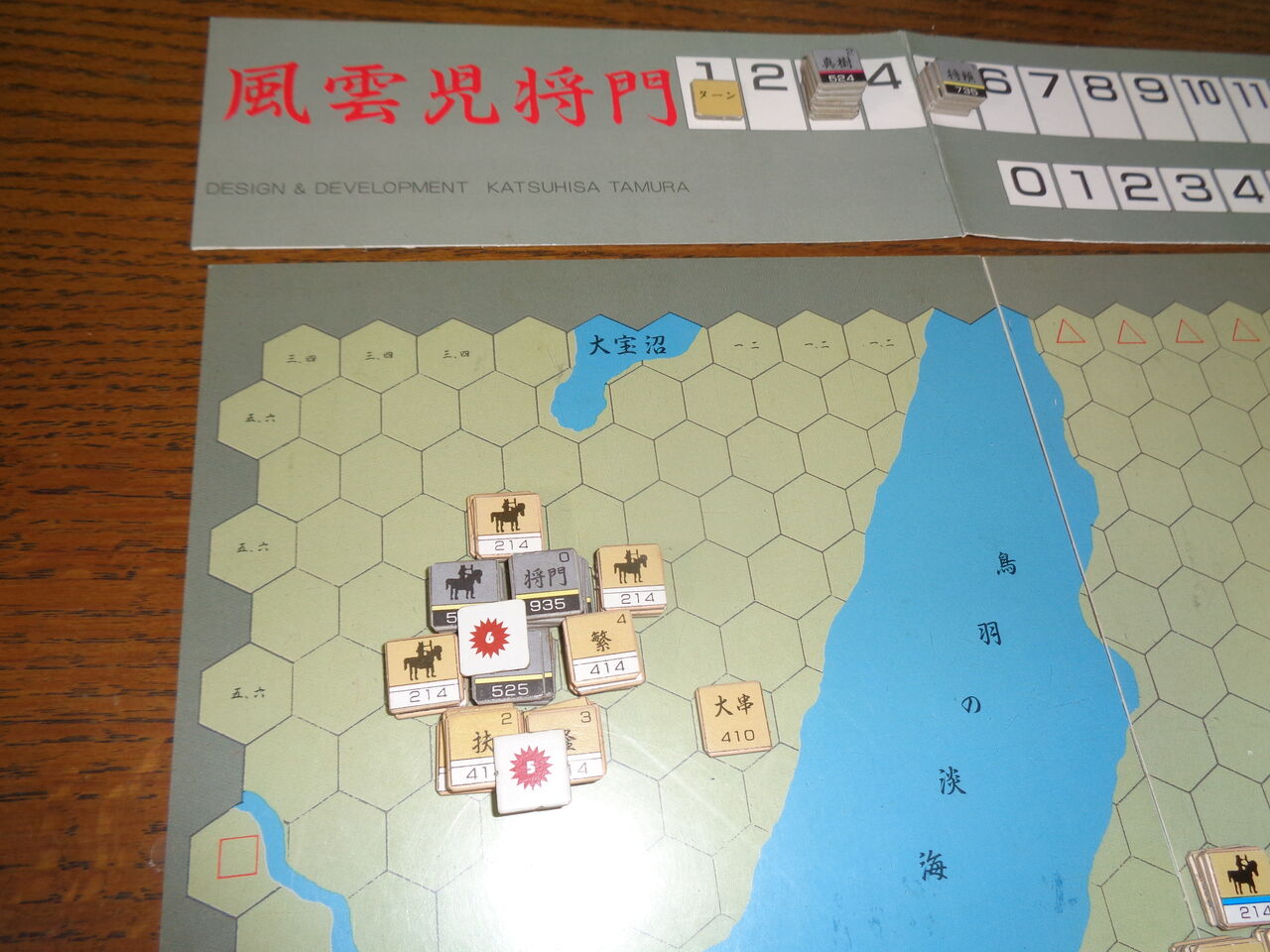 デザイナーは、自らBQデザイナーと名乗る田村氏。当時は、テストプレイの相手がなく、「ソロデザイナー」で頑張ったそうで。システムは両軍のダブルインパルスで、戦闘は火力の基づいたダメージ判定と防御レベルの適用というファイヤーパワーです。事前にソロ演習してみましたが、このゲームでも、源扶、繁、隆の三兄弟の奇襲に始まります。史実どおりの対応をすると、史実どおり、源勢と平国香勢が各個撃破に合います(再現性は高い)。ただし、2d6の戦闘の振れ幅が大きいので、将門勢も相当の損害を受ける可能性があり、VP上で敗北することもあり得ますが・・・。