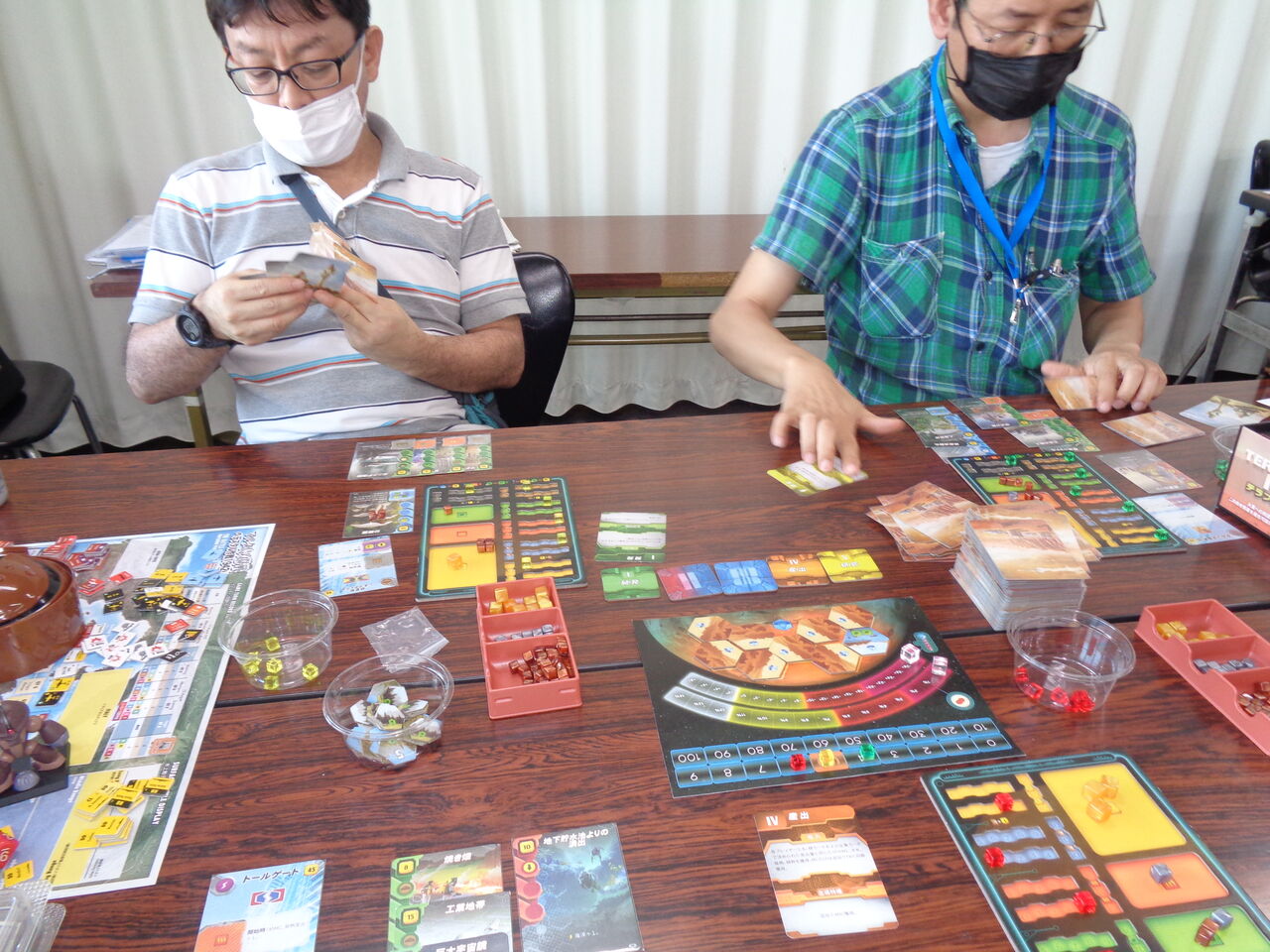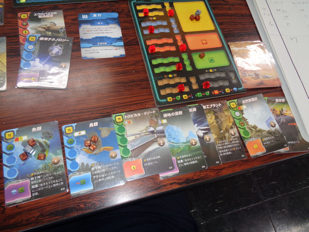 続いて、これまた、BIBIさん持ち込みの「テラフォーミング・マーズ アレス・エクスペディション」(アークライト)です。傑作SFゲームの「テラフォーミング・マーズ」の簡易版で、元の要素を残しながら、手番をぎゅっと圧縮したものです。ちはら会でも、プレイされているので、そちらも参照ください。