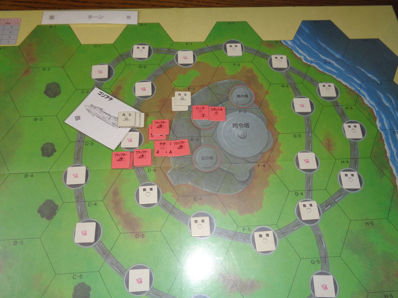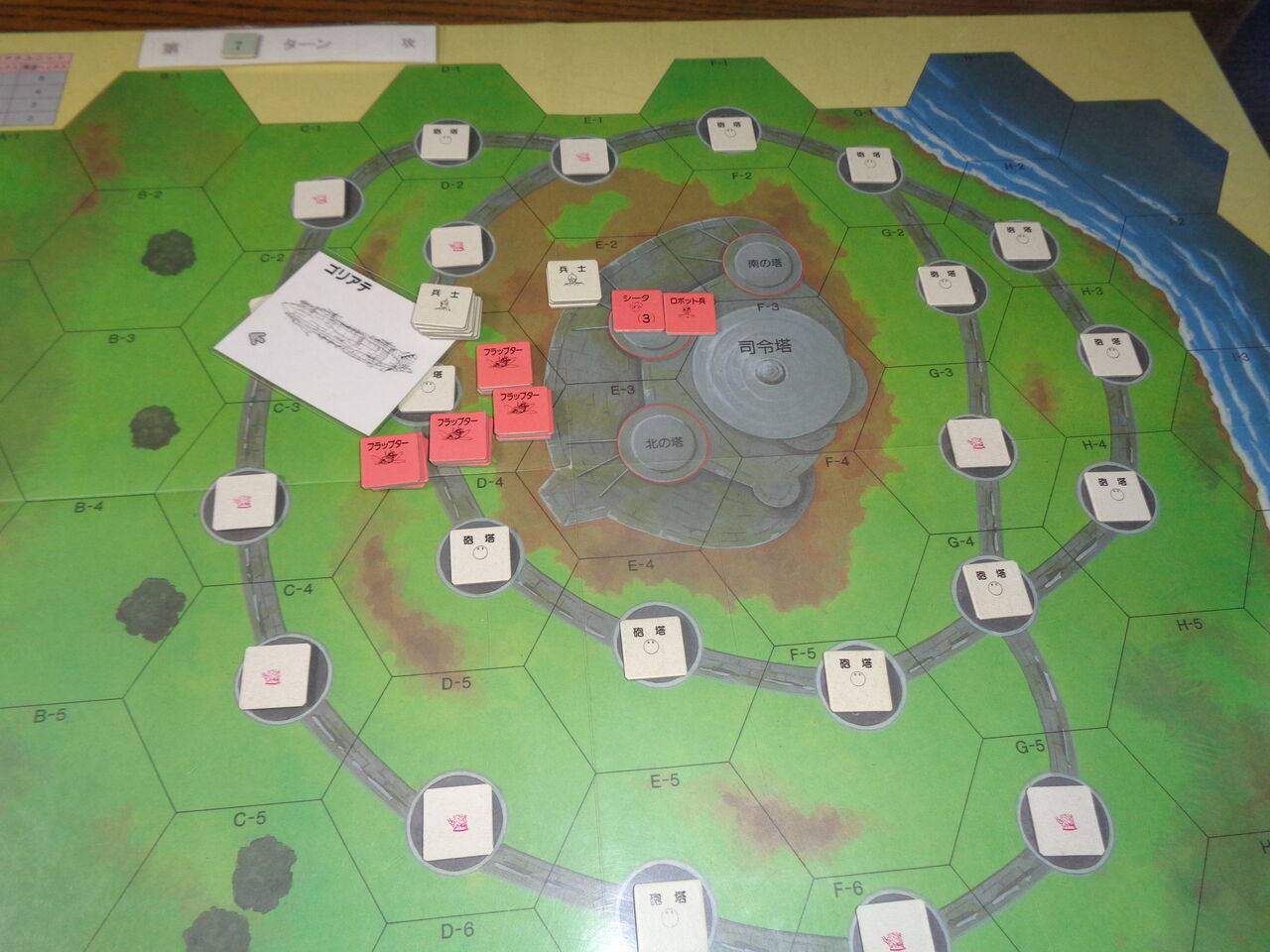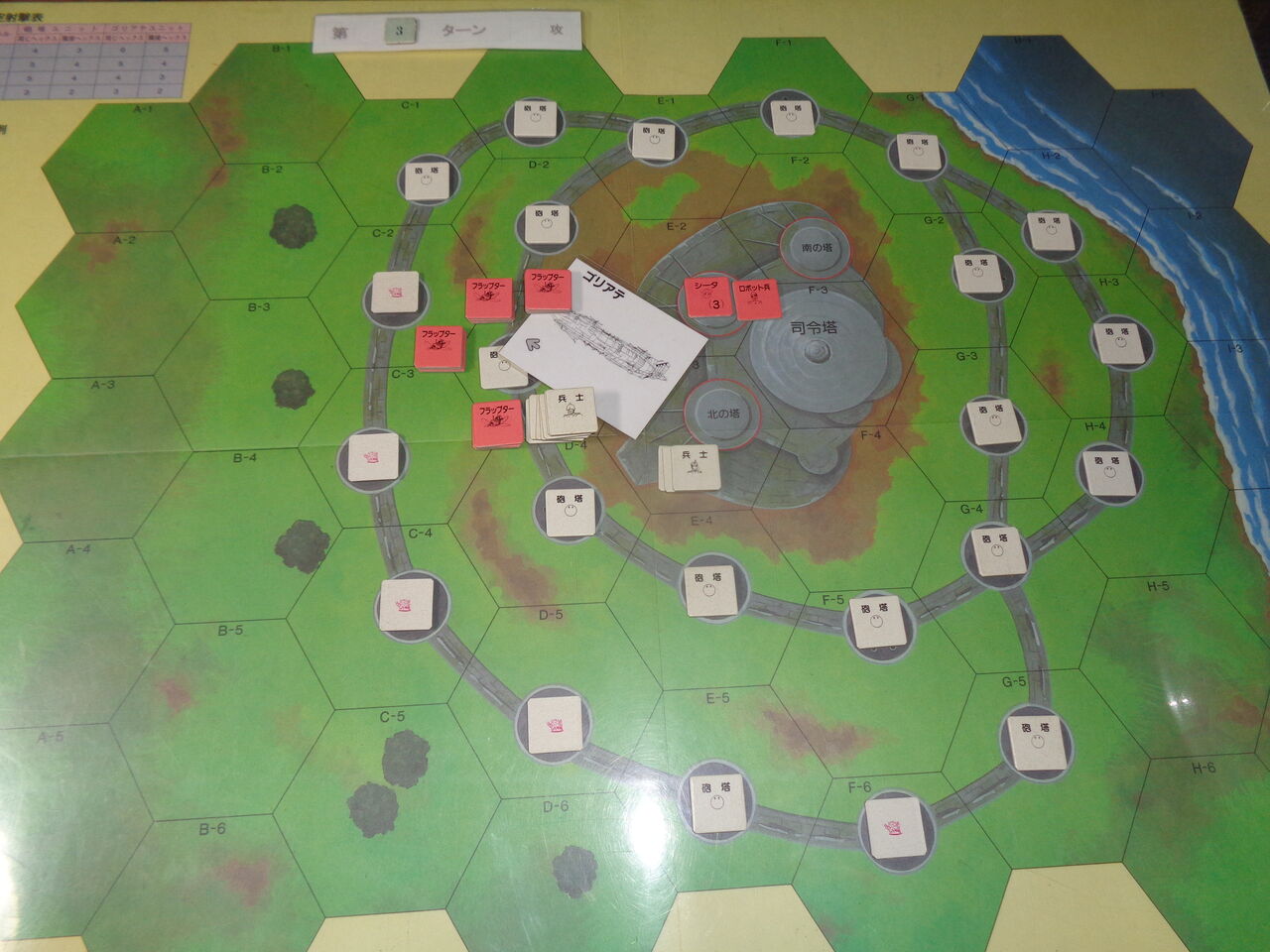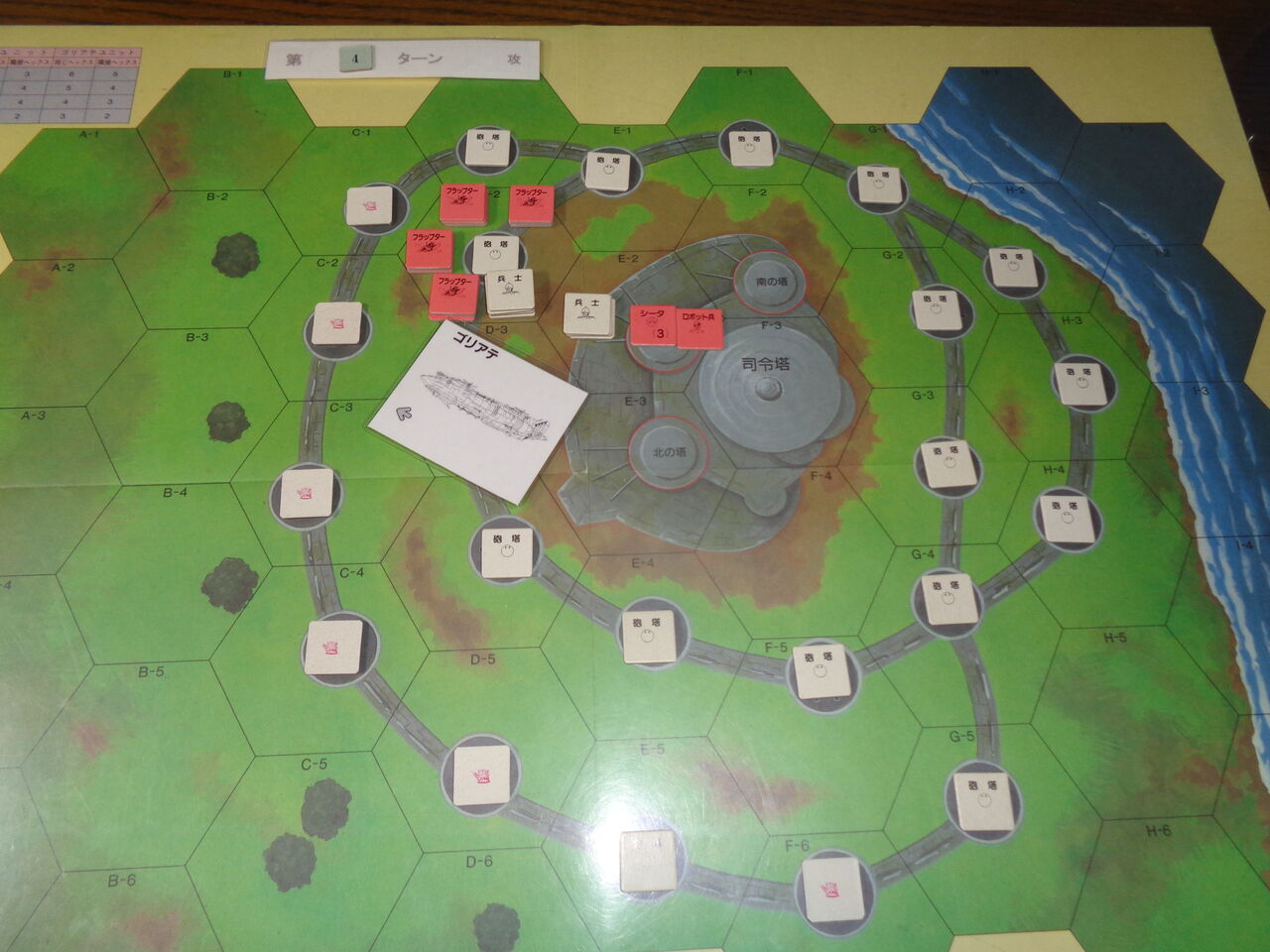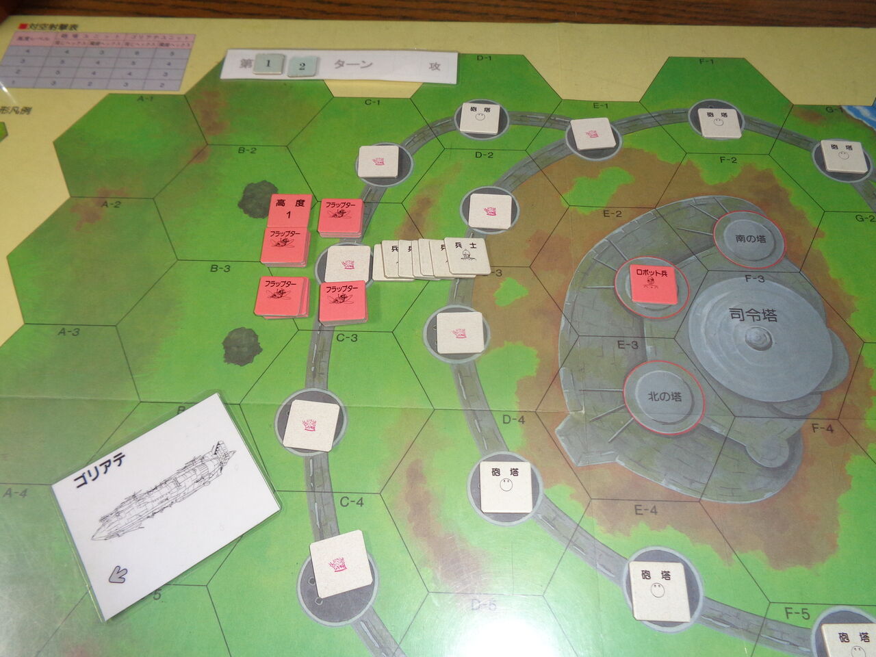 第4ターン、幸いにも、ロボット兵の火線がC1の砲塔を焼きます。発見(対空砲火)の危険から、未だ、高度を上げられない海賊は一端、D2へ。