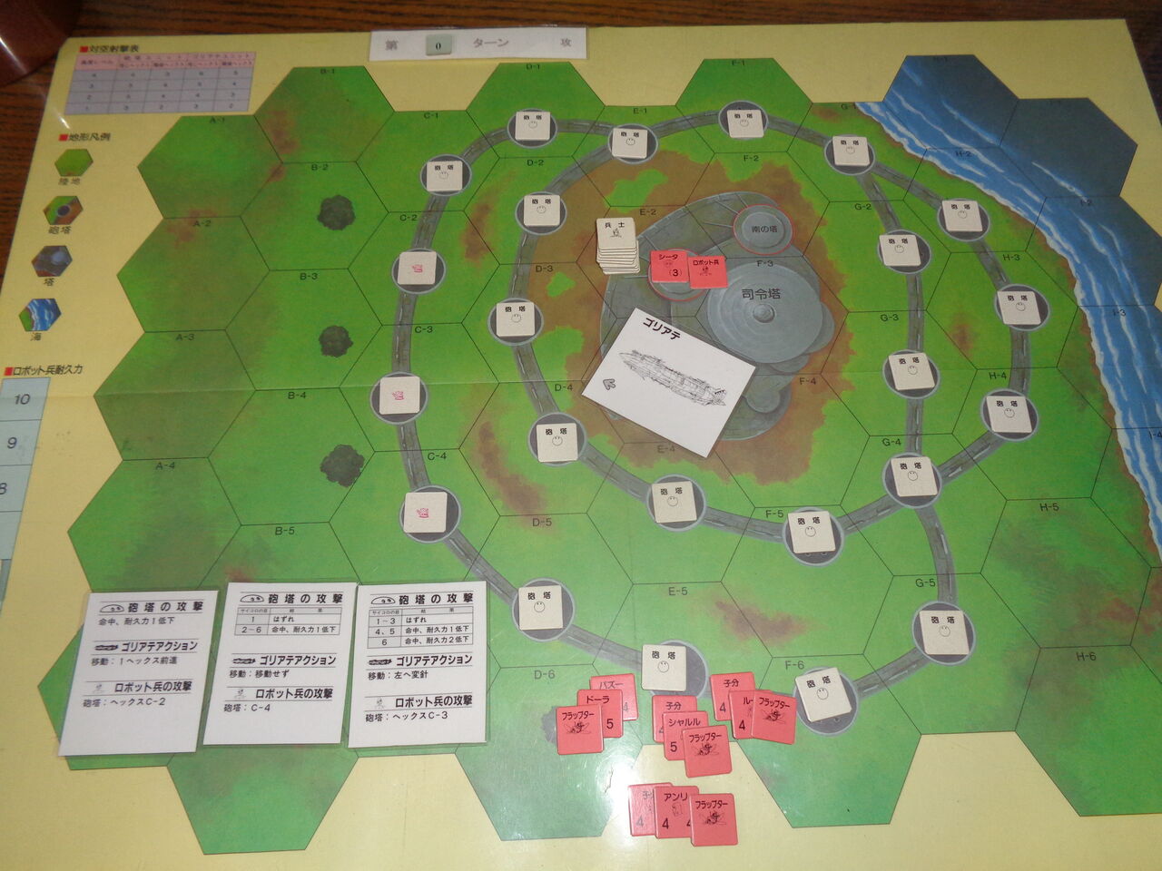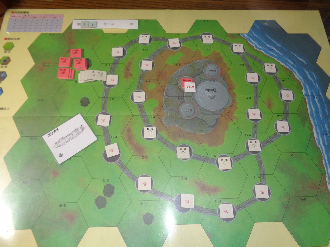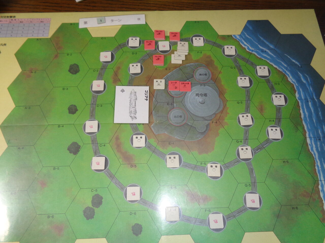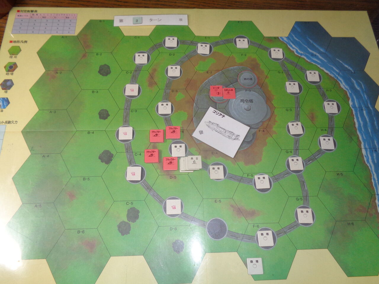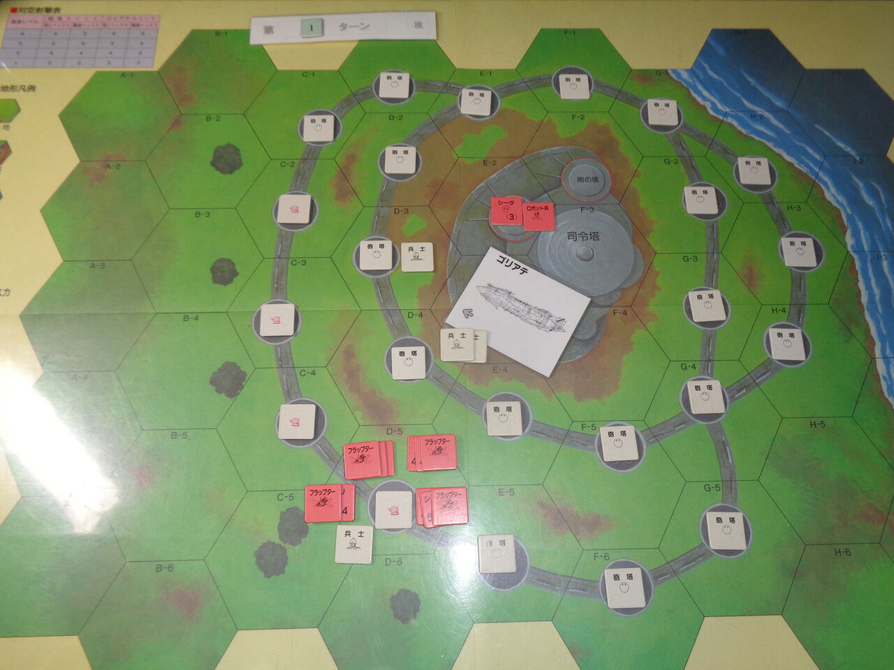 第4ターン、幸いにも、ロボット兵の火線がC1の砲塔を焼きます。発見(対空砲火)の危険から、未だ、高度を上げられない海賊は一端、D2へ。