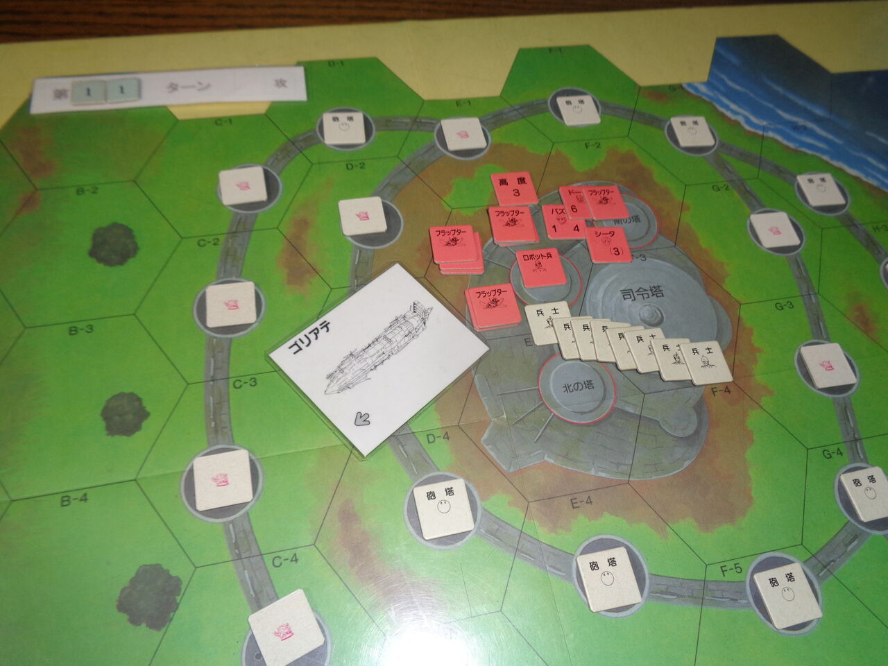 今月のソロプレイ第1弾は、「パズーのシータ奪還ゲーム-ティディス要塞」(ツクダ)です。その名の通り、ティディス要塞に軟禁されているシータを、海賊の協力を得てパズーが奪還するというものです。この時代にしては珍しいのがソロ専用という点で、イベントカードでランダム性を出しつつ、フラップターに乗った海賊がタイミングを見て、シータがいる東の塔を襲撃することになります。