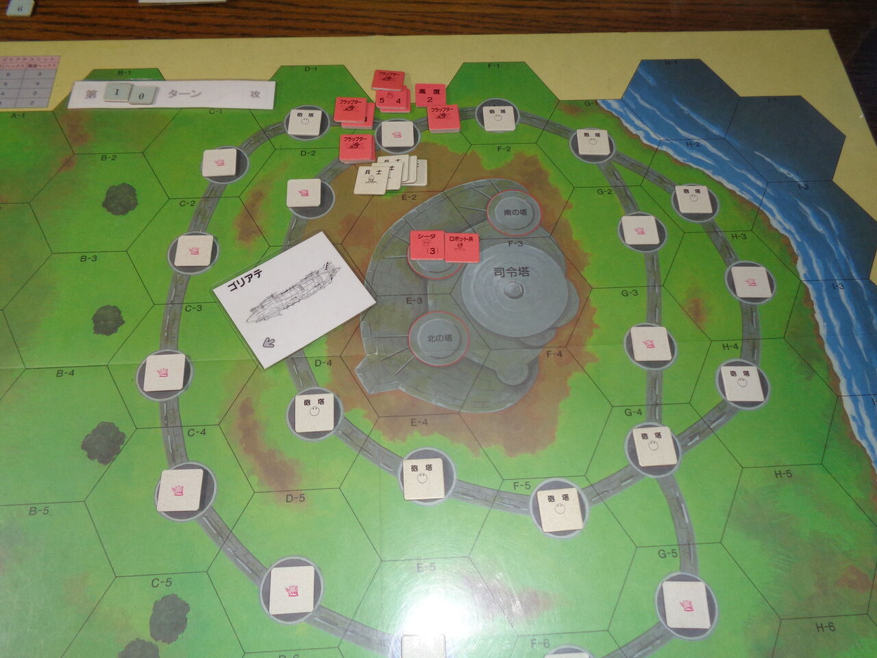 第9ターン、なんとかロボット兵が粘っているうちにと、海賊はフラップターの高度を上げ、D2へ。続いて、第10ターンには高度2へ。国防軍の兵士が海賊を追ってきますが、これにより、東塔の守衛がいなくなります。