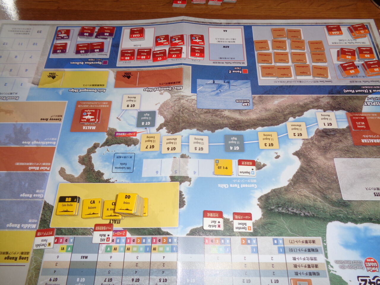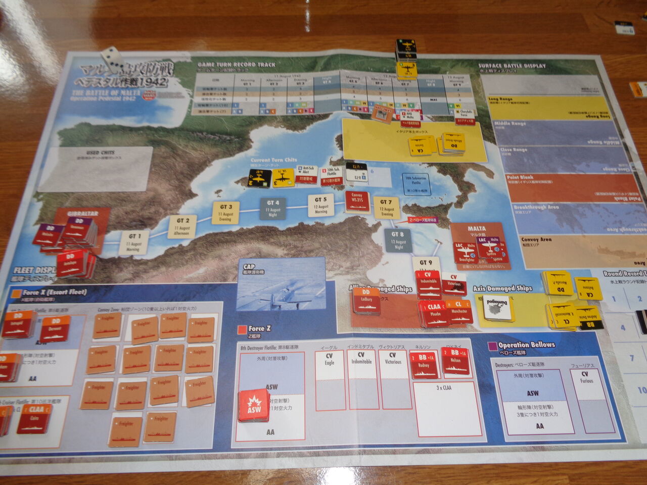 最終第9ターン、いきなり、スツーカの編隊が輸送船団を襲います。これにより、2隻の輸送船が損傷しますが、駆逐艦のアシストで、なんとかマルタに到着します。続く、SM79の空襲は、マルタ島戦闘機隊とカリディブス隊の奮闘で撃退。最後の1チットを凌げば・・・というところで、「航路変更」!Z艦隊の主力艦を失い、満身創痍になりながら、ロイヤルネイビーが義務を果たし、マルタ島は救われました。ゲーム的には、枢軸軍は艦隊撃滅に成功したものの、船団壊滅はできず、引き分けとなりました。