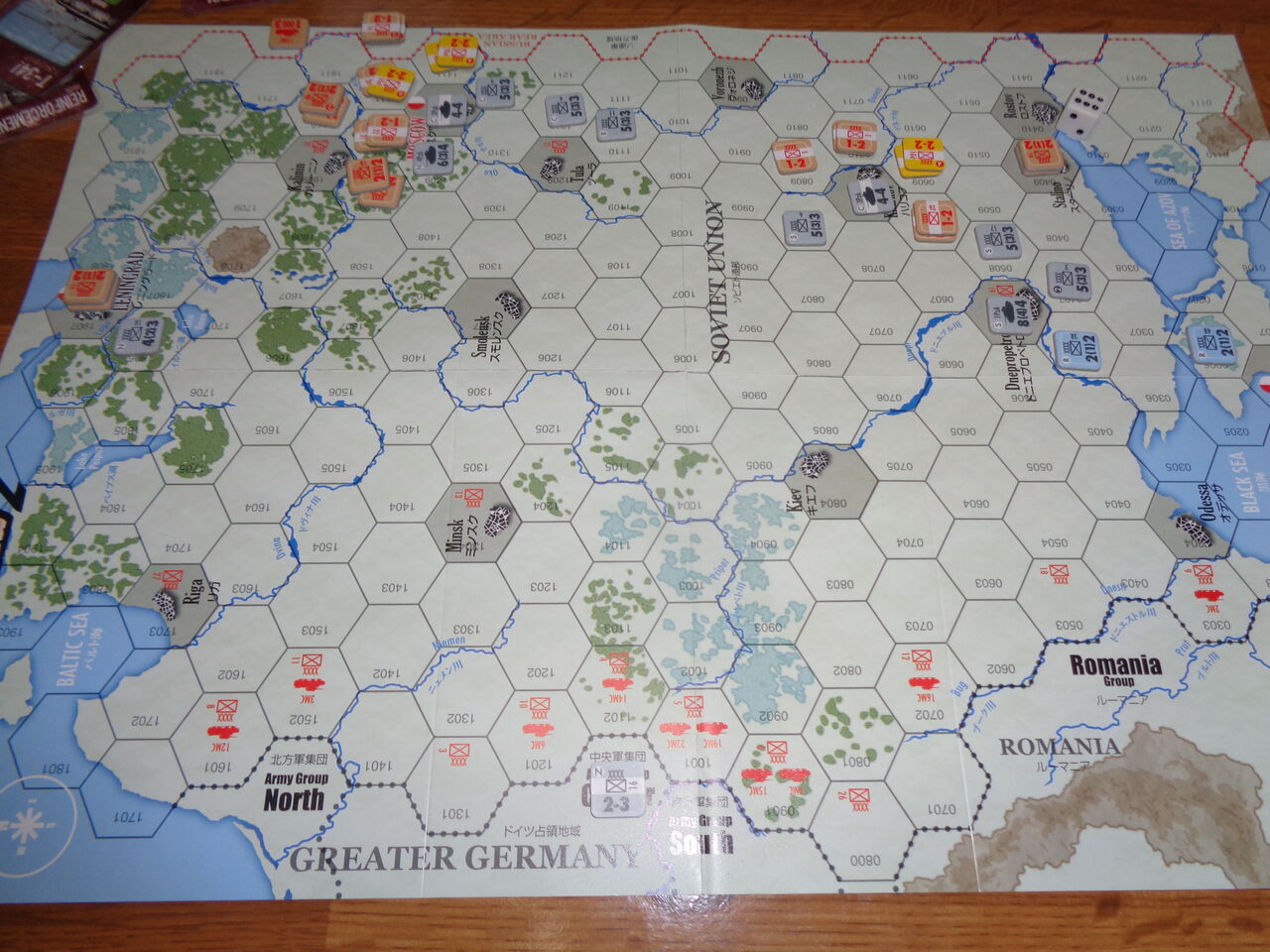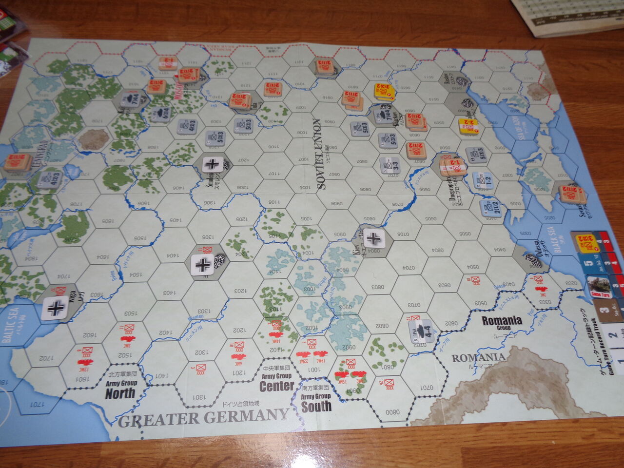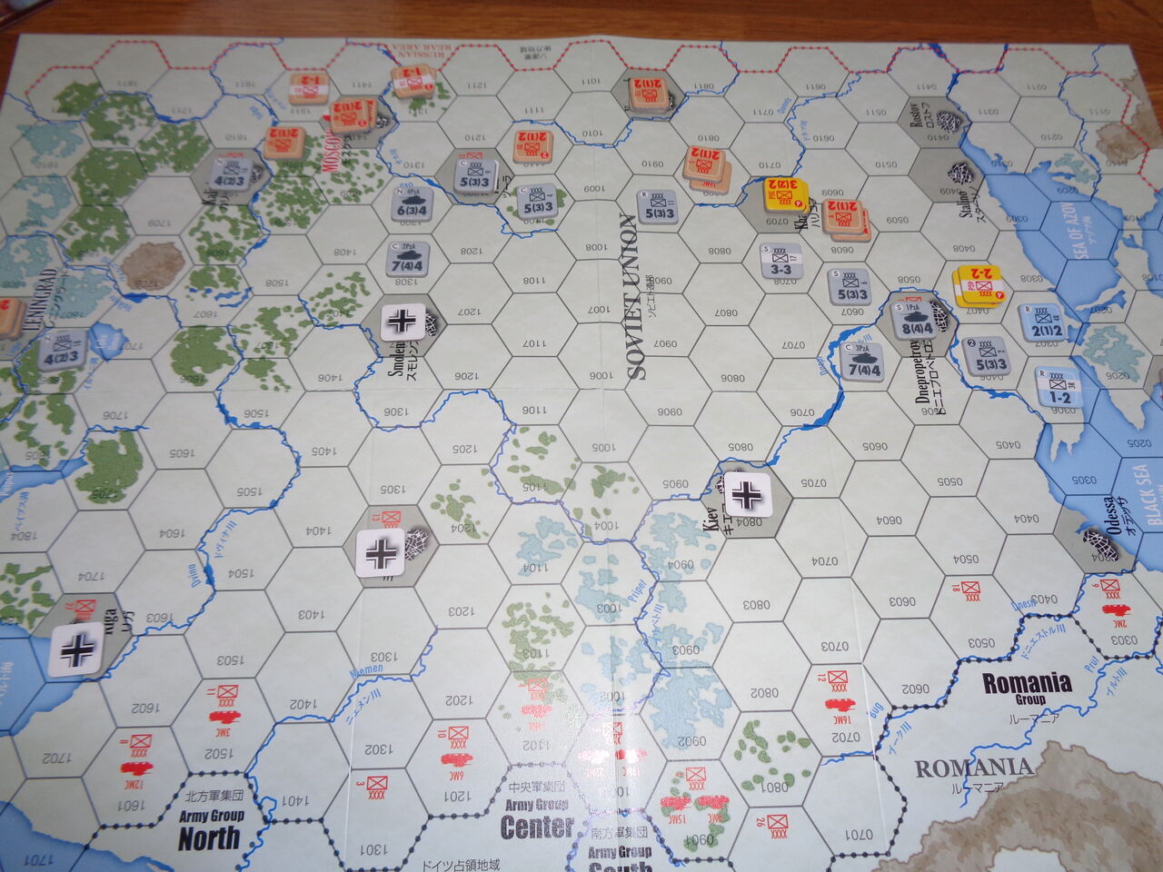 第1ターン、北方では力押しの攻撃で戦線を食い破り、装甲軍集団が背後に展開、ほとんどのユニットを補給切れで除去します。南方もルーマニア化の攻撃が成功し、包囲により前線部隊を排除します。