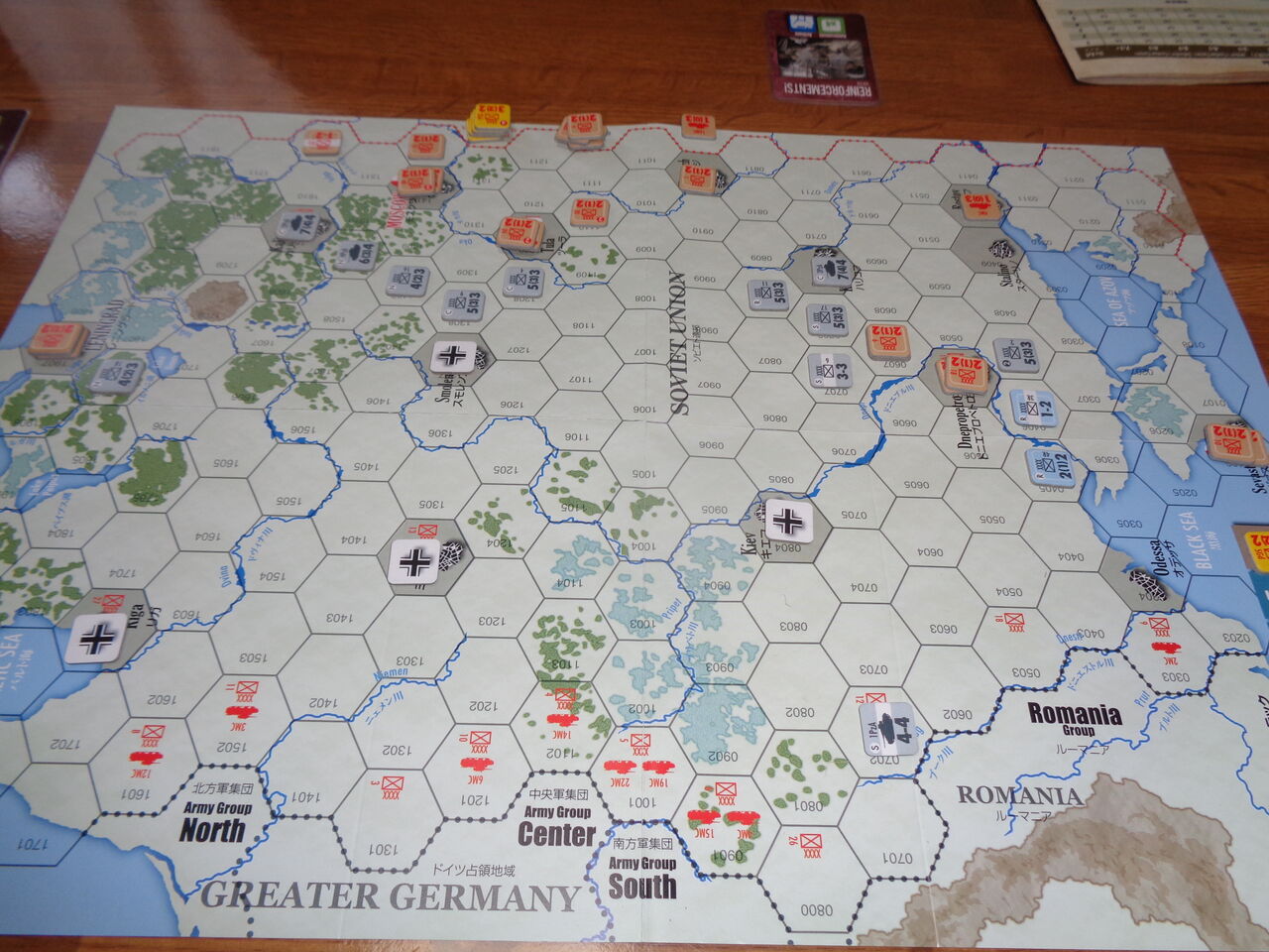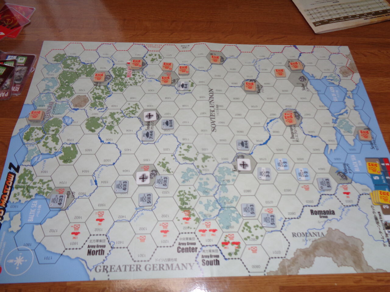 この日、最後にプレイしたのが「モスクワ電撃戦2」(Bonsai Games)です。2と言いながら、元の「モスクワ電撃戦」(CMJ)とは別のゲームでして。規模やシークエンスは似ているものの、通常の戦闘ルールだったり(以前は同一へクス内戦闘)、カードを使用した兵站のプランニングだったり、とよい意味で選択肢が増えています。枢軸軍(mitsu)対ソ連軍(ybs)です。