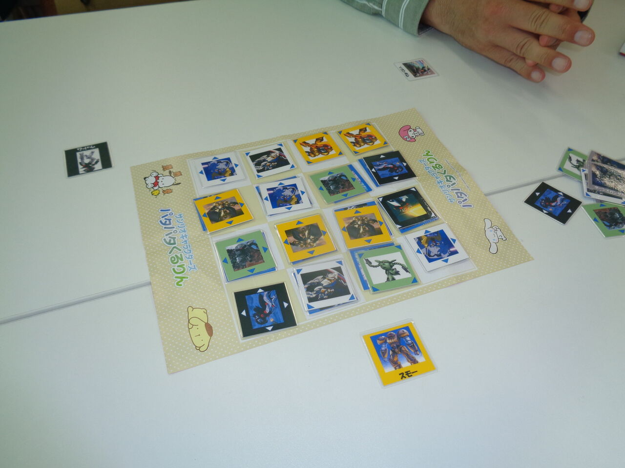 終盤、キャシャーンとガッチャマン、テッカマンの三つ巴になり、ほぼ同数で最終カードに。ここは自分の手番だったのですが、なんと、置きたくない矢印のせいで、自分が1枚減って、敵が1枚増える最悪の一手に。そう、このゲームでは、運も左右するんです。結果的にエンジョウさんが宇宙の騎士テッカマンで勝利しました。とほほほ・・・。