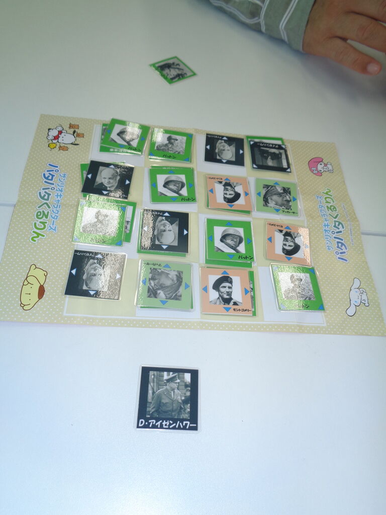 が、先手を打ったのはエンジョウさんで、いずれにしろ、マックの勝ちはないだろうからと読んで、次にアイクの排除をします(しかし、やたらとパージカードが行くな~)。それでも正体を読ませず、最終局面まではアイクが1枚多かったのですが、最後の最後の配置で、アイクとパットンが逆転!やはり、エンジョウさんがパットンで、逆転勝利となりました。