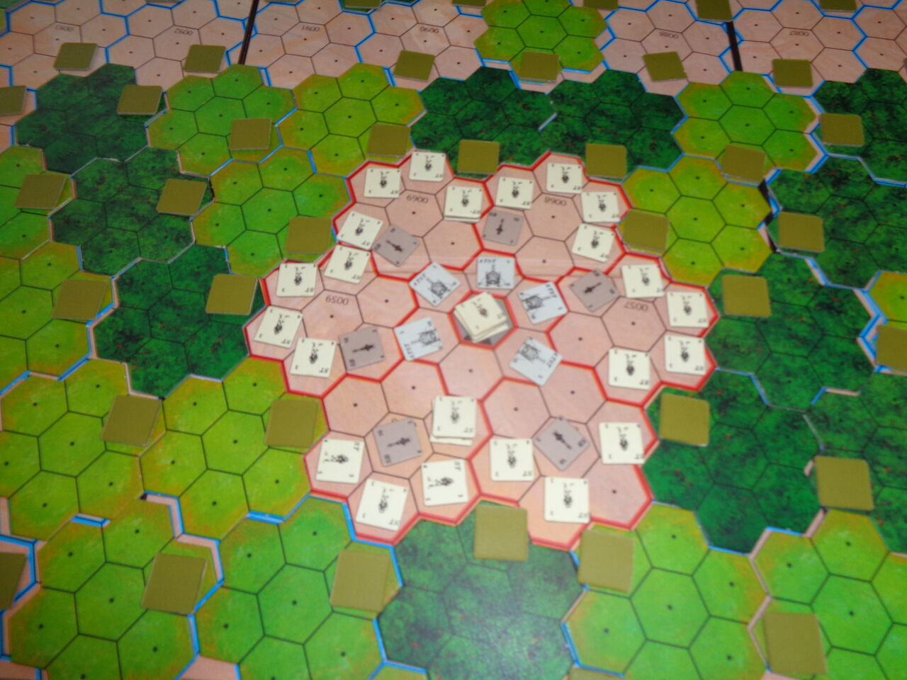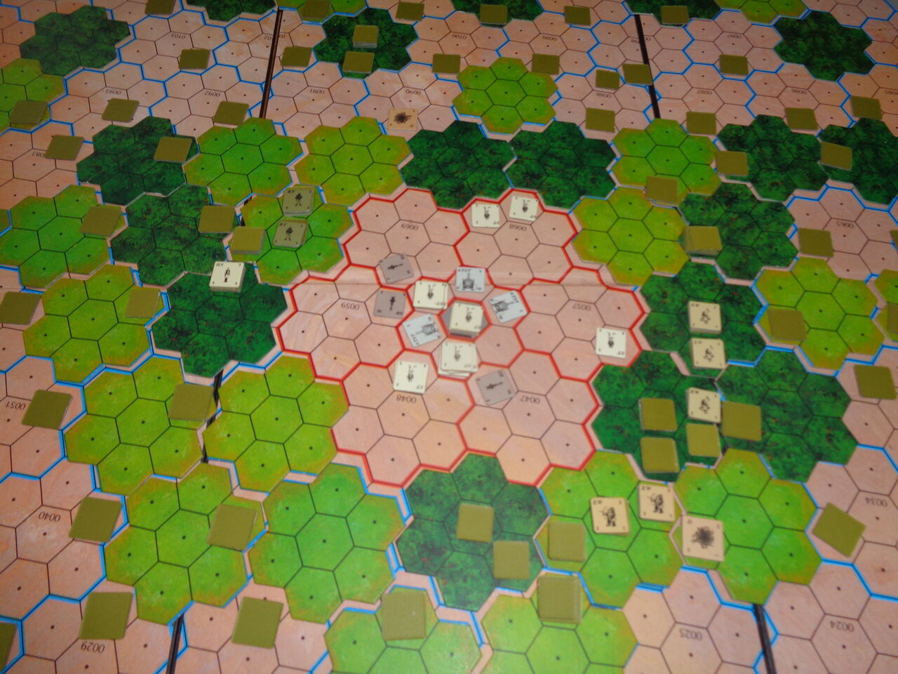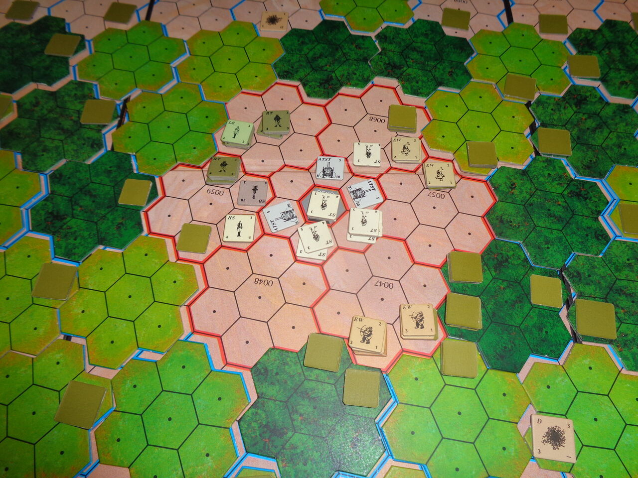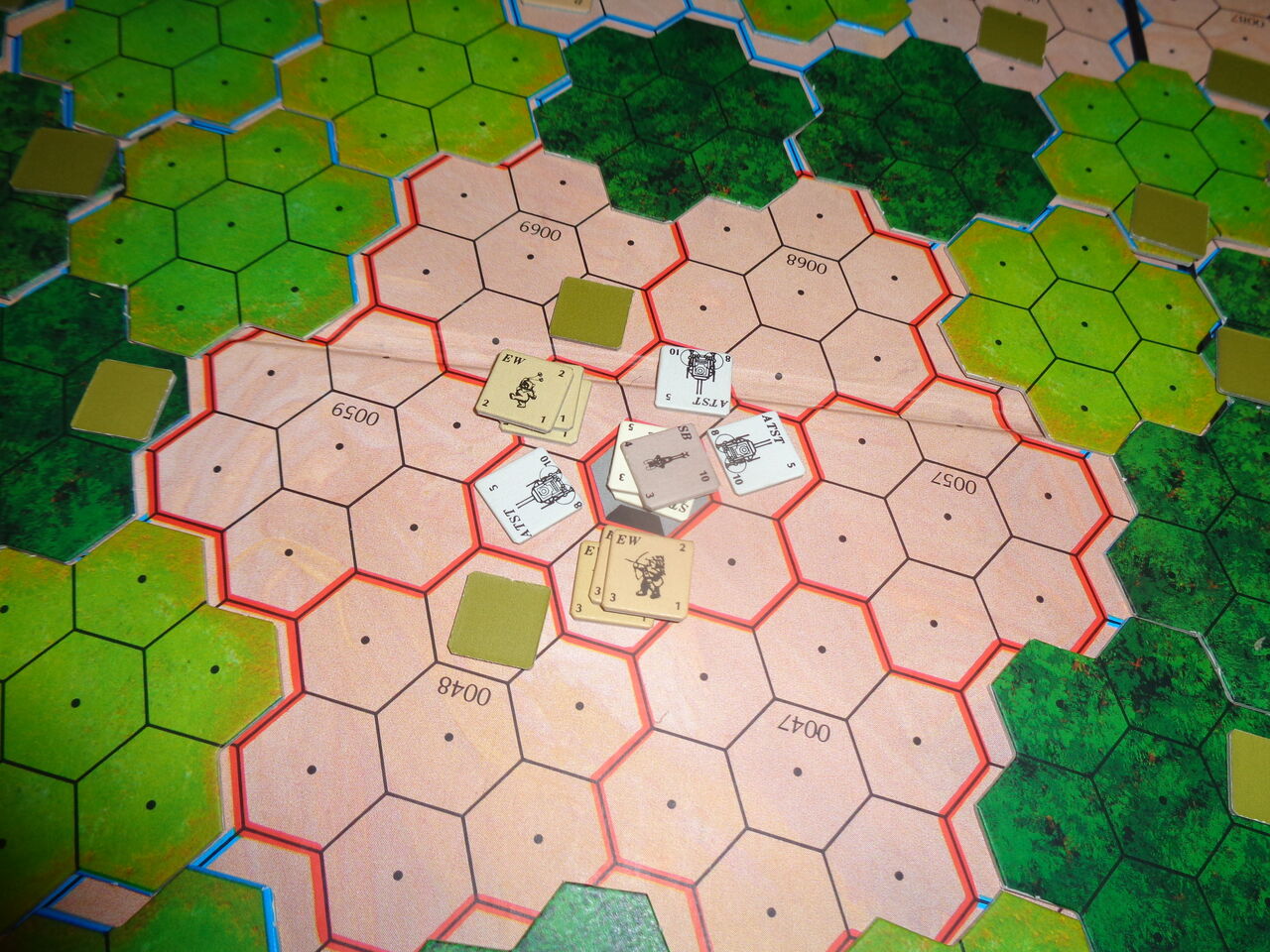 ・帝国軍は最低30メガへクス(司令部入口周辺の7メガへクスを含む)の安全を確保しなければならない(勝利条件)。そのためには、このメガヘクスのトラップ(ダミーを 含む)を全て明らかにする。