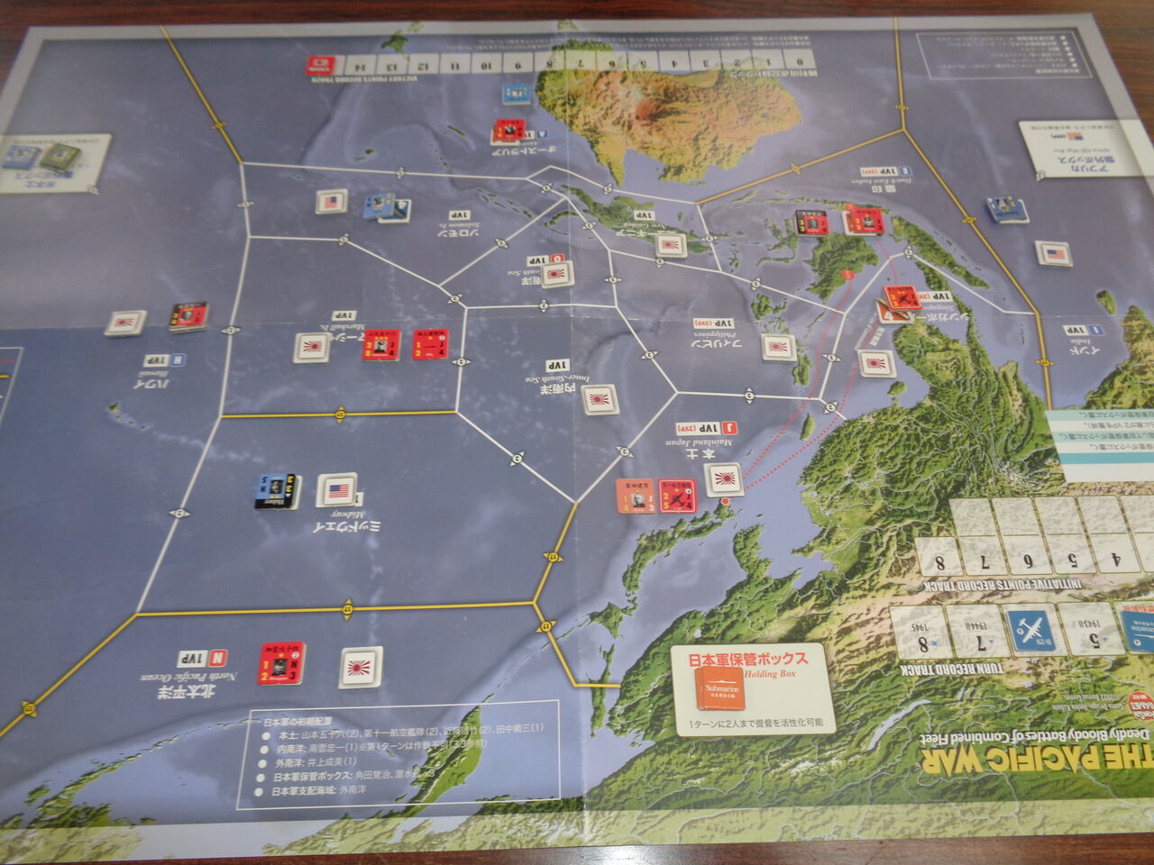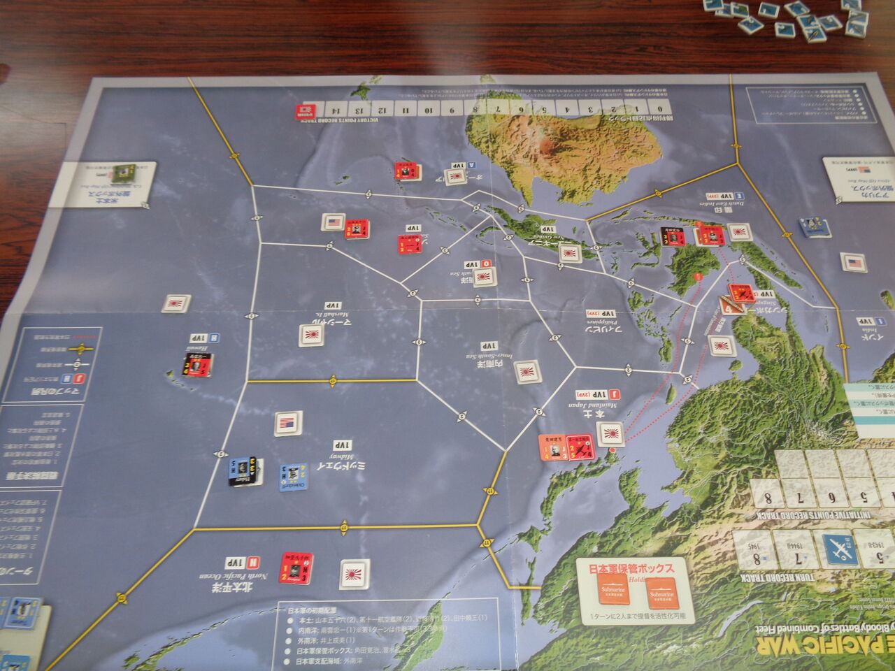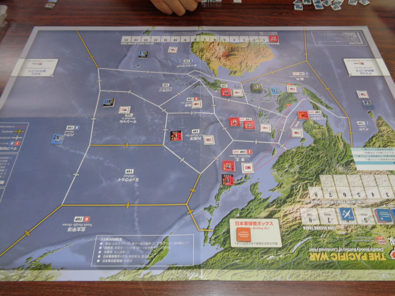 続いて、mitsu持ち込みの「太平洋戦争-血戦!!連合艦隊-」(Bonsai Games)をプレイしました。陣営は、日本軍(mitsu)対連合軍(morita)です。事前のソロ演習で、長引けば長引くほど、連合軍に有利になるので、日本軍としては速攻を心がけます。