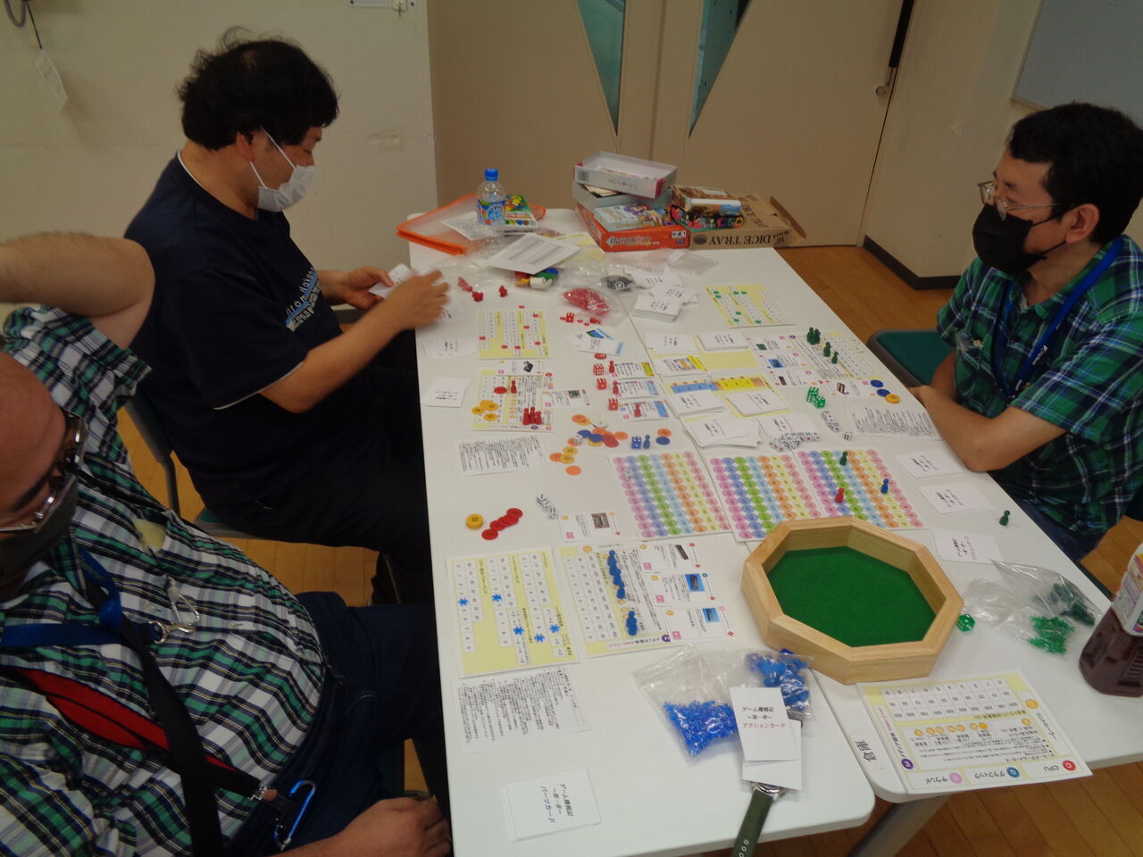 例会終盤にプレイされた「ゲーム機戦記第1章」(グループ乾坤一擲)。質の高いゲーム作りで定評のあるグループ乾坤一擲の平さんがデザインし、テストに持ち込みました。任天堂とかセガとかソニーとか、懐かしいゲーム開発会社となって、優秀なゲーム機を作るのが目的で、平・BIBI・kawaの3人でプレイ。傑作ゲーム機の製作に成功したBIBIさんが勝利したそうです。