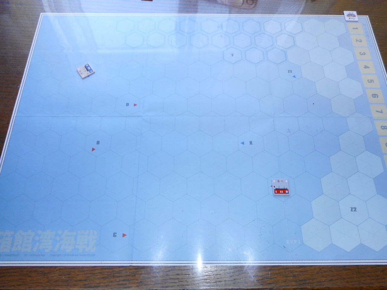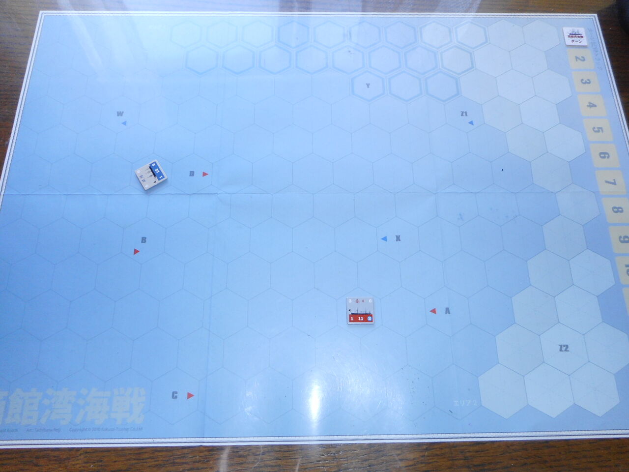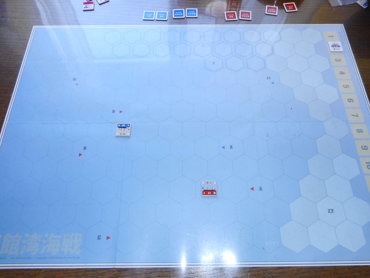 第4ターン、幕府軍の回復チットが無駄になった直後に、新政府軍が砲撃するも、やはり当たらず。と、同様に新政府軍の回復チットが無駄になった直後に、今度は幕府軍が砲撃。これが春日を夾叉し、混乱状態にします。