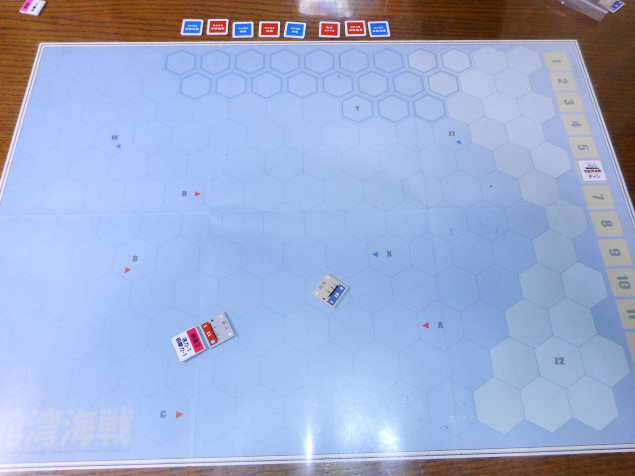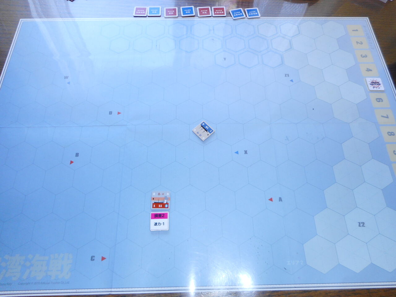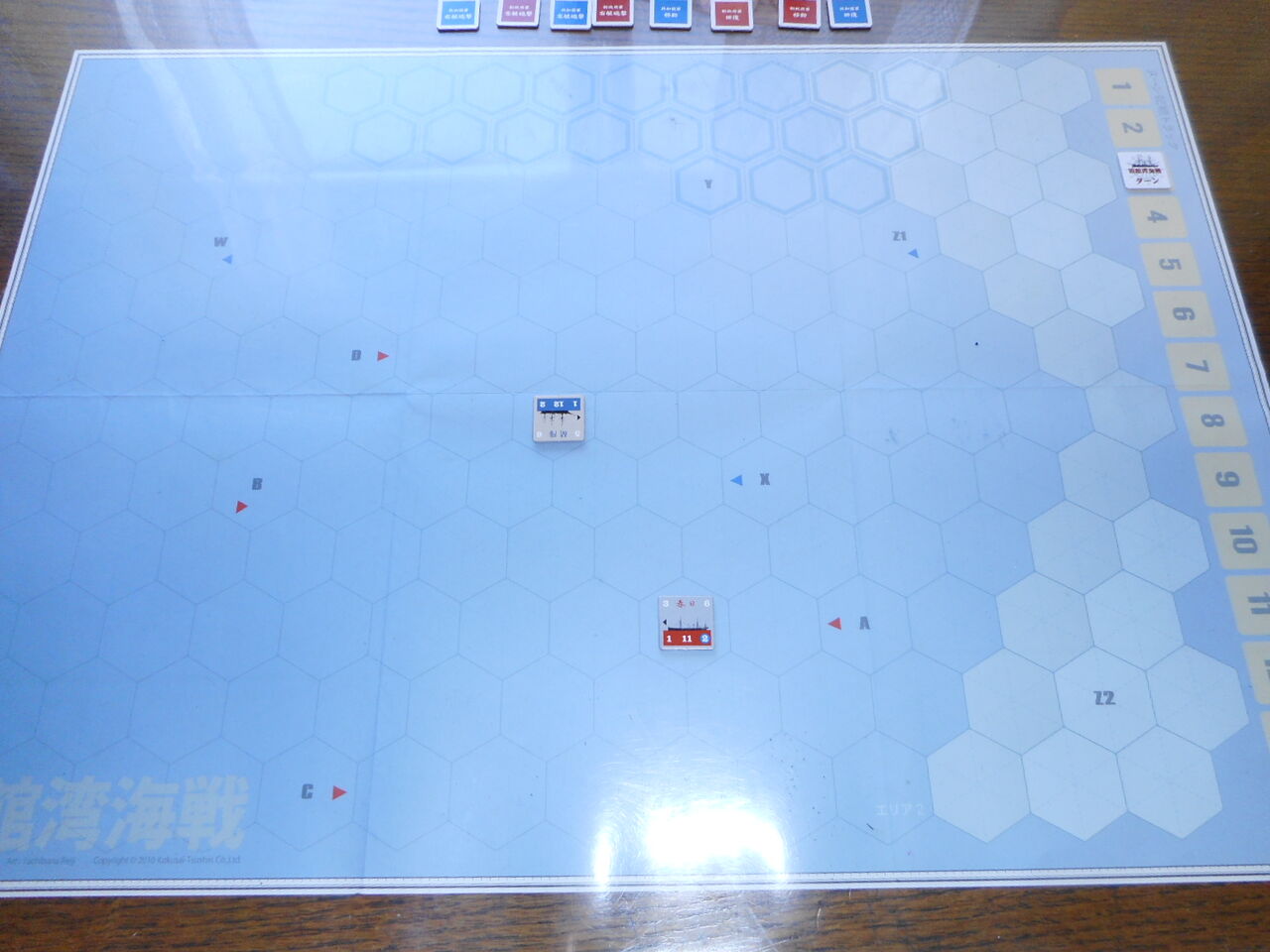 移動は移動力分だけ、前進できますが、最大でも2なので、予測はしやすくなっています。旋回は1へクス移動する度に60度回頭ができ、移動しなければ120度まで可能です。ただし、回天や春日といった外輪船は小回りが利かないので、移動後に60度のみの旋回となっています。