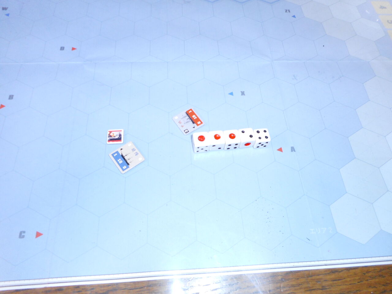 今月のソロプレイ第2弾は、せっかくなので、ヴァリアントシナリオの甲鉄対開陽に移ります。甲鉄(ストーンウォール)は、ゲーム最強の装甲2と防御力18を誇り、火力こそ3ですがアームストロング砲の効果でダイス1つを裏返せる能力を持ちます。よって、開陽といえど、よほどのことでなければ、有効弾(3打撃以上)は難しく、やはり混乱の積み重ねによるダメージを狙います。