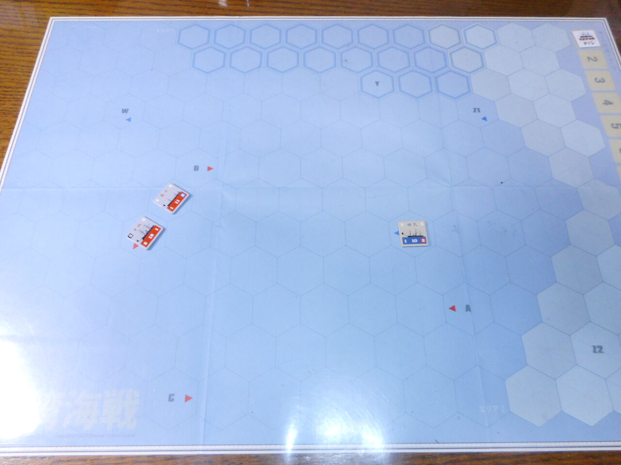 初期配置は固定で、新政府軍艦隊の左舷から共和国軍の回天が接近するところから、スタートです。