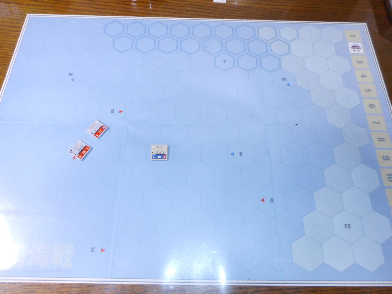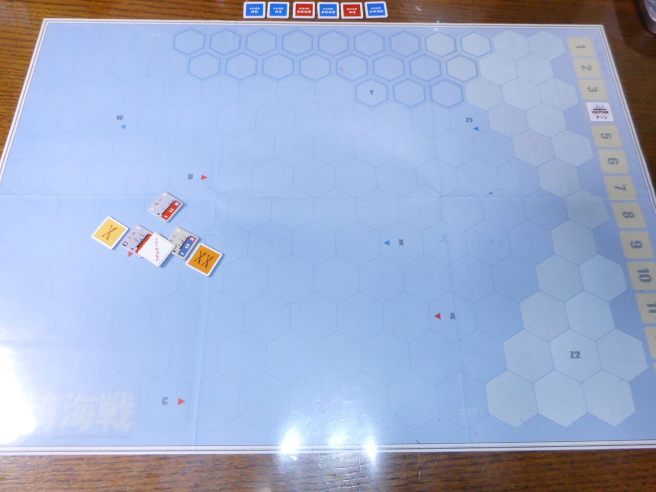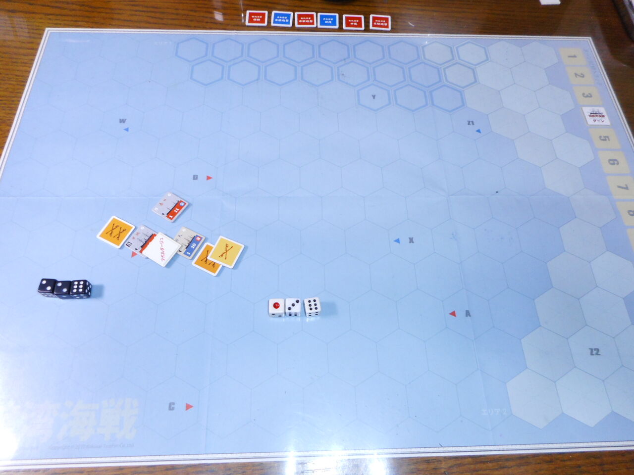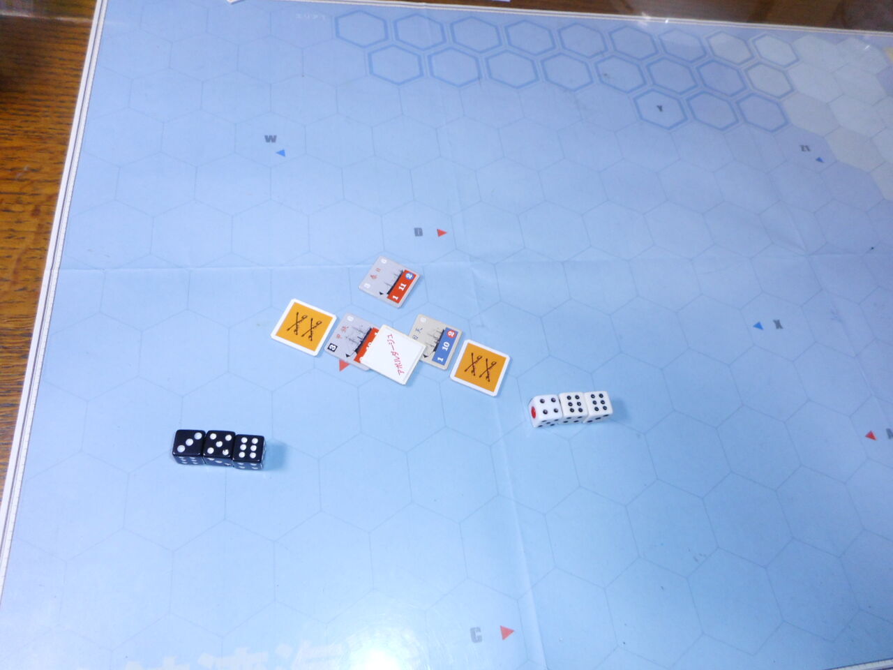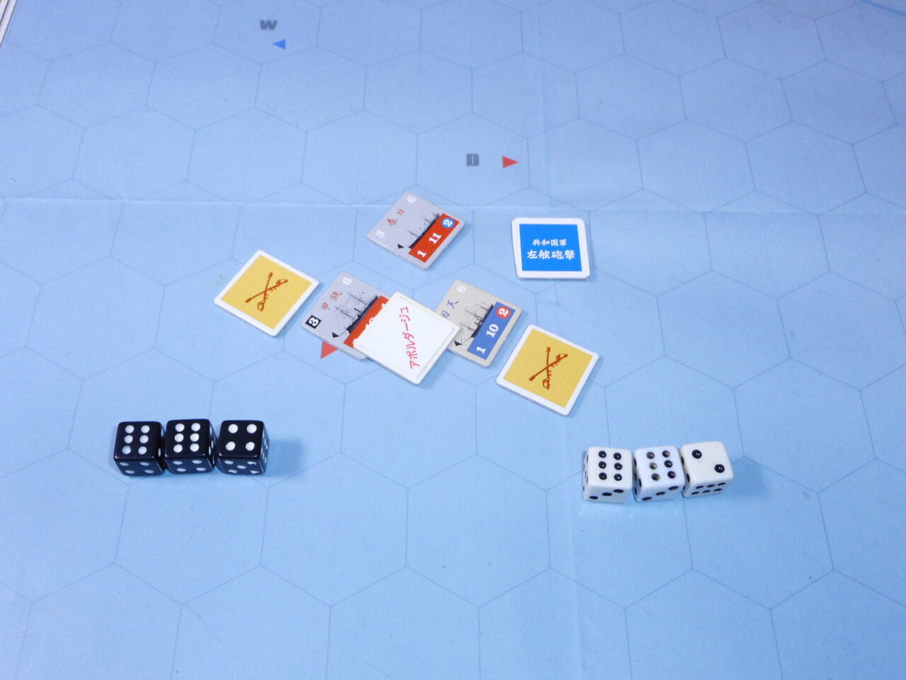 また、共和国軍は甲鉄にアボルダージュを実施できます。両軍とも砲撃力分のdrをして、揃い目の分だけ、敵の人員に損害を与えられます。これが3ヒットになると、乗っ取りに成功します。もっとも甲鉄は、回天と同じ3砲撃力があり、かつ、ガトリング砲の威力(dr1個を裏返せる)から、アボルダージュでも有利です。