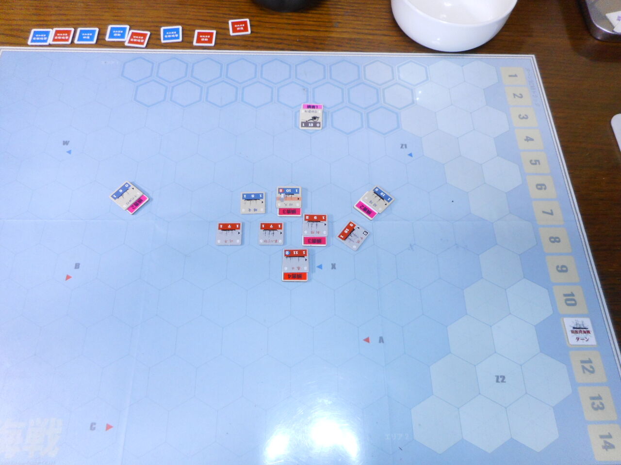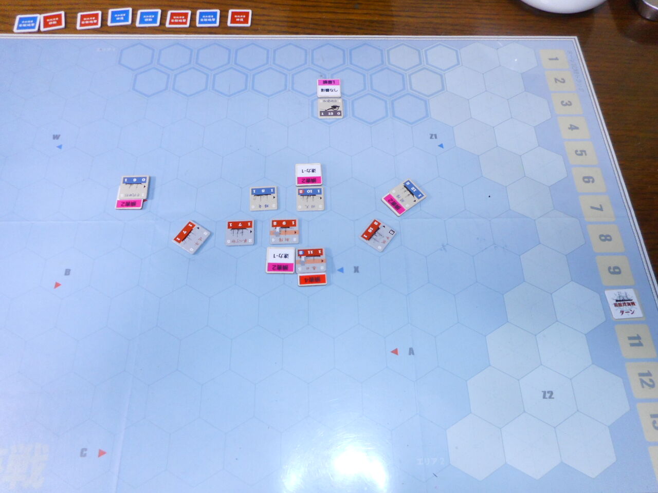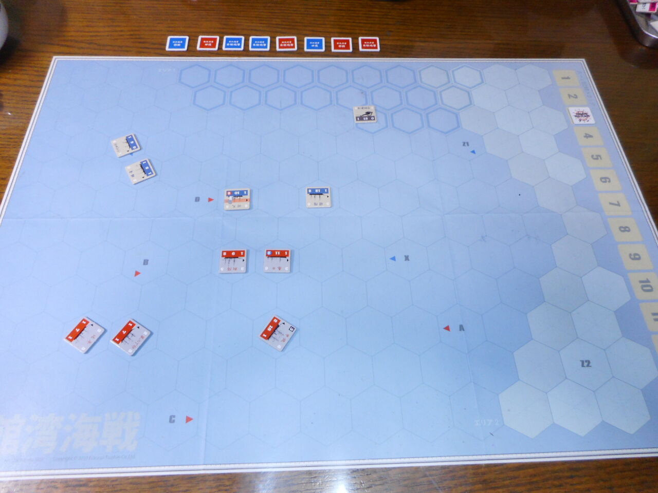 第5ターン、両軍の低速艦が追いつき、横二線の単縦陣の撃ち合いが開始となります。