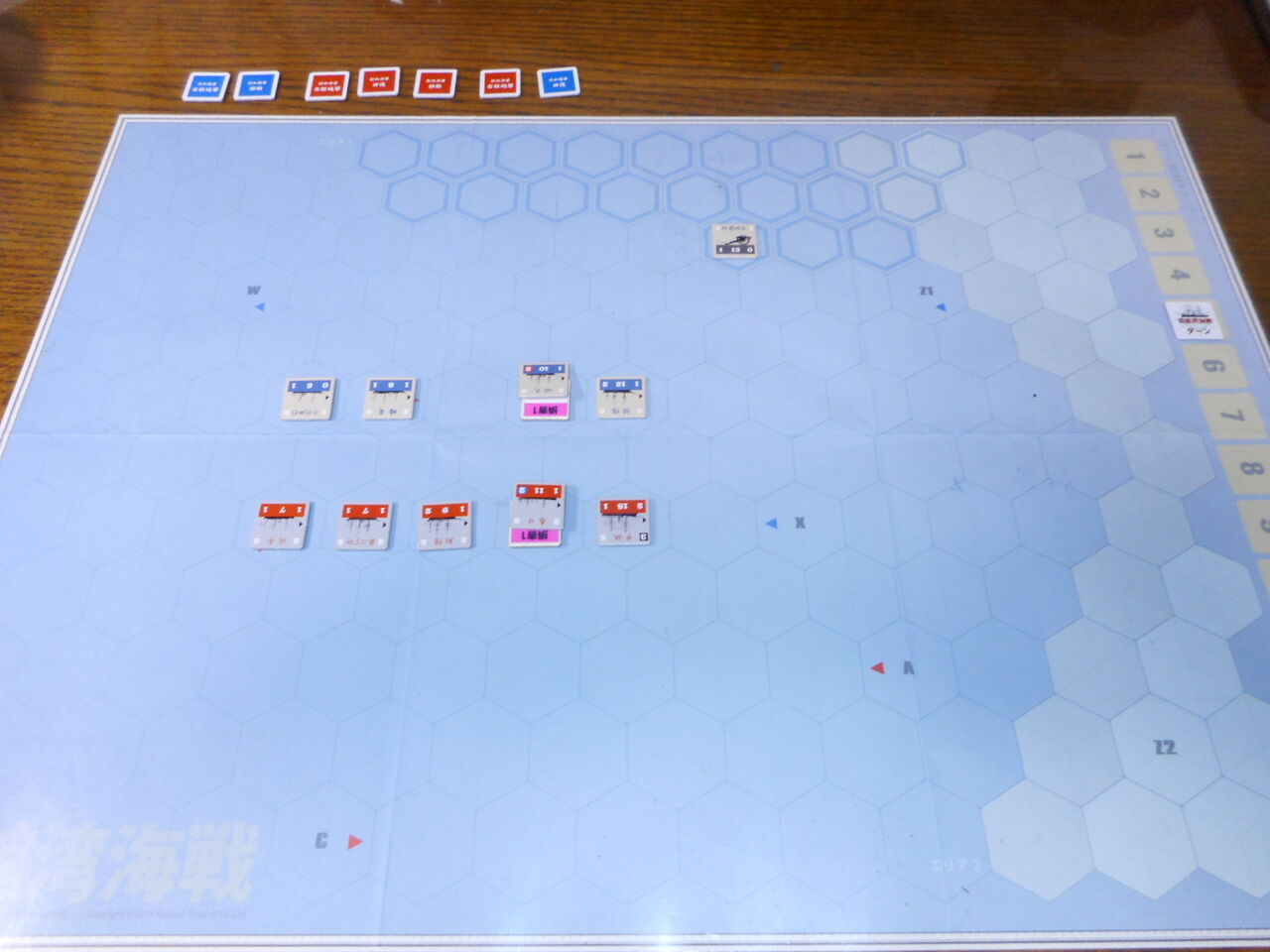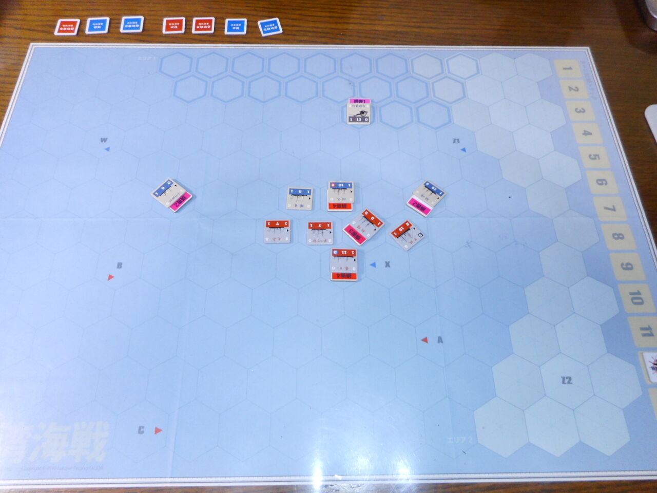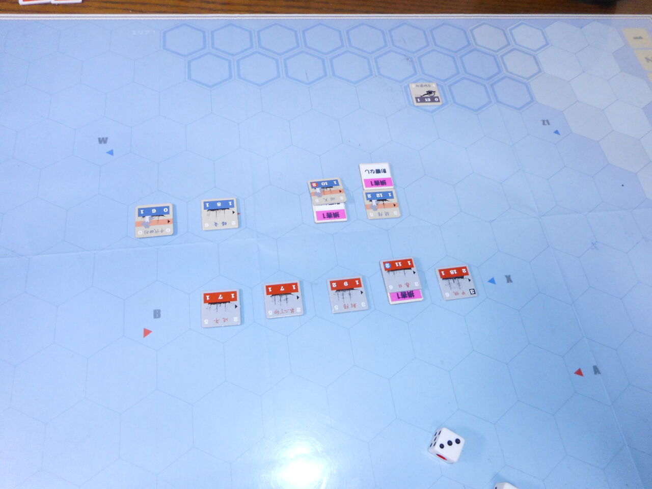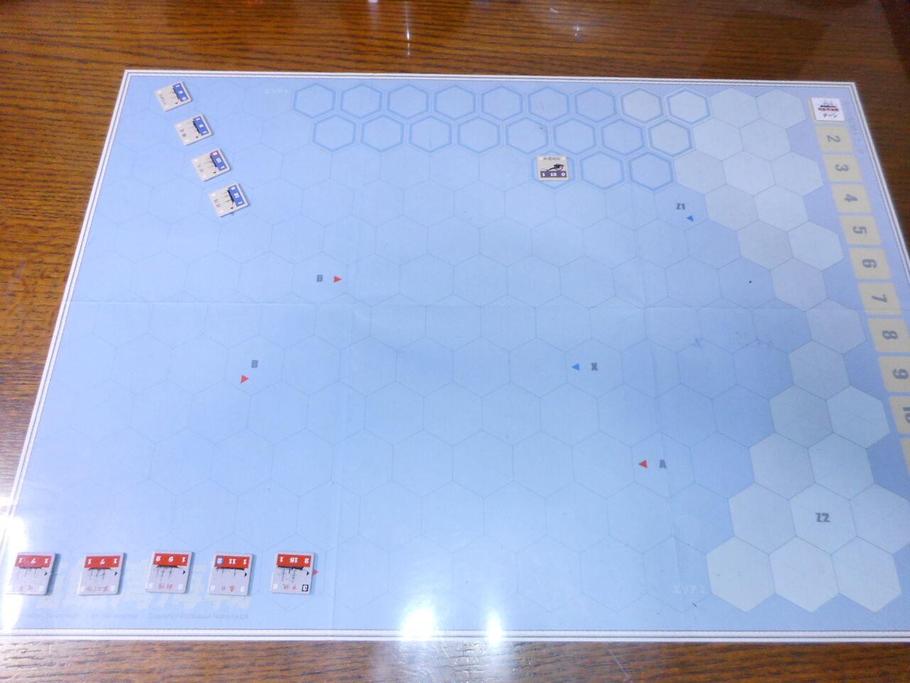 第5ターン、両軍の低速艦が追いつき、横二線の単縦陣の撃ち合いが開始となります。