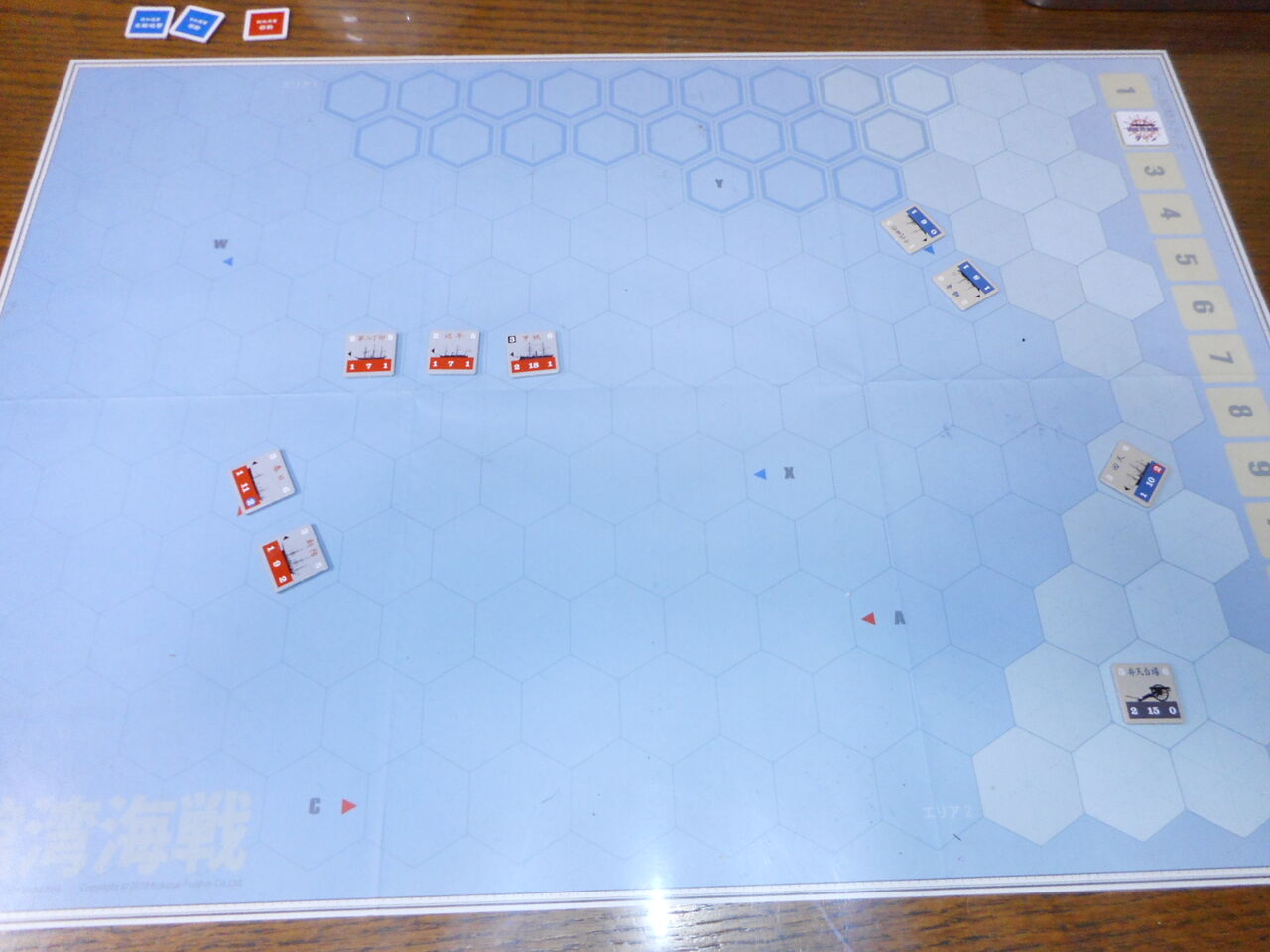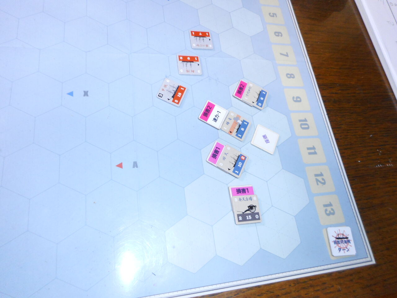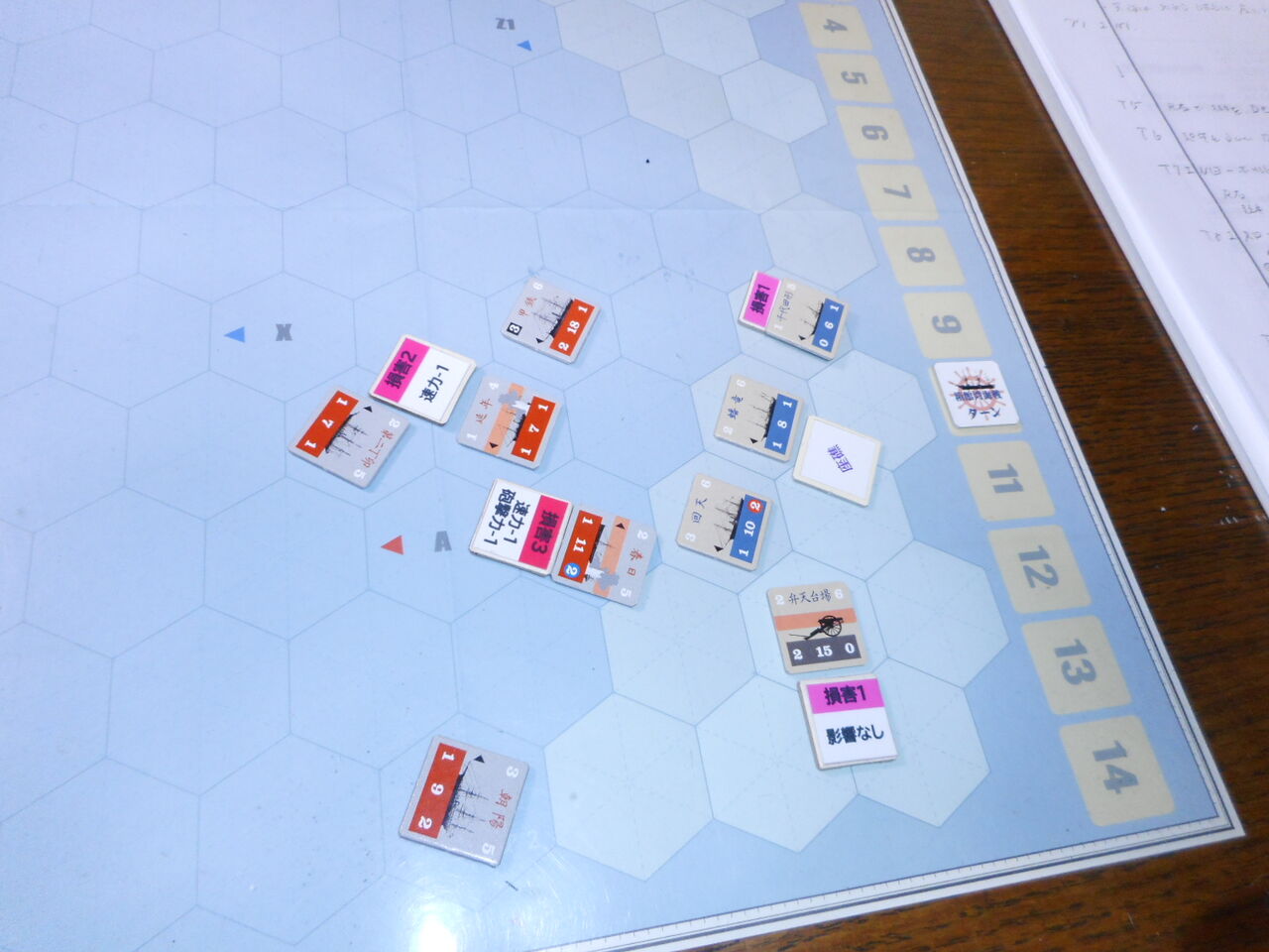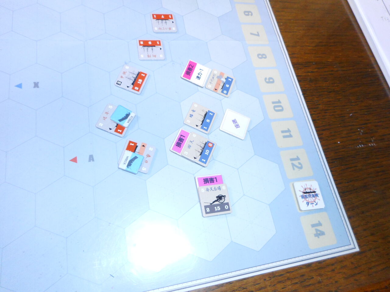 第11ターン、艦隊移動中のため、効果的な砲撃ができない新政府軍に対し、共和国海軍が集中砲撃を連続し、春日と延年を大破(移動・戦闘不能)に。続く、2ターンの攻撃が止めとなり、両艦が沈没します。この時点で両軍の損害は、新政府軍10:共和国海軍4とダブルスコア越えに。