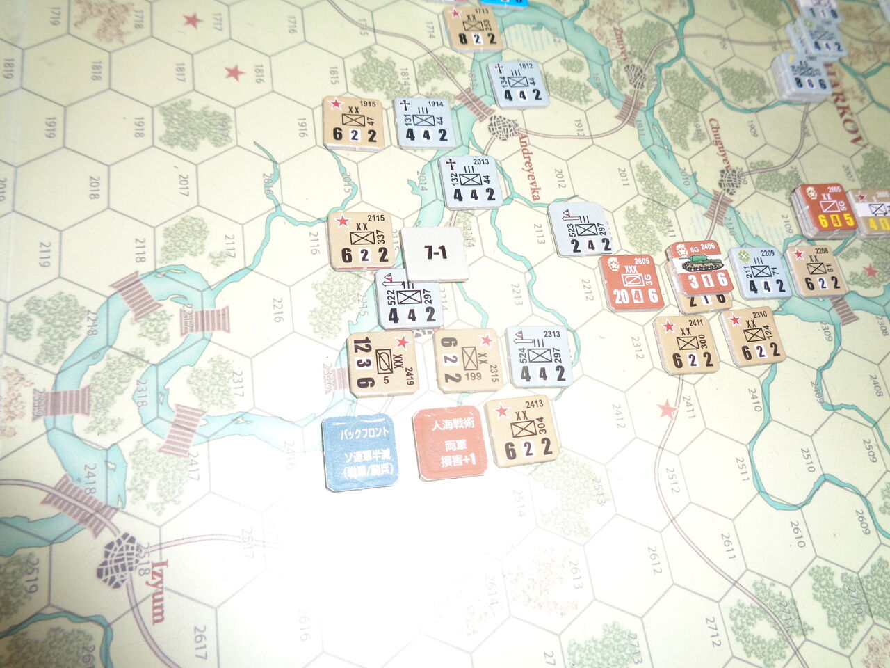 主目標のバラクレイア橋頭堡では、ドイツ軍がパックフロントで9:1攻撃を6:1まで低下させたものの、ソ連軍drがよく、3ヒットを受けます(2へクスの退却により、1ステップロス)。さらに包囲下の7:1攻撃では、ソ連軍dr12と絶好調で、町に籠もる歩兵が殲滅されます。さらに、ランダムイベントでソ連軍の移動となったため、ハリコフ方面の第294歩兵師団を包囲します。