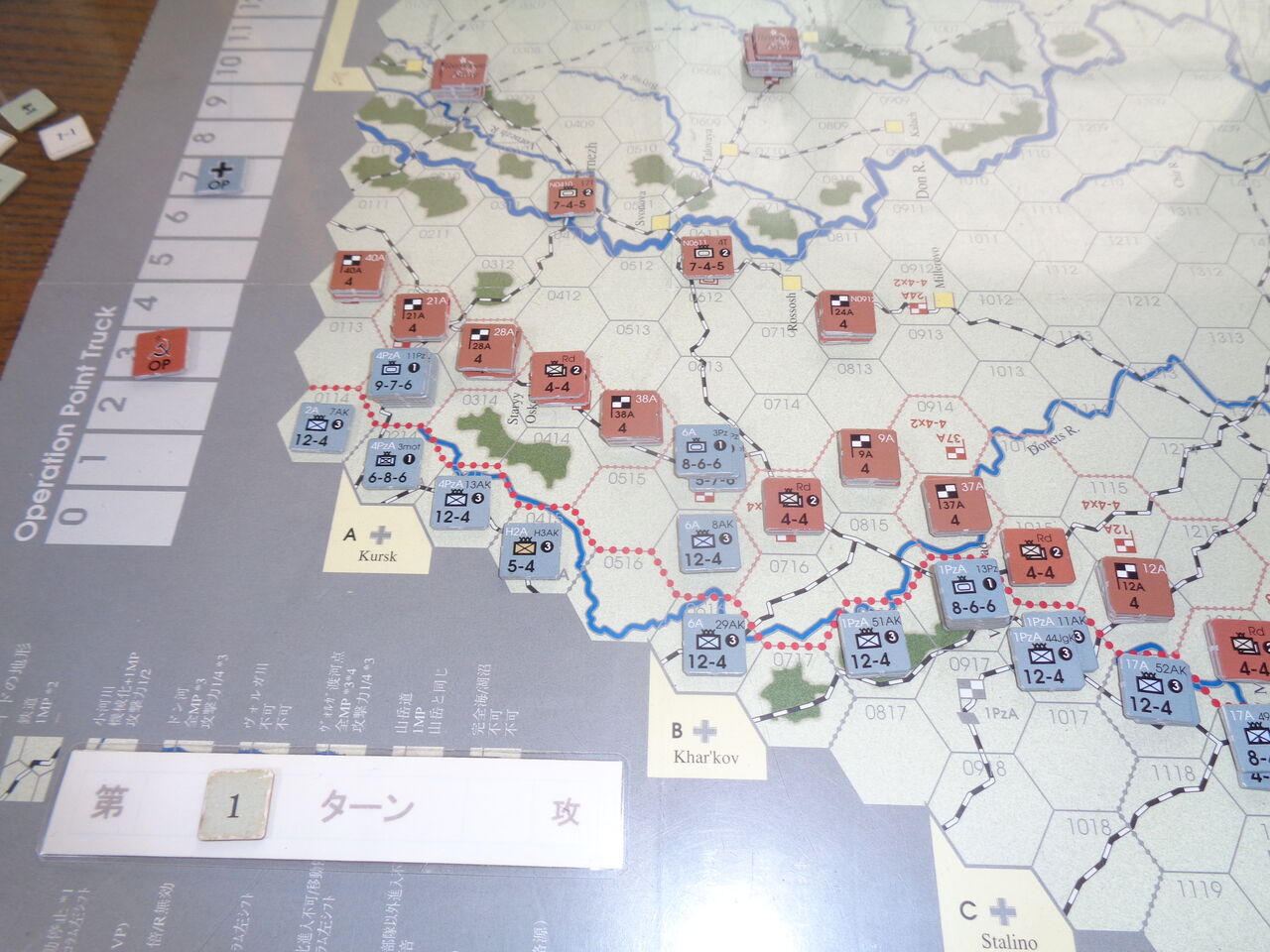 このゲームの肝は、ランダム・インパルスと作戦ポイント(OP)です。ターン開始時に両軍はdrして、大きい側がインパルスを実行できます。インパルスを取れば、自動的に1へクスの移動が保証されますが、通常移動力を発揮するには枢軸軍は6スタック価ごとに1OPを、ソ連軍は司令部ごとに1OPを消費する必要があります。ZOCは弱ZOC で、1へクス移動や通常移動でも浸透ができます。