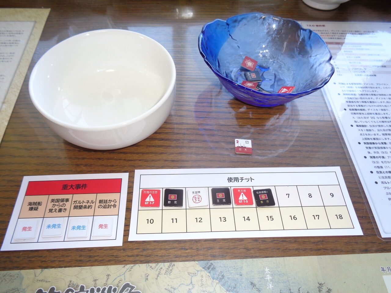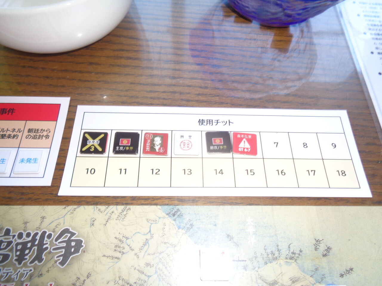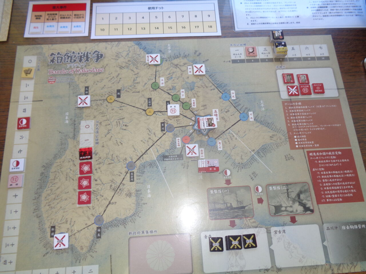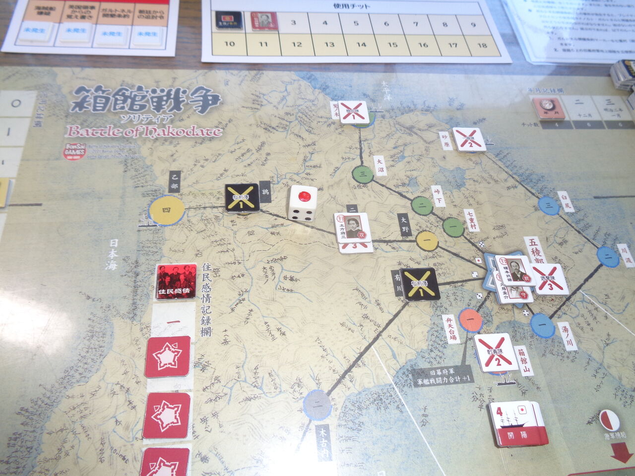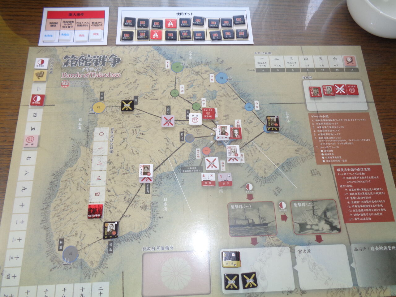 このチットが24枚あり、新政府軍の総攻撃、主攻、助攻、艦隊移動(と海戦)に、悪天候や列強の注目などのイベント、旧幕府軍の人材や防御施設など、専用サマリーがついているくらい。事件も、海賊船嫌疑やガルトネル開墾条約、住民との摩擦、遊軍隊の暗躍、艦砲射撃など、11種類の多彩な内容が起こりえます。