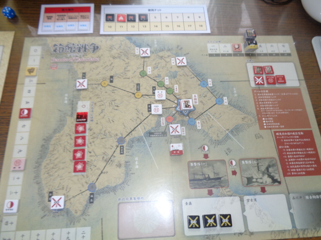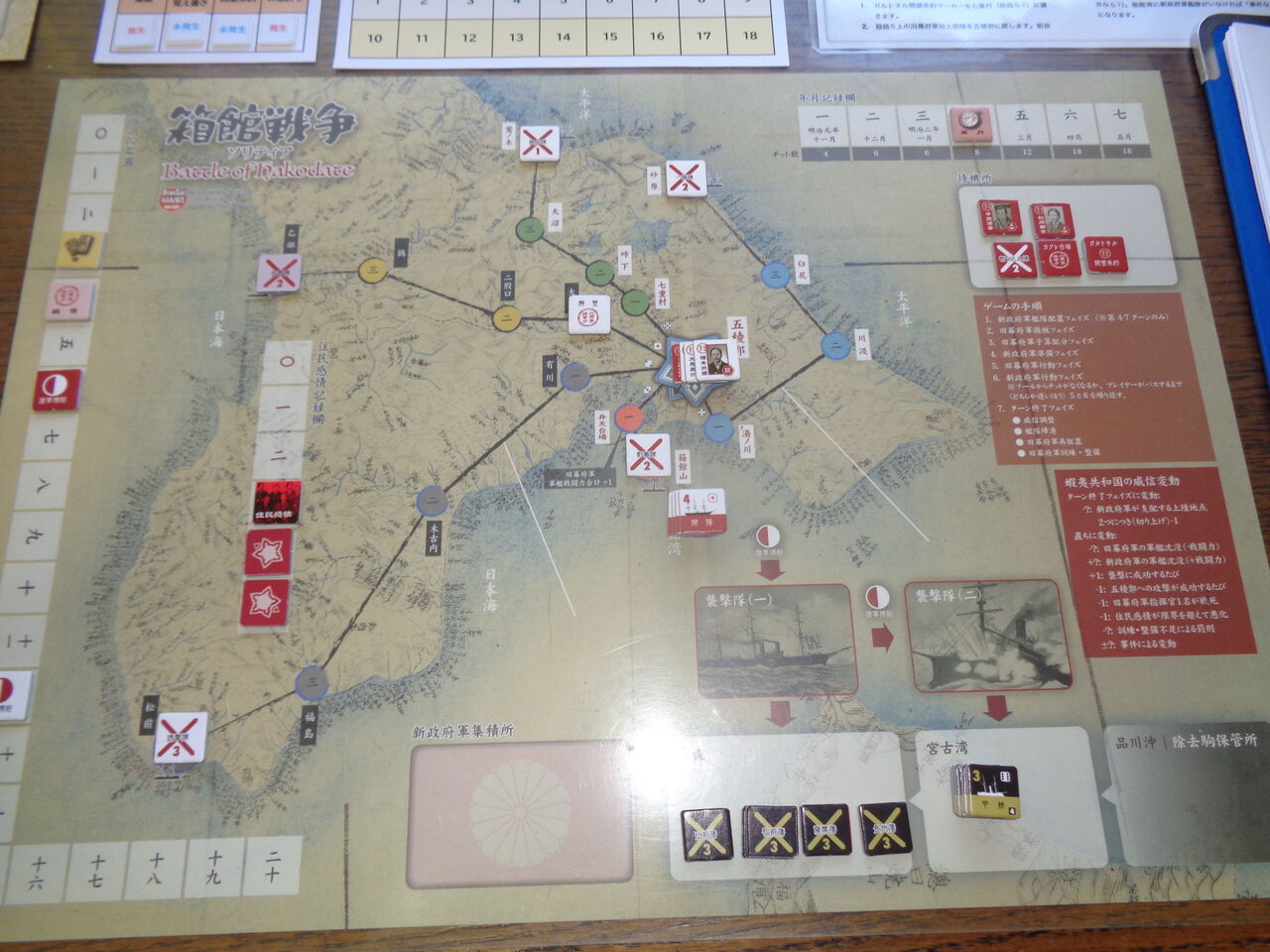 展開は、第3ターンまでに旧幕府軍が松前藩を追い落とし、状況によっては青森・宮古湾に襲撃をかけます。第4ターンには新政府軍艦隊が行動をはじめ、制海権を取った箇所に上陸を行います。第5ターン以降は、新政府軍が12枚を超える圧倒的な枚数の行動チットで、大攻勢をかけ、旧幕府軍は遅かれ早かれ五稜郭の戦いに。旧幕府軍はなんとか、この攻撃を耐え凌ぎ、機を見て敵軍を海に追い落とし、威信を守り切れば、勝利となります。