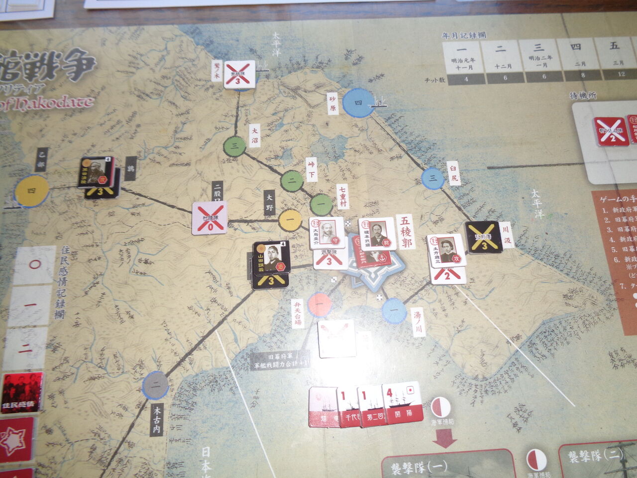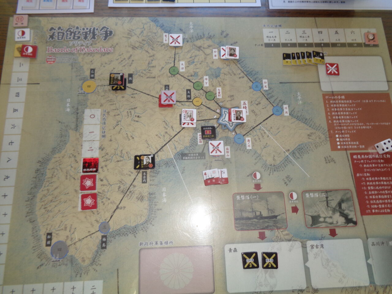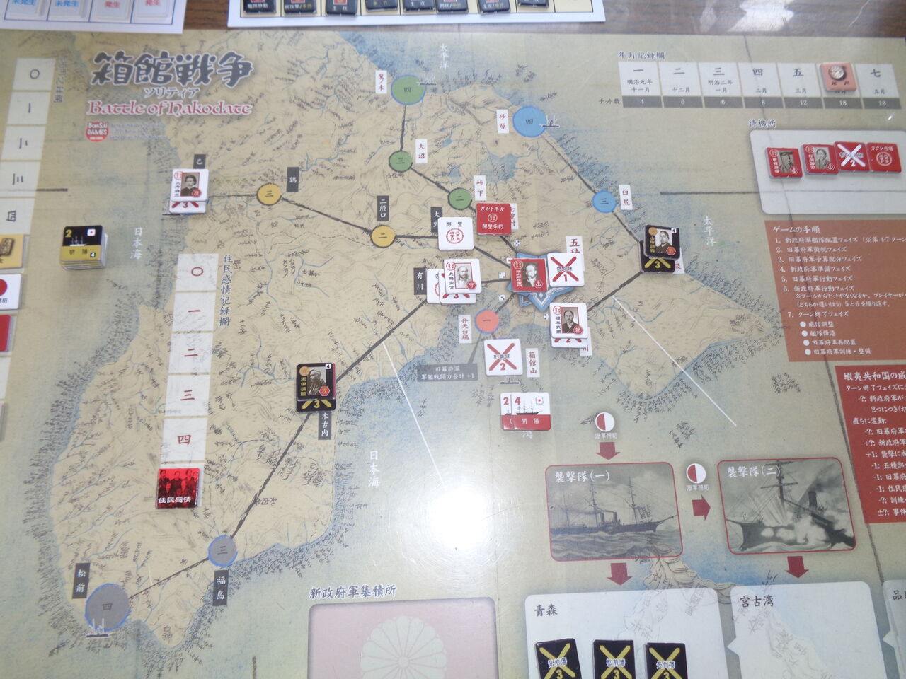 しかしながら、勝利条件は、史実同様に困難極まるレベルになっています。敵が2カ所の上陸地点を抑えれるごとに威信-1、軍艦が沈めばその戦闘力分の威信が低下、さらに五稜郭への攻撃や艦砲射撃、イベントで一方的に威信が低下することも。もとより威信は10しかなく、めったに上昇は期待できないので、最終ターンには押し切られることがほとんどです。