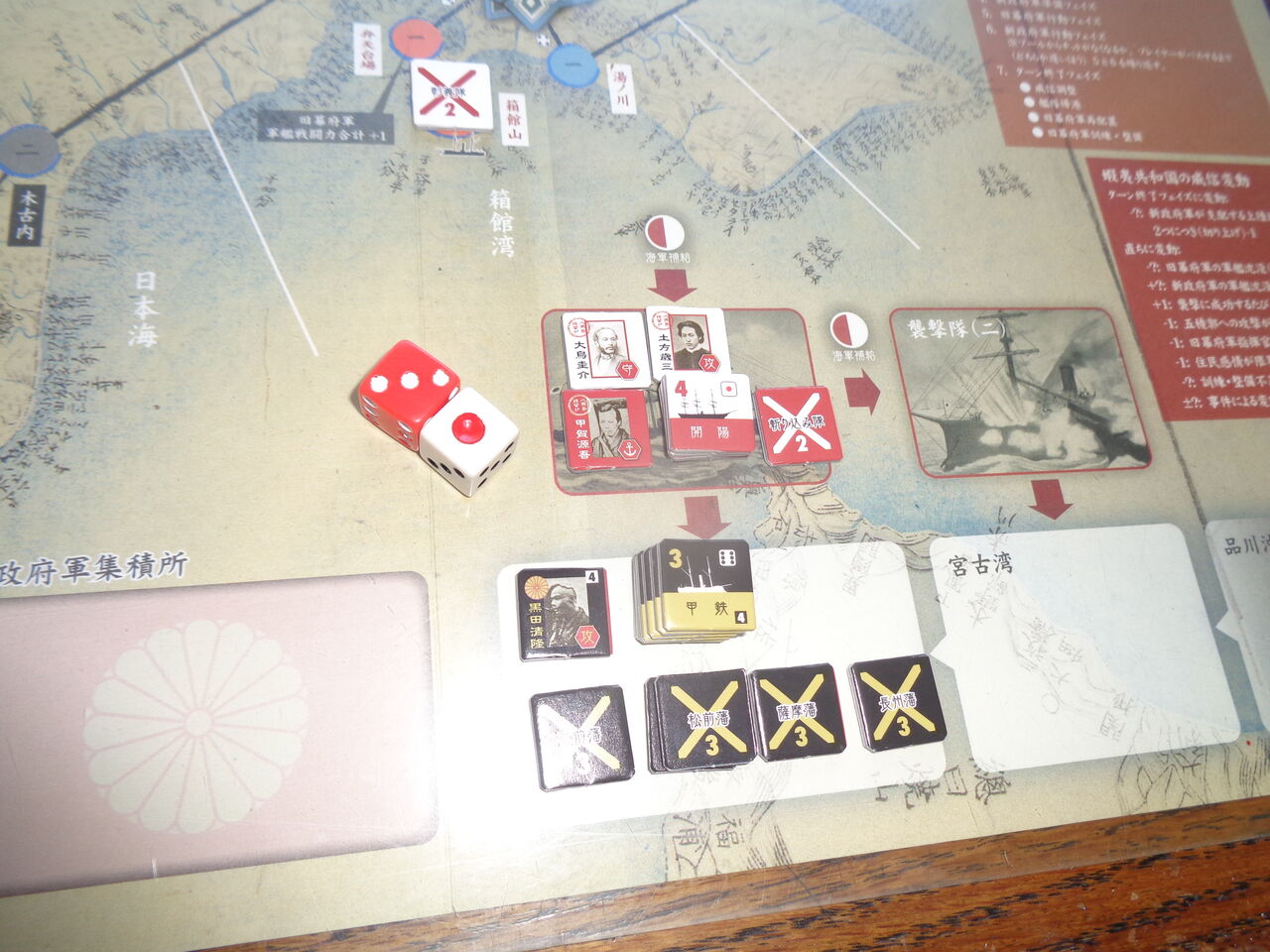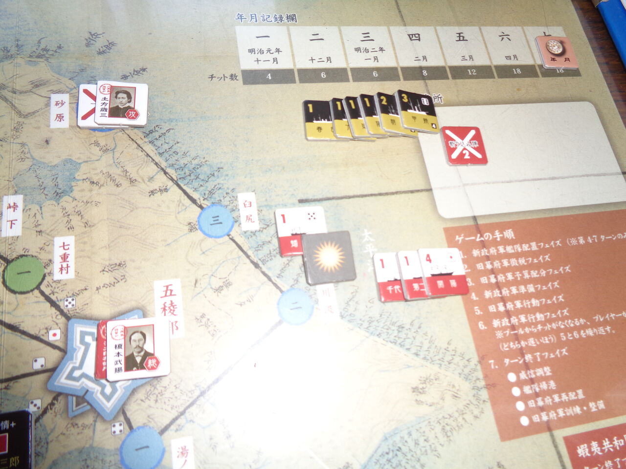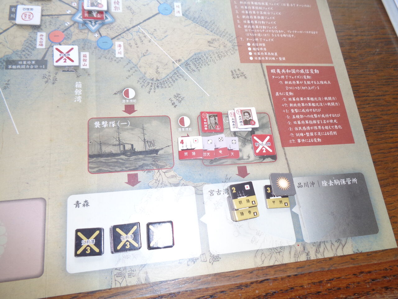 しかしながら、勝利条件は、史実同様に困難極まるレベルになっています。敵が2カ所の上陸地点を抑えれるごとに威信-1、軍艦が沈めばその戦闘力分の威信が低下、さらに五稜郭への攻撃や艦砲射撃、イベントで一方的に威信が低下することも。もとより威信は10しかなく、めったに上昇は期待できないので、最終ターンには押し切られることがほとんどです。