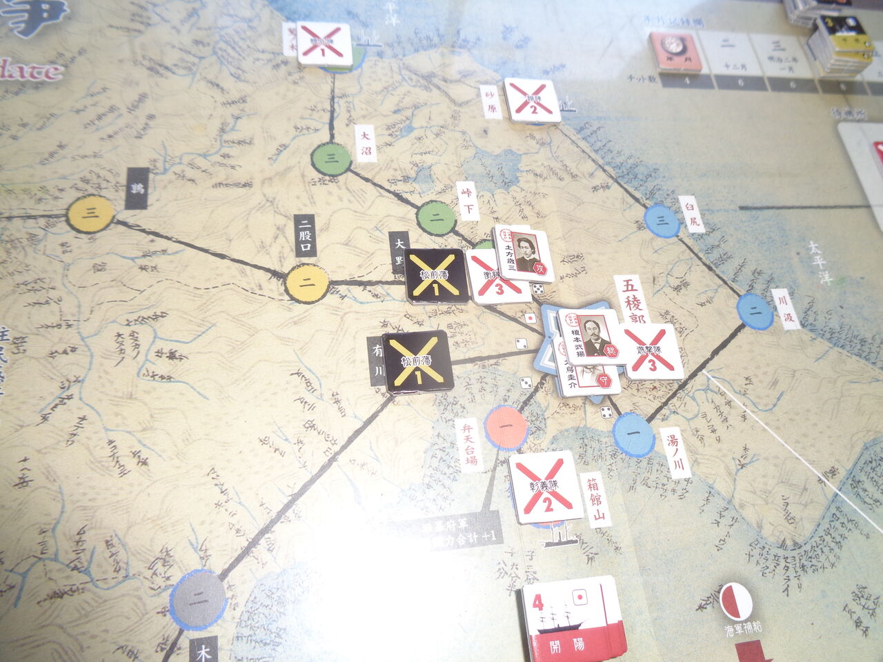 なお、勝つまでやるのがちはら会なので、その後、第5戦目をしたところ・・・ついに、勝ちました!序盤に、松岡・甲賀・澤がきて、さらに胸壁と四稜郭も完成。悪天候で千代田形を失ったものの、2回行った外交が奇跡的にともに成功し、ほぼ万全の体制で新政府軍を迎え撃ちます。