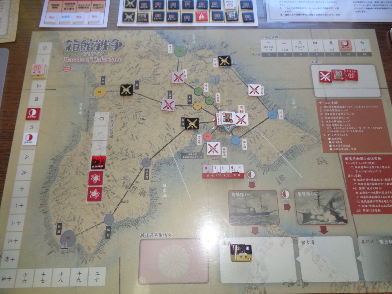 第4ターン、いよいよ、新政府軍の反攻が始まります。品川沖に集結した甲鉄をはじめとする新政府軍艦隊は、宮古湾へ。その後の事件では、アルビヨン号が立ち寄ったものの、新政府軍チットと2枚が追加されるバッドdrに(2/3の確率で、旧幕府軍に資するはずだったのですが)。また、蝦夷地に潜伏する新政府軍の遊軍隊が暗躍し、旧幕府軍の1部隊を消耗させます。最後に、ガルトネル開墾条約を求めてプロイセンが来ましたが、この状況では得策ではないと、旧幕府軍はこれを断ります。