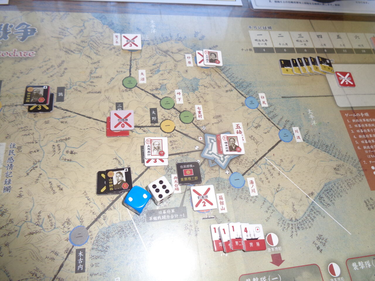 戦闘は通常の陸戦の他に、海戦、襲撃(青森強襲や宮古湾海戦)ができ、その分、ルールが詳細に。この中では、陸戦が最も簡単な部類です。