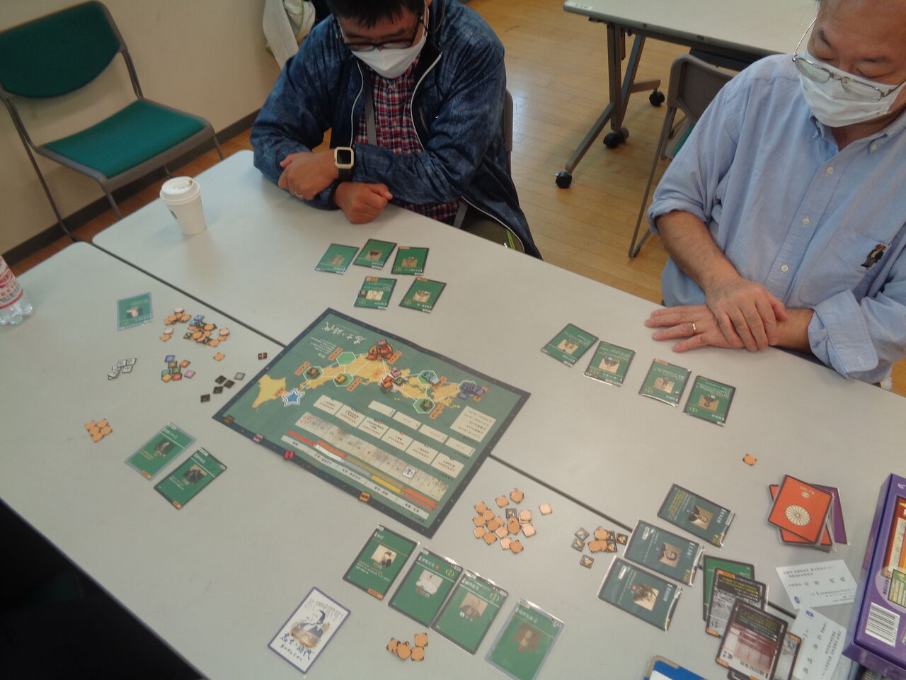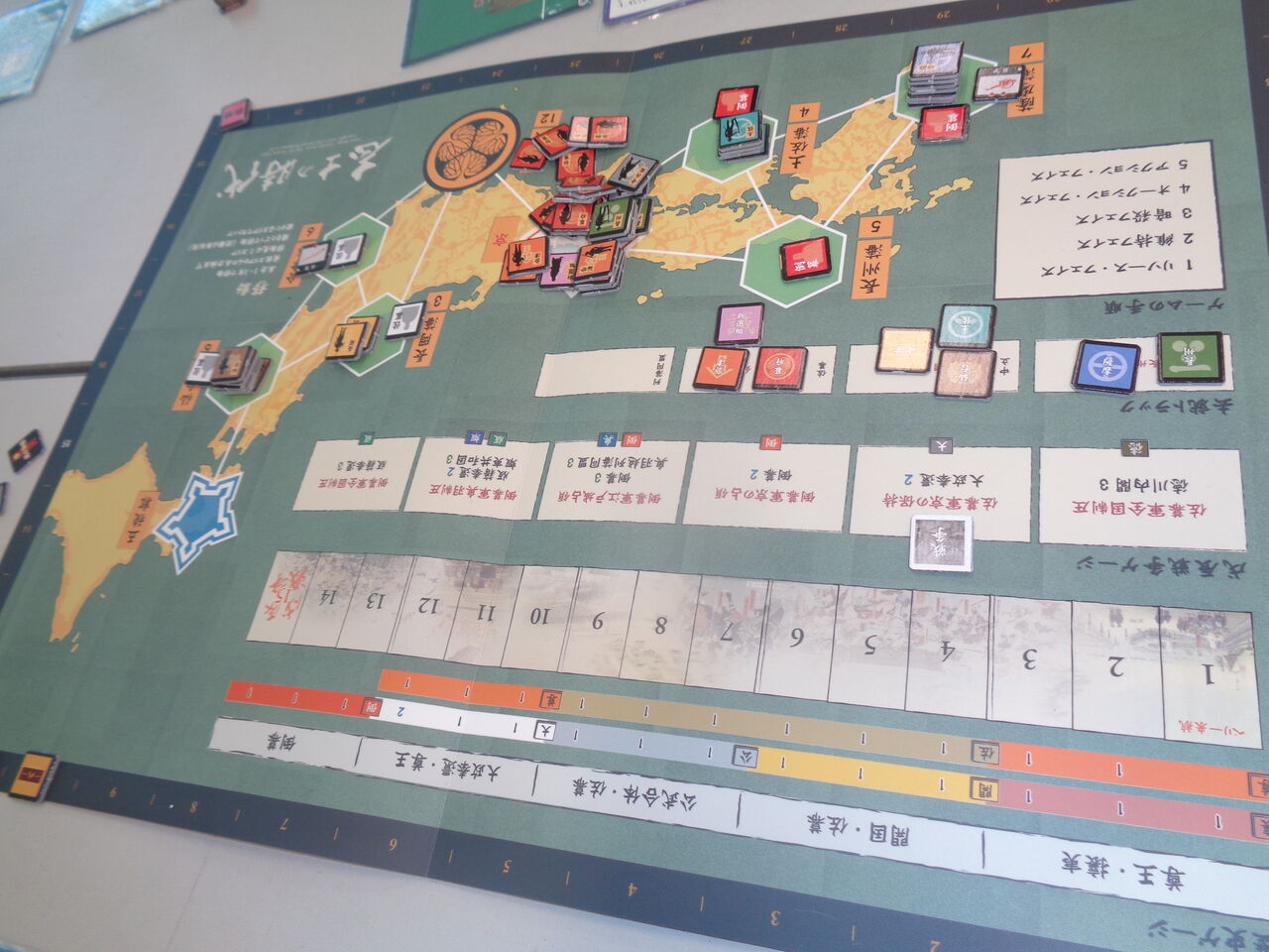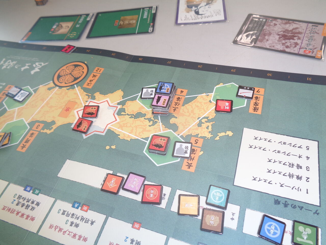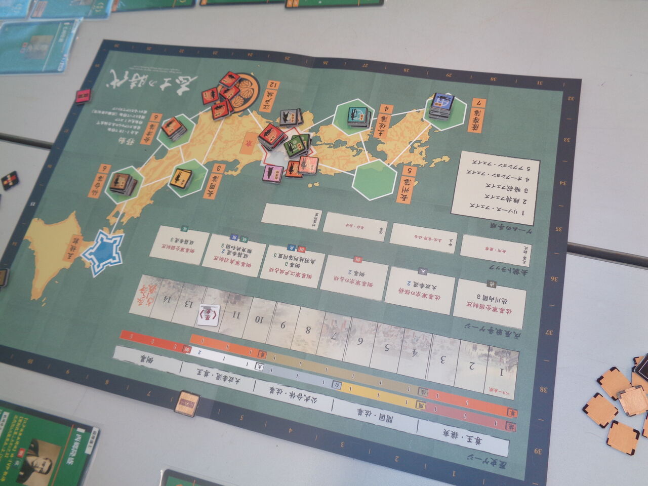 この日の緒戦は、再販なったばかりの「志士の時代」(CMJ)です。カードプレイを主体にした佐幕派と倒幕派の駆け引きのマルチです。ただし、プレイヤーはどちらかの陣営の固定でなく、両派の主要人物カードを戦略を考えながら競り落とし、歴史上で影響力を発揮することを目指します。主要人物カードのビットには、史実を元にしたボーナスが付くので、ある陣営は長州藩中心だったり、ある陣営は幕府だったりします。が、競り状況によっては両派の人物が揃う(揃えるざるをえない)こともありえます。
